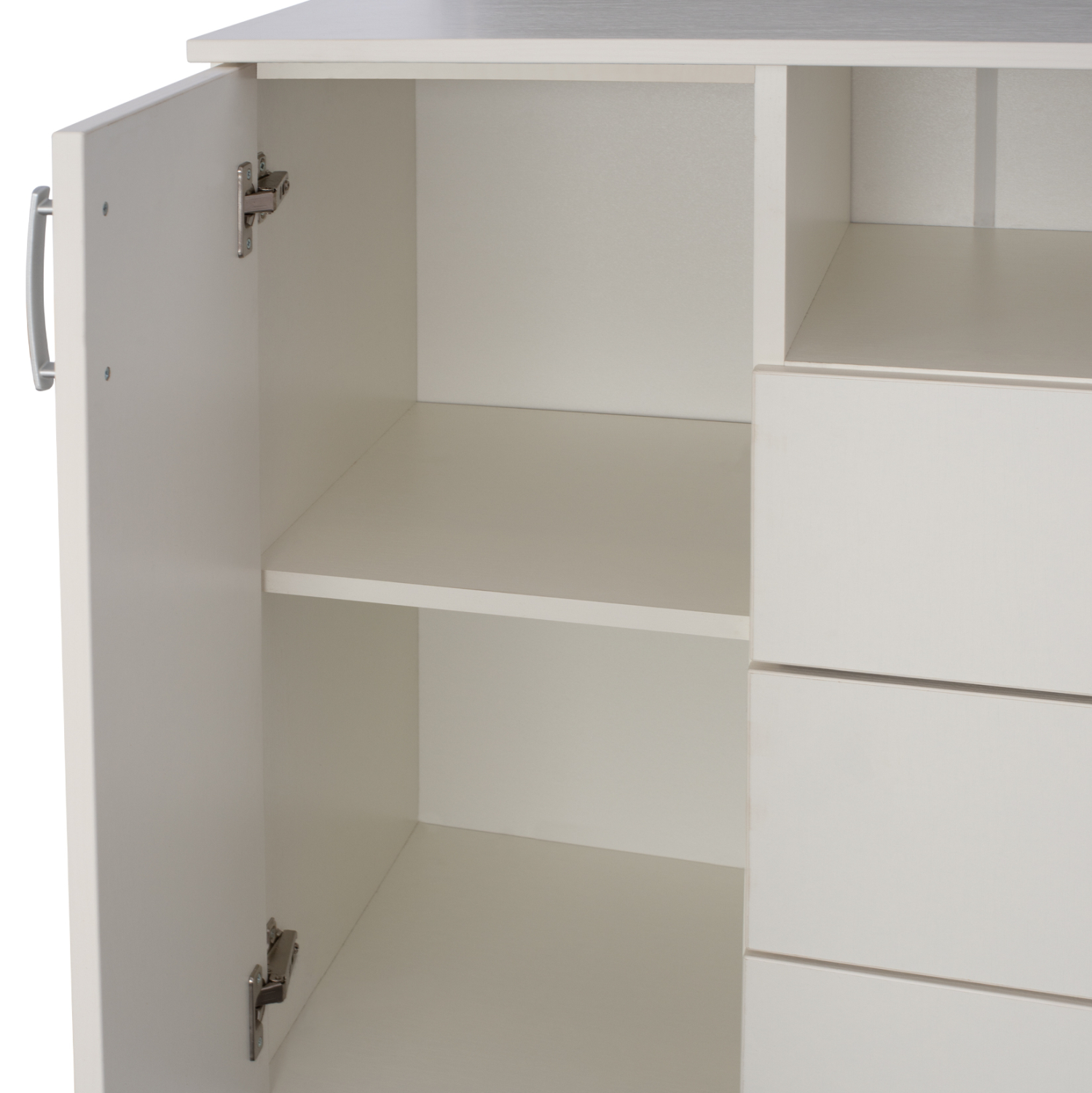 Διαθέτει τρία συρτάρια, δύο ντουλάπια και μία ανοικτή επιφάνεια, για να αποθηκεύετε μικρά αντικείμενα.