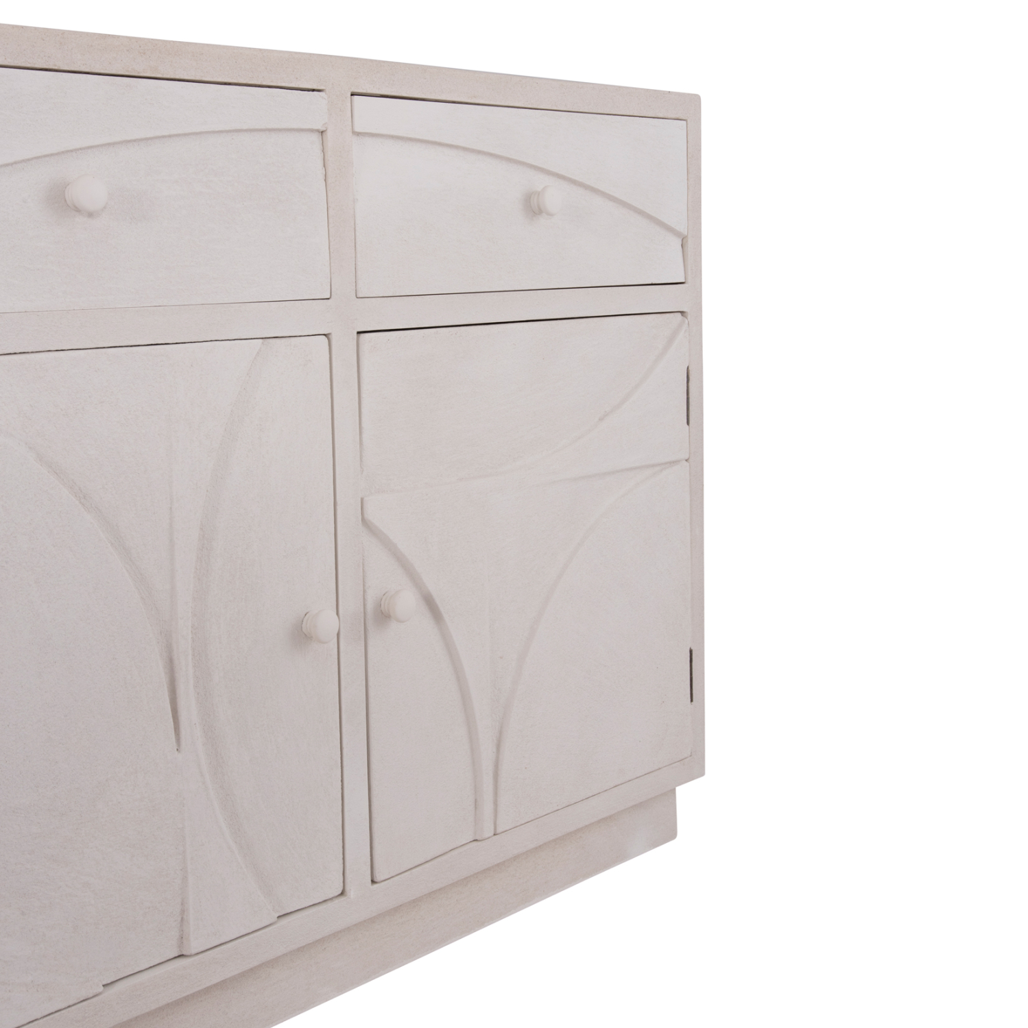 Ο χειροποίητος μπουφές αυτός είναι εξολοκλήρου κατασκευασμένος από MDF σε ΥΠΟΛΕΥΚΟ χρώμα με υφή σαγρέ τσιμέντου, που αποτελεί την πιο σύγχρονη τάση στον τομέα του interior design. Διαθέτει 2 συρτάρια στο επάνω μέρος και αποθηκευτικό χώρο από κάτω που κλείνει με δύο πόρτες. Ξεχωρίζει για τα ανάγλυφα σκαλιστά σχέδια, που του δίνουν μια άλλη “οπτική”. Τι είναι όμως ο μπουφές;