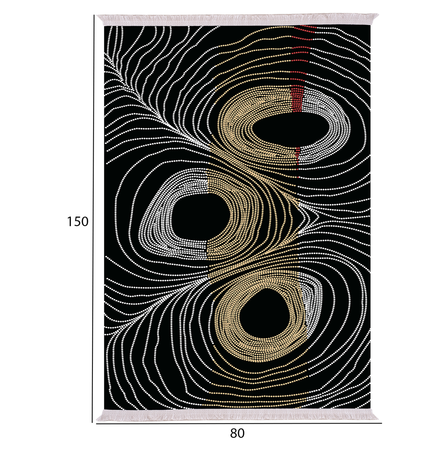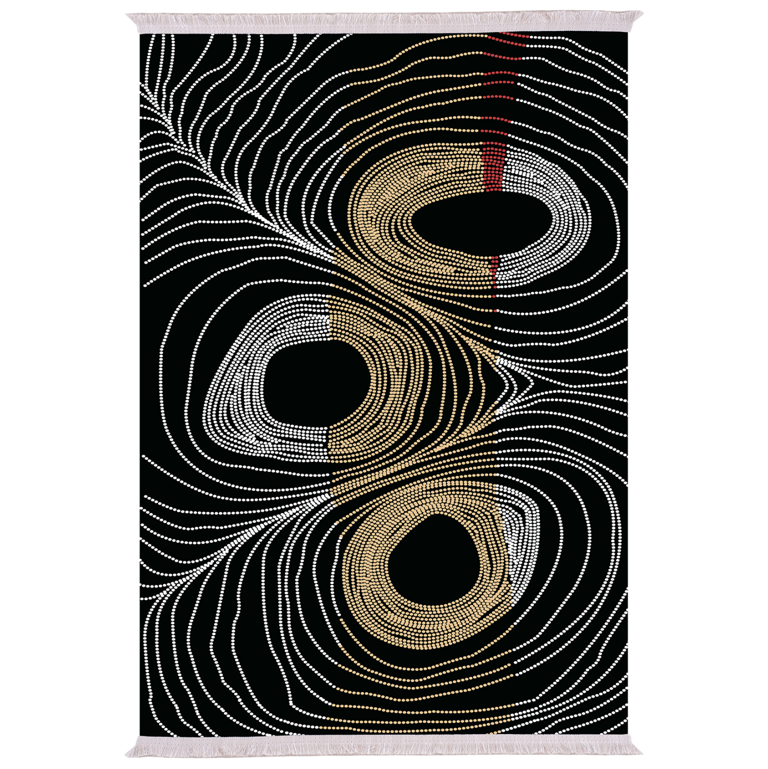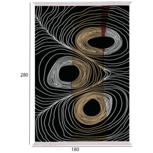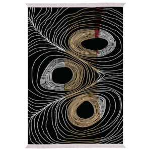 Το συγκεκριμένο χαλί είναι μοντέρνο από όποια οπτική κι αν το δεις. Έχει κυρίαρχα χρώματα το γκρι, και το χρυσό επάνω σε ολόμαυρο φόντο σε όλη την επιφάνεια του χαλιού. Το έντονο χαρακτηριστικό του είναι 3 ακανόνιστοι κύκλοι που μπορούν να ερμηνευθούν όπως το αντιλαμβάνεται ο καθένας. Γι’ αυτό και δίνει την αίσθηση της κίνησης στον χώρο και φυσικά θα προκαλέσει το ενδιαφέρον με την ιδιαίτερη λεπτομέρεια και την περίεργη ασυμμετρία των γραμμών του. Σίγουρα θα αναβαθμίσει αισθητικά το σαλόνι σας.