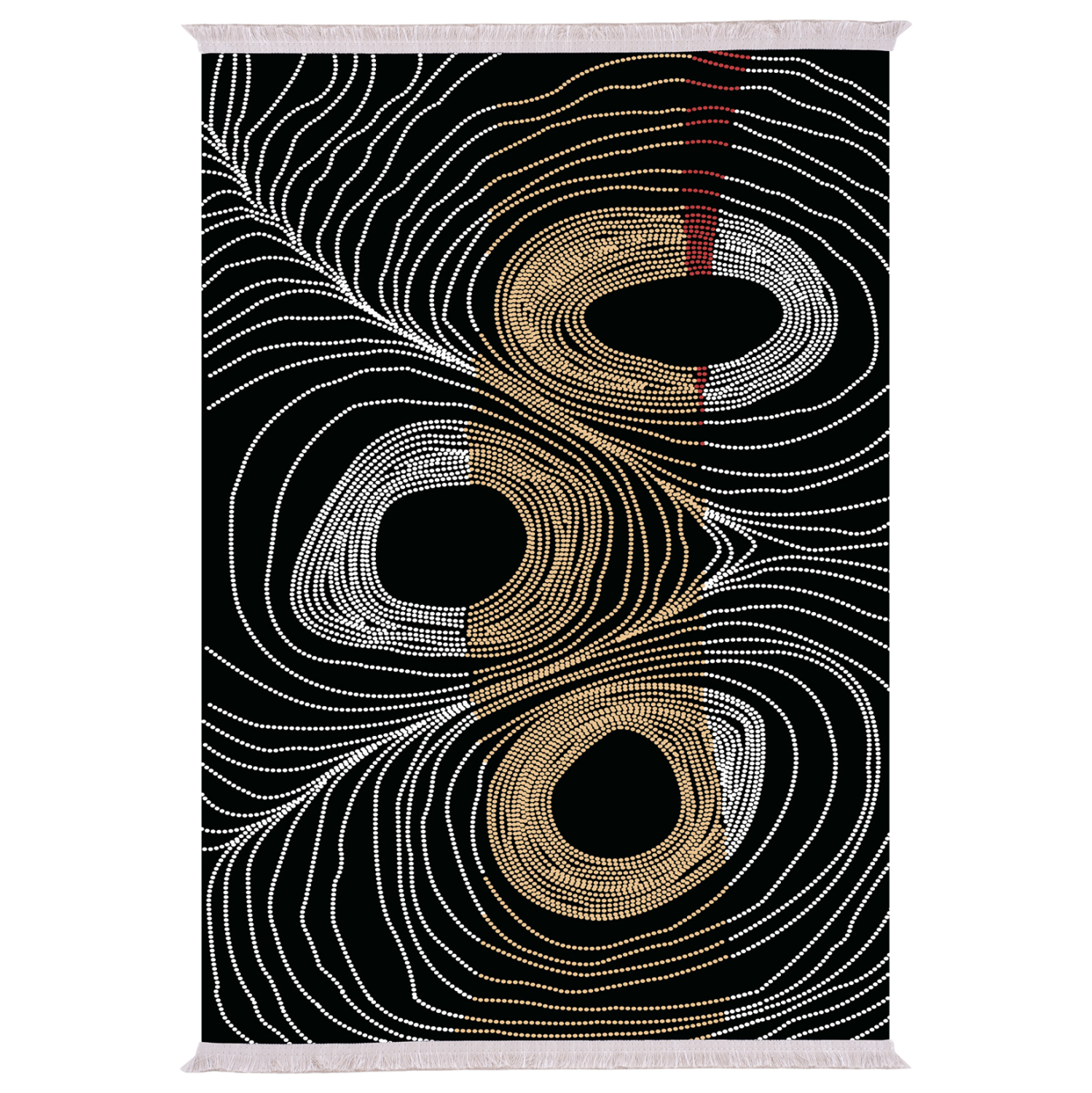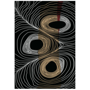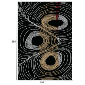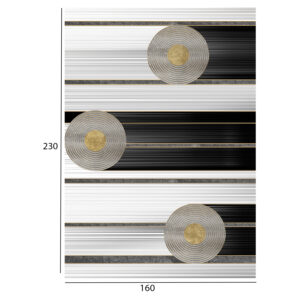 Το συγκεκριμένο χαλί με κρόσια είναι μοντέρνο από όποια οπτική κι αν το δεις. Έχει κυρίαρχα χρώματα το γκρι, και το χρυσό επάνω σε ολόμαυρο φόντο σε όλη την επιφάνεια του χαλιού. Το έντονο χαρακτηριστικό του είναι 3 ακανόνιστοι κύκλοι που μπορούν να ερμηνευθούν όπως το αντιλαμβάνεται ο καθένας. Γι’ αυτό και δίνει την αίσθηση της κίνησης στον χώρο και φυσικά θα προκαλέσει το ενδιαφέρον με την ιδιαίτερη λεπτομέρεια και την περίεργη ασυμμετρία των γραμμών του. Σίγουρα θα αναβαθμίσει αισθητικά το σαλόνι σας.