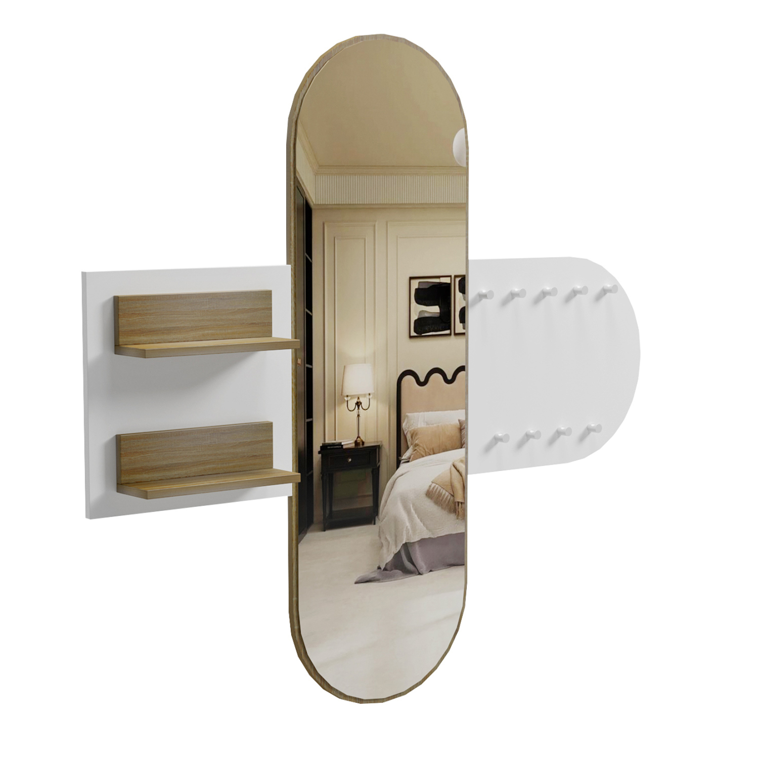 Η κρεμάστρα εισόδου με καθρέφτη CHERYL διαθέτει 9 κρεμάστρες ως βεστιάριο στην μια πλευρά του οβάλ καθρέφτη, και 2 ραφάκια σε χρώμα SONAMA στην άλλη πλευρά. Όλο το έπιπλο είναι από μελαμίνη σε ΛΕΥΚΟ.