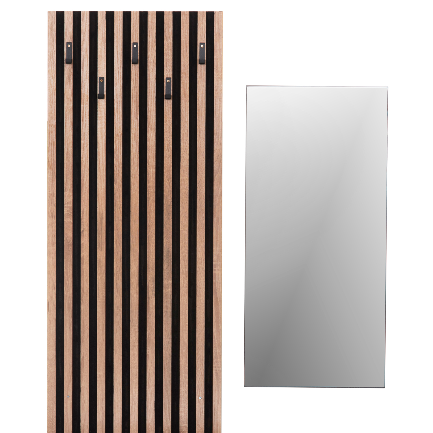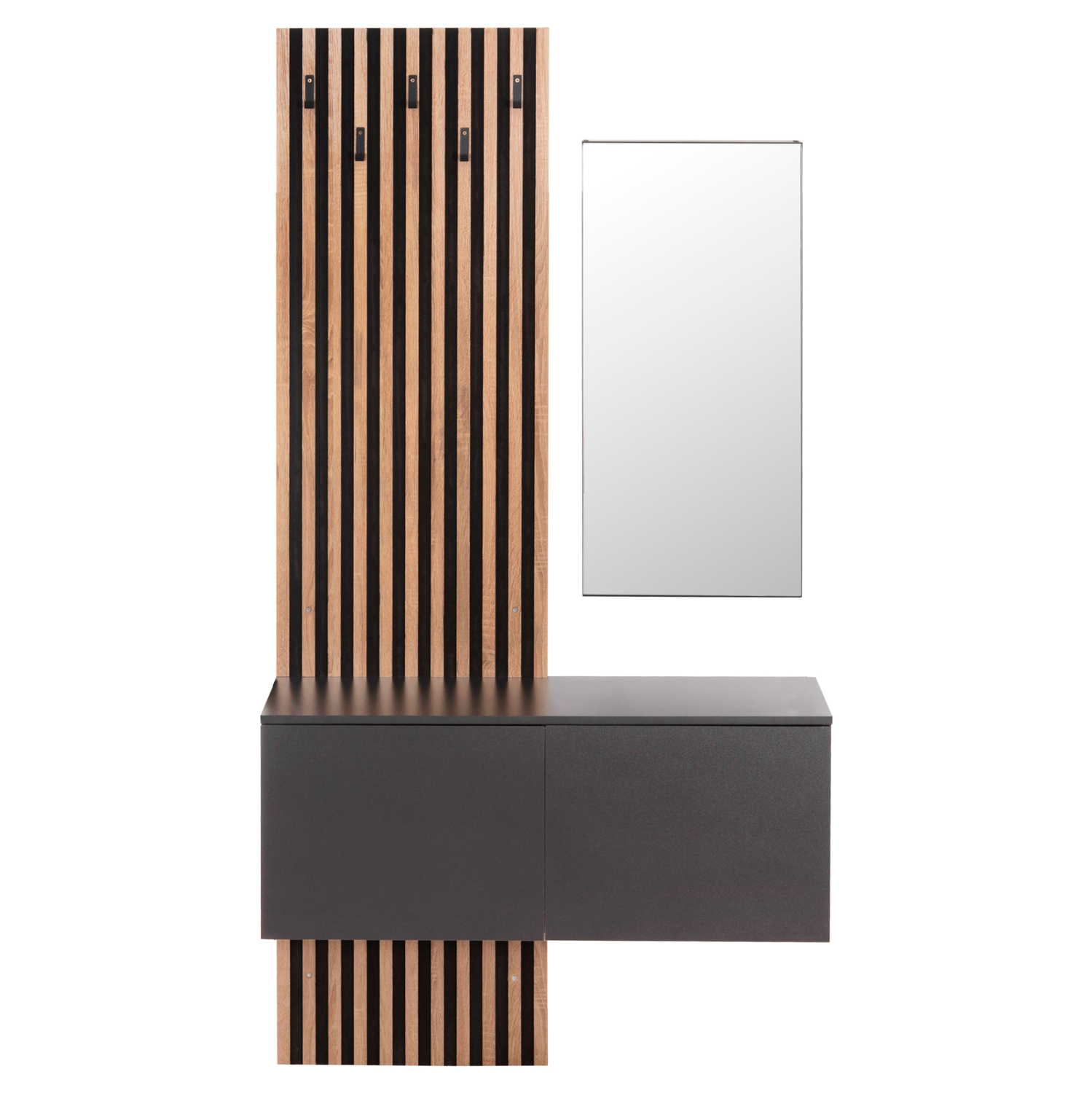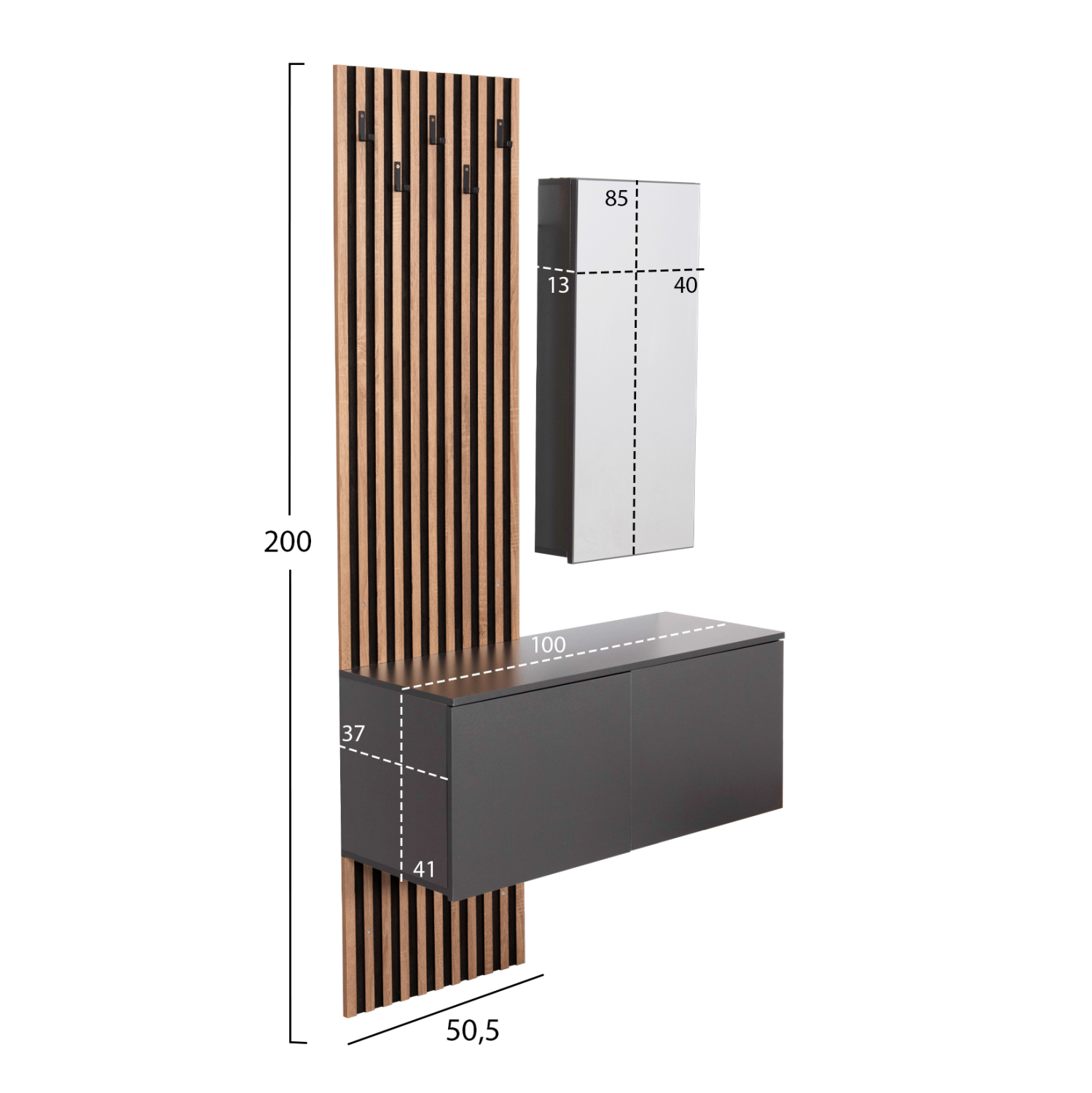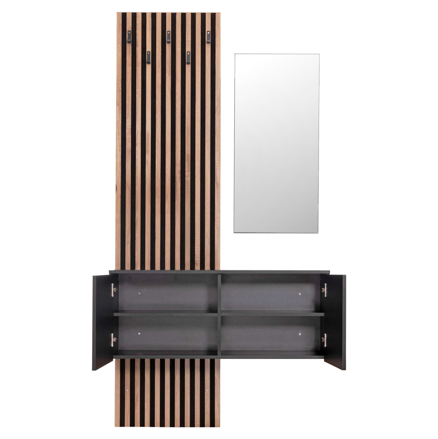 Το έπιπλο εισόδου MYLES αποτελείται από μια μακρόστενη ψηλή «πλάτη» με 5 μονές κρεμάστρες στην μία πλευρά, ενώ στην άλλη υπάρχει ένα επιτοίχιο ντουλάπι με ένα ράφι στο εσωτερικό που κλείνει με πόρτα/καθρέπτη. Η σύνθεση αυτή ολοκληρώνεται με μια επίσης επιτοίχια (κρεμαστή)παπουτσοθήκη-ντουλάπι με δύο πόρτες, χωρισμένη σε 4 χώρους. Ένα σετ μελαμίνης σε χρώμα SONAMA-ΓΚΡΙ που θα σας ενθουσιάσει με την πρακτικότητα αλλά και το στυλ του.