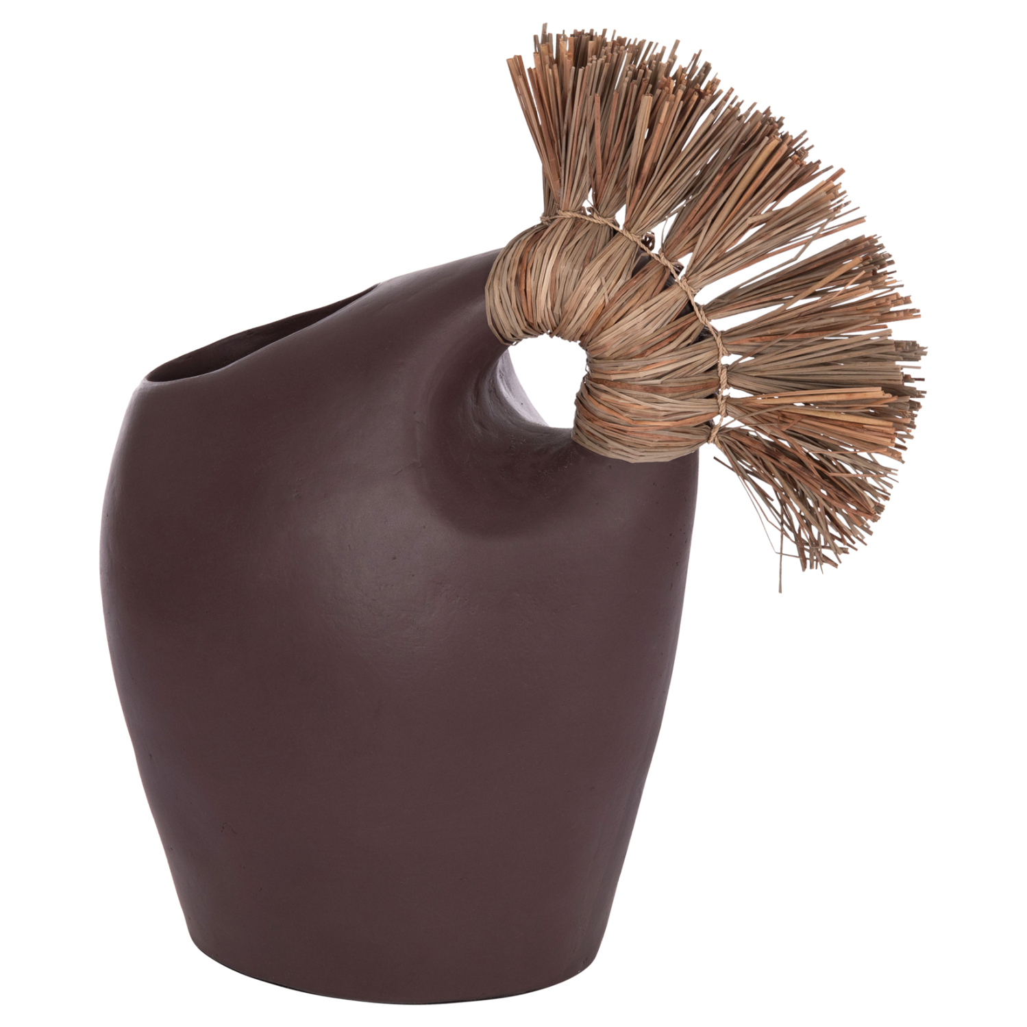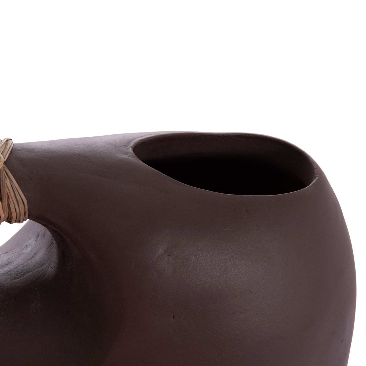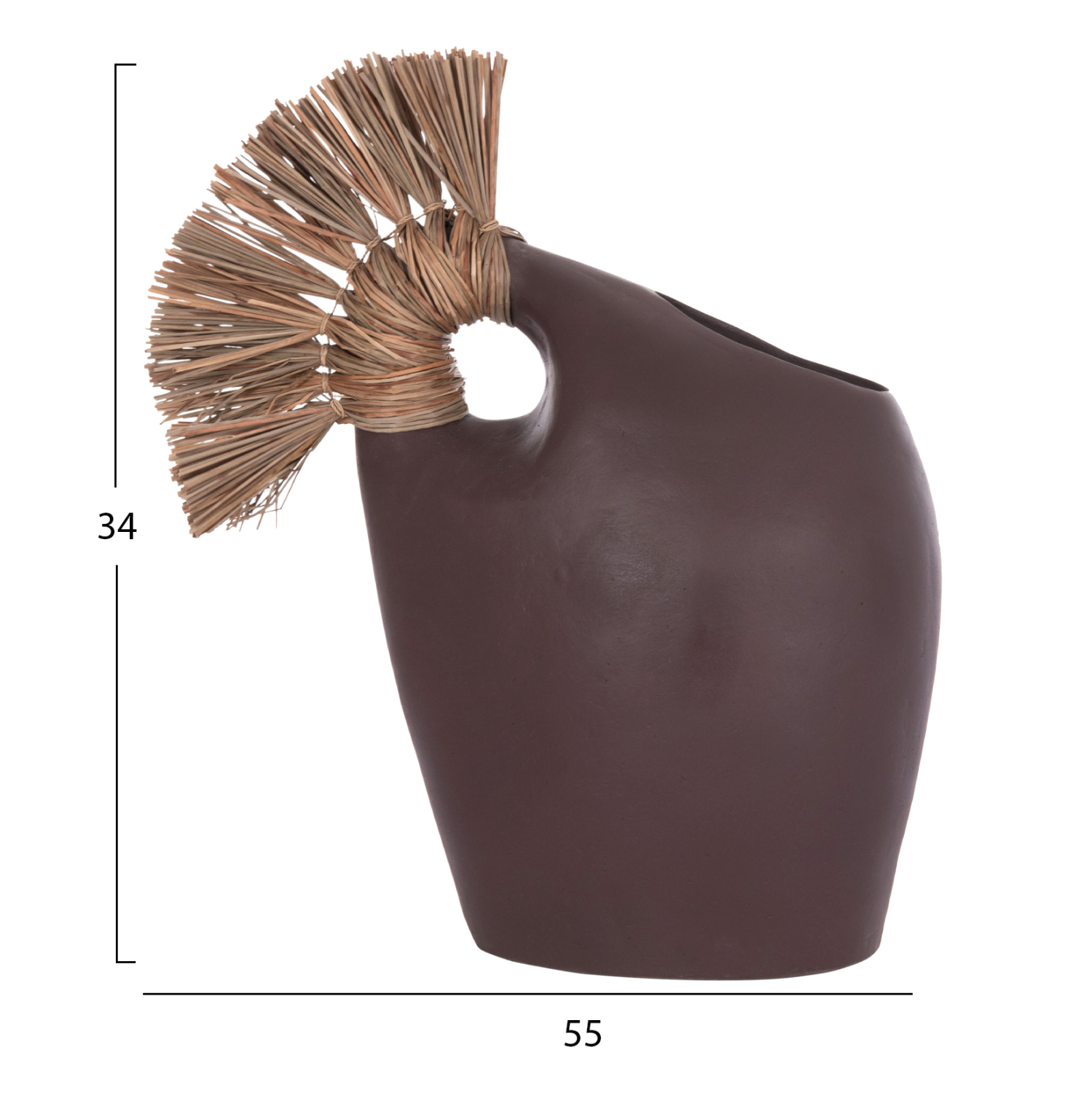 Το επιτραπέζιο χειροποίητο διακοσμητικό βάζο ALICA2 είναι ένα πολύ ιδιαίτερο διακοσμητικό στοιχείο για κάθε χώρο. Είναι κατασκευασμένο εξολοκλήρου από τερακότα σε ΣΟΚΟΛΑΤΙ χρώμα, ενώ διαθέτει και ένα χερούλι επενδυμένο με αποξηραμένο grass, και ένα φαρδύ στόμιο.