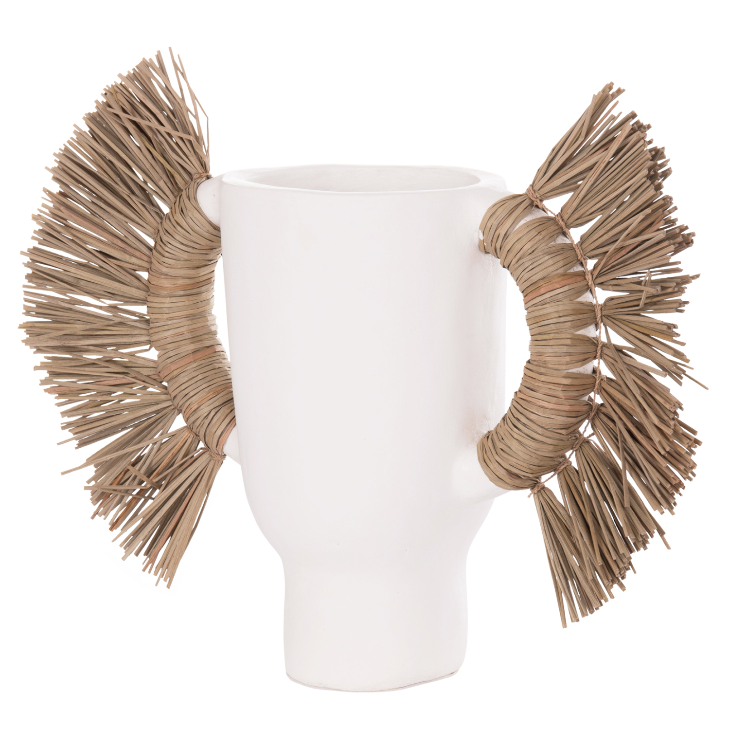 Το επιτραπέζιο χειροποίητο διακοσμητικό βάζο ALICA είναι ένα πολύ ιδιαίτερο διακοσμητικό στοιχείο για κάθε χώρο. Είναι κατασκευασμένο εξολοκλήρου από τερακότα σε ΛΕΥΚΟ χρώμα, ενώ διαθέτει και δύο χερούλια επενδυμένα με αποξηραμένο grass, και ένα σχετικά φαρδύ στόμιο.