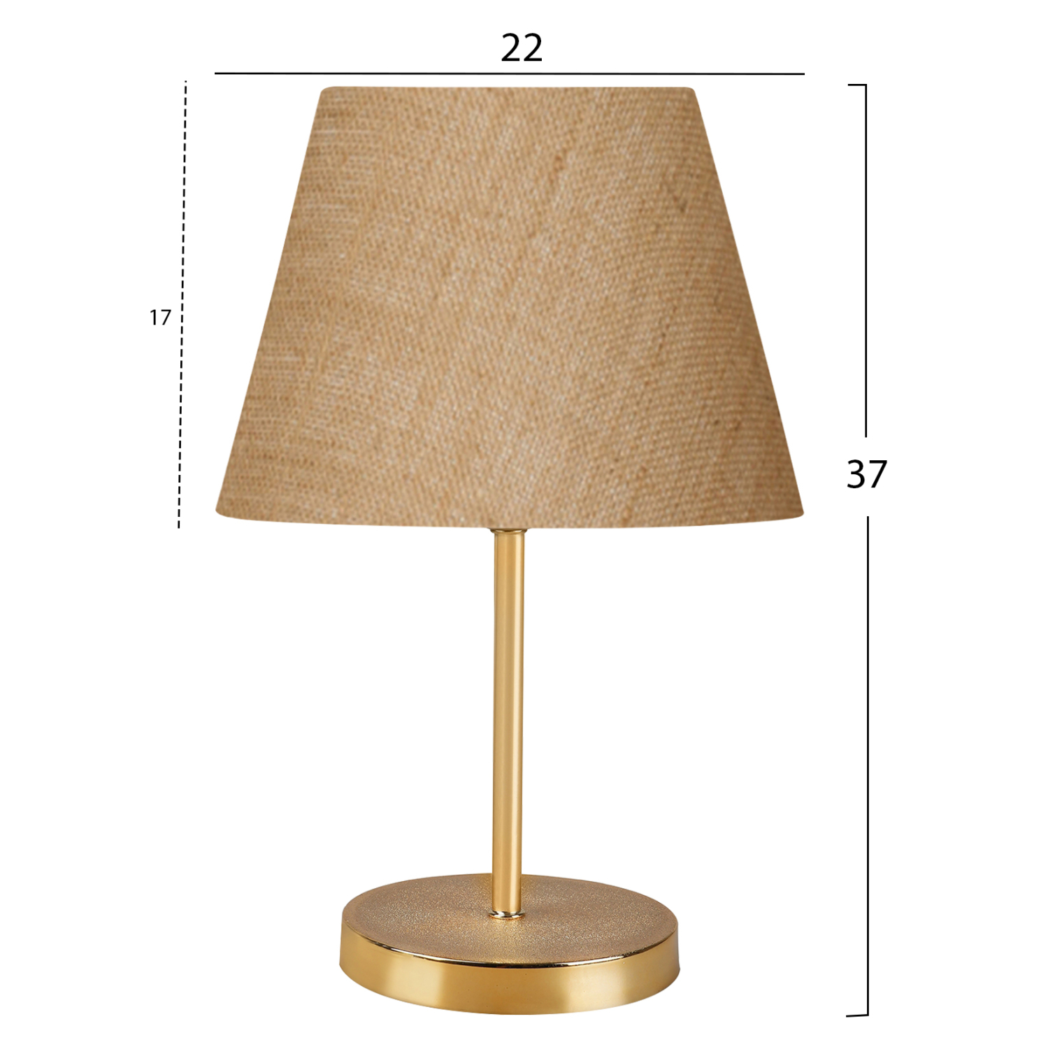 Μοντέρνο επιτραπέζιο φωτιστικό με κυκλική βάση και κολώνα σε χρυσό χρώμα, και μπεζ της άμμου υφασμάτινο τραπεζοειδές καπέλο. Πρόκειται για διακοσμητικό φωτιστικό, σε απλή και λιτή γραμμή. Το φως διαχέεται στον χώρο ευχάριστα και η αντανάκλασή του πάνω στην χρυσή κολωνίτσα του φωτιστικού αλλά και στην χρυσή επιφάνεια της βάσης, παιχνιδίζει ευχάριστα στο μάτι. Αυτού του είδους τα φωτιστικά δεν προορίζονται για φωτιστικά διαβάσματος και αυτό πρέπει πάντα να λαμβάνεται υπόψη κατά την επιλογή τους. Είναι καθαρά διακοσμητικά και το ταίριασμά τους με τον περιβάλλοντα χώρο θα πρέπει να είναι αρμονικό. Αυτό το φωτιστικό είναι κομψό και βολικό σε διαστάσεις παρέχοντας αμέτρητες δυνατότητες «δεσίματος» με την υπόλοιπη διακόσμησή σας. Είναι ένα μικρό έργο τέχνης.