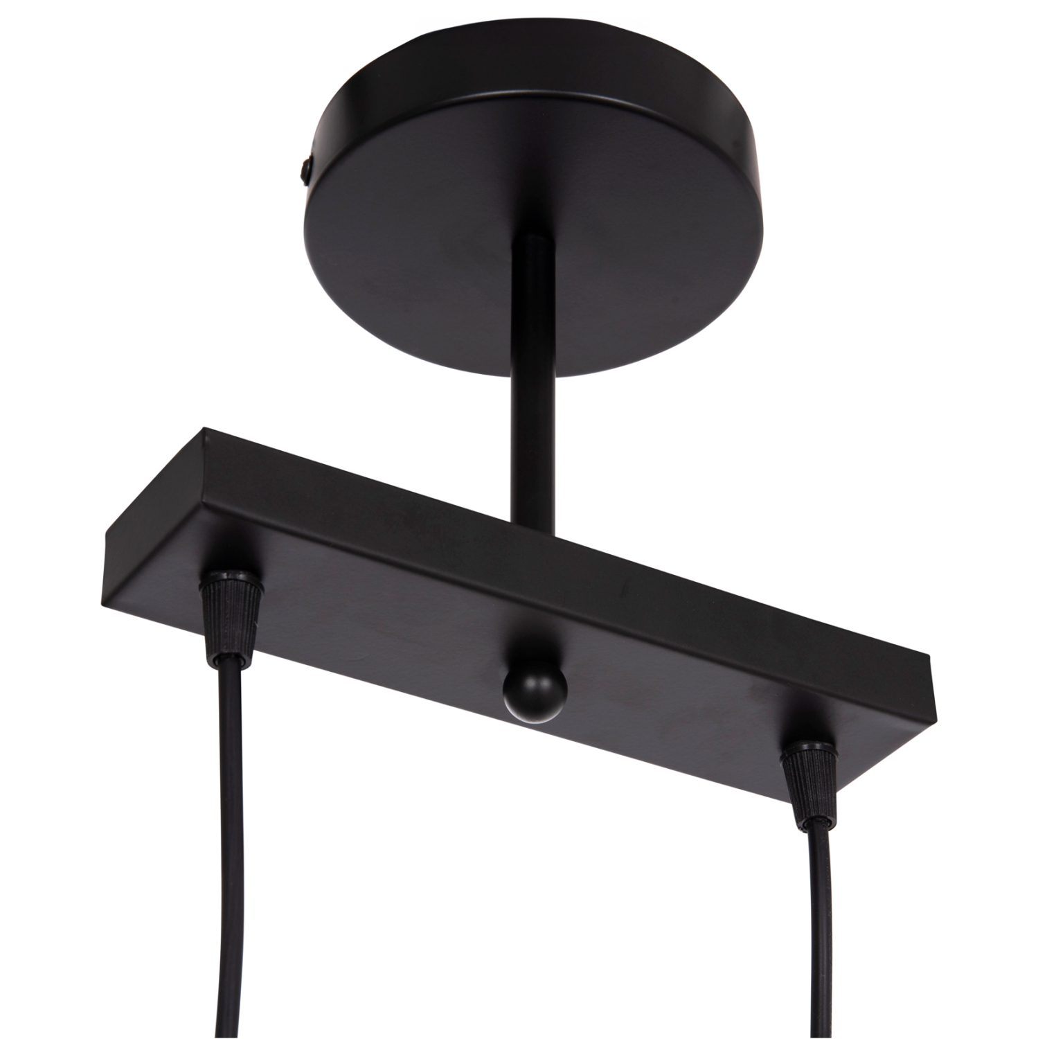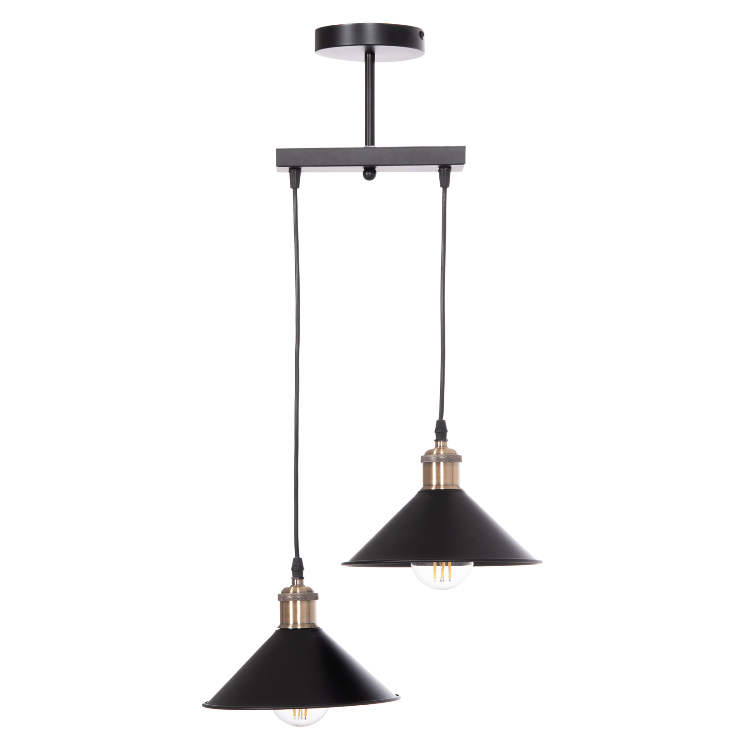 Το κρεμαστό δίφωτο φωτιστικό οροφής BELL είναι ένα όμορφο κρεμαστό με μαύρη βάση και μαύρα καλώδια κρέμασης. Οι λάμπες είναι σε διαφορετικά ύψη και τα καπέλα είναι μεταλλικά με διακριτικές λεπτομέρειες σε ανοιχτό χάλκινο χρώμα στο επάνω μέρος τους.