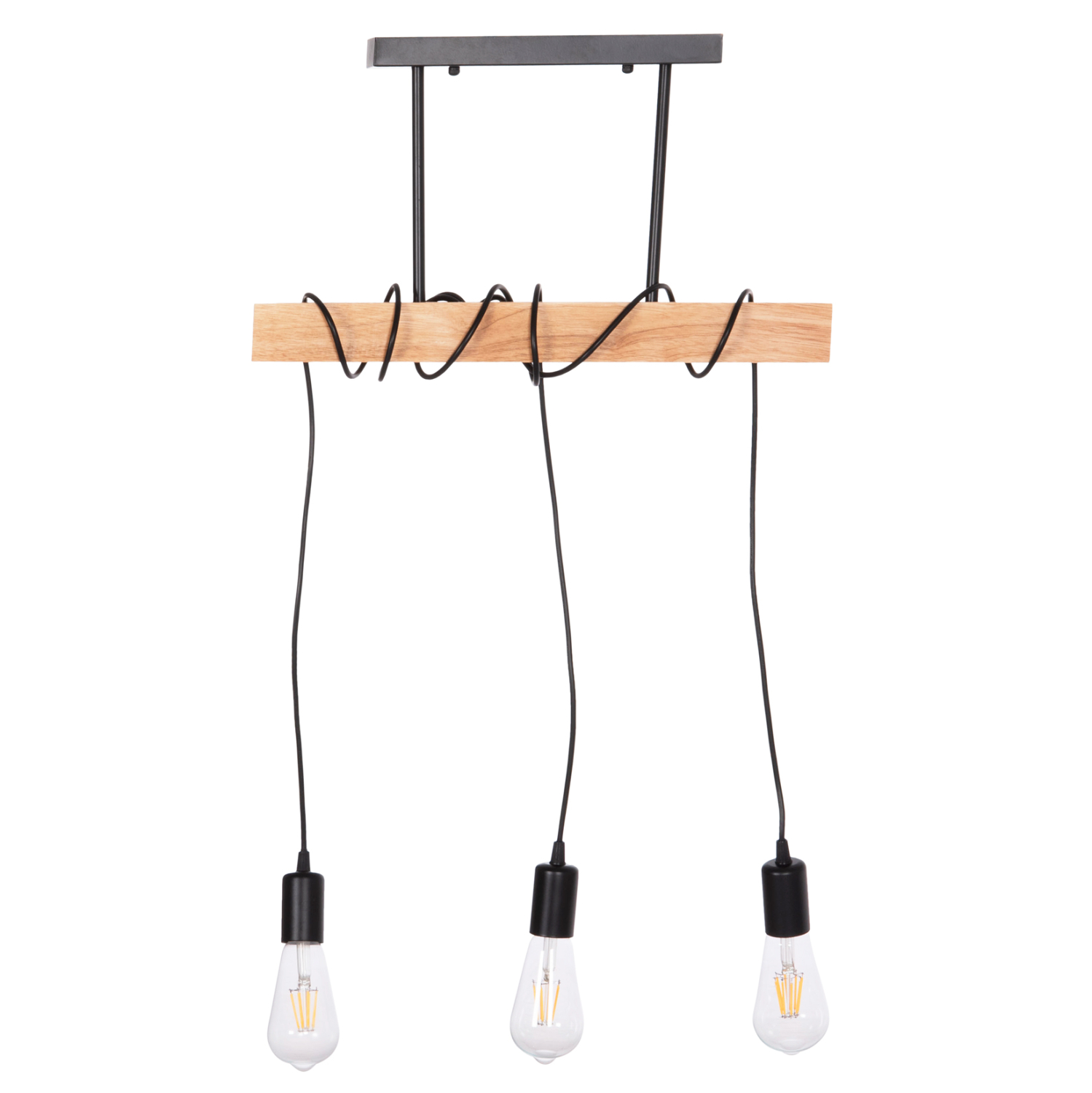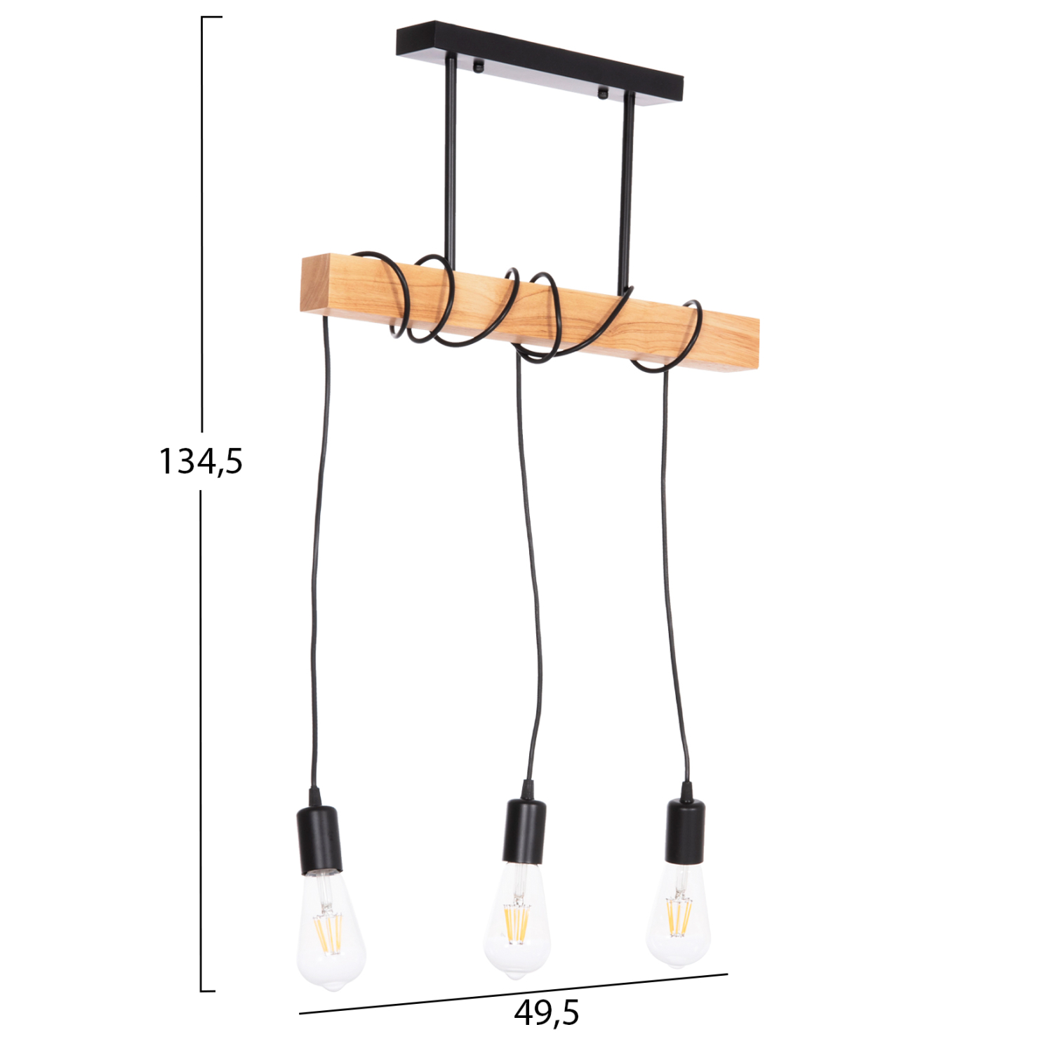 Το κρεμαστό φωτιστικό οροφής VOLKS είναι σε στυλ industrial αλλά και ρουστίκ. Είναι τρίφωτο και οι λάμπες κρέμονται ελεύθερα με τα καλώδιά τους από μια ξύλινη βάση η οποία κρέμεται από την μαύρη μεταλλική βάση της οροφής. Αυτό το φωτιστικό θα φωτίσει με άπλετο φως τον χώρο που θέλετε και θα εντυπωσιάσει με το όμορφο design του.