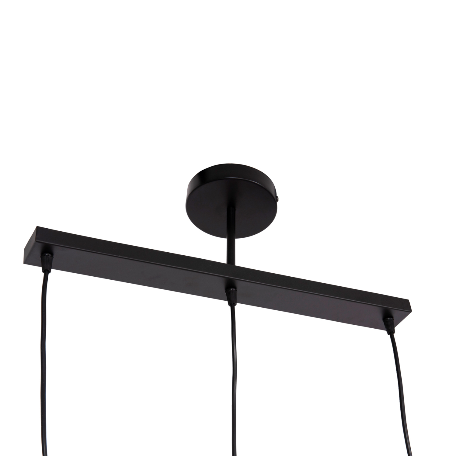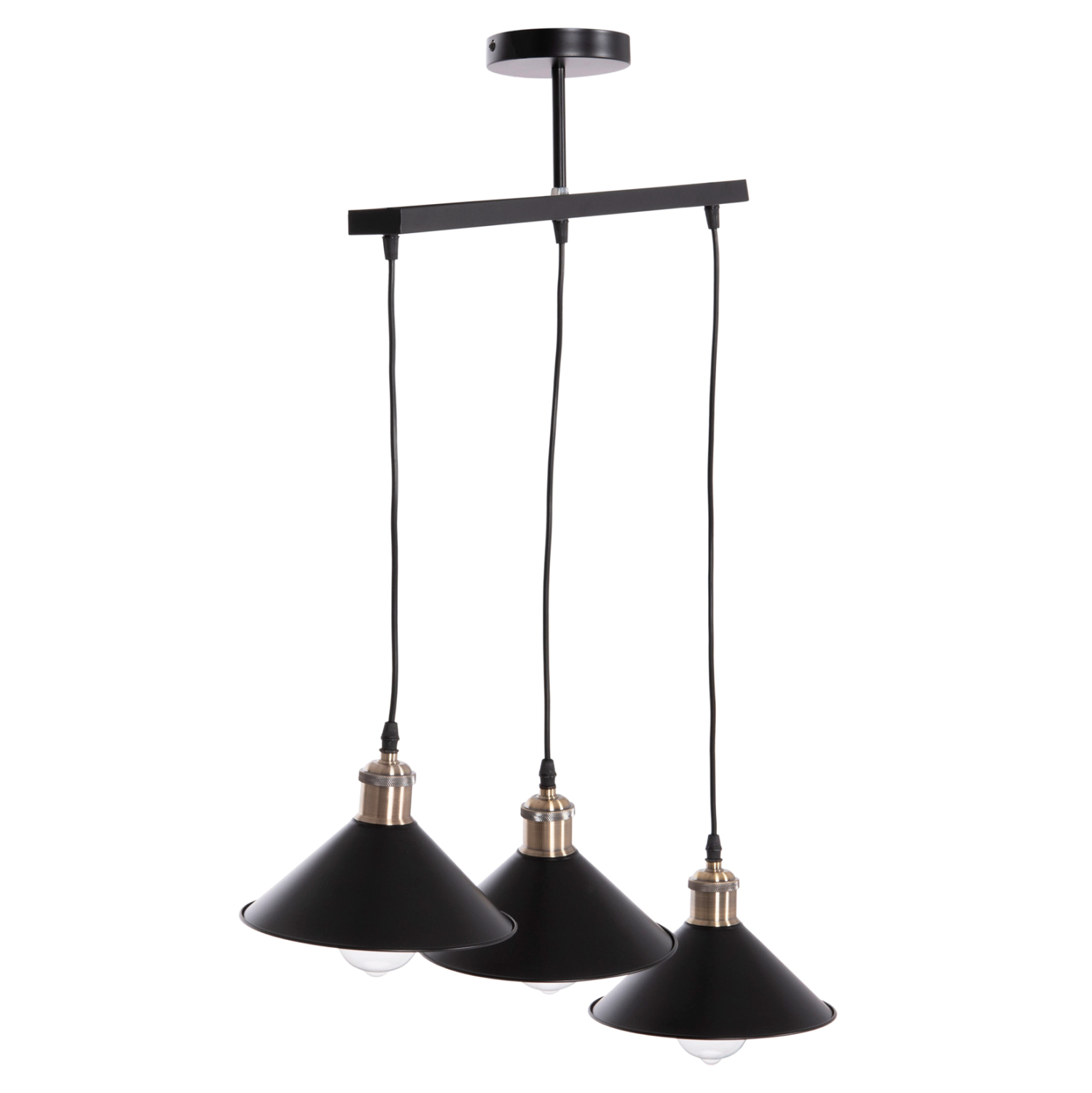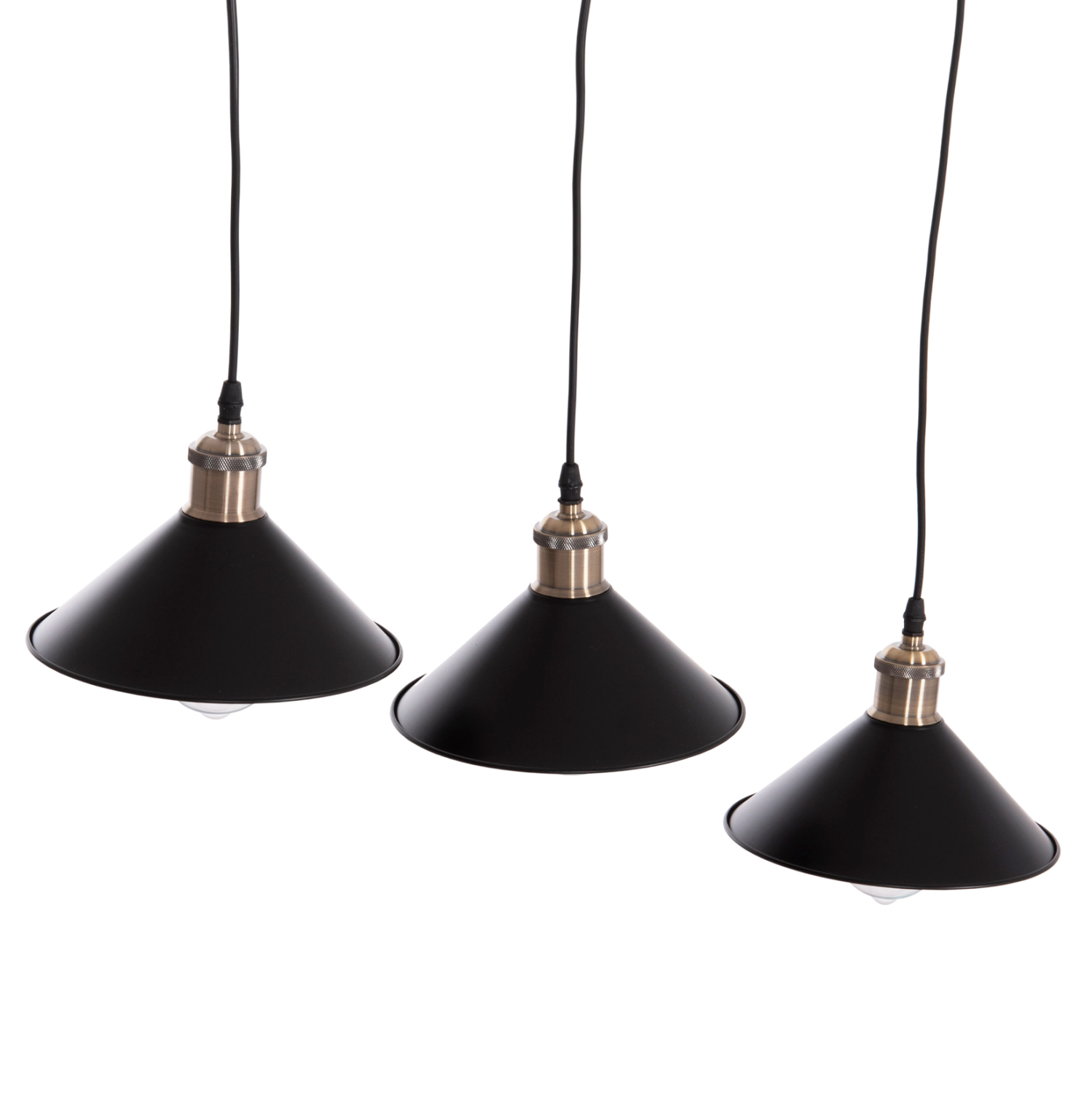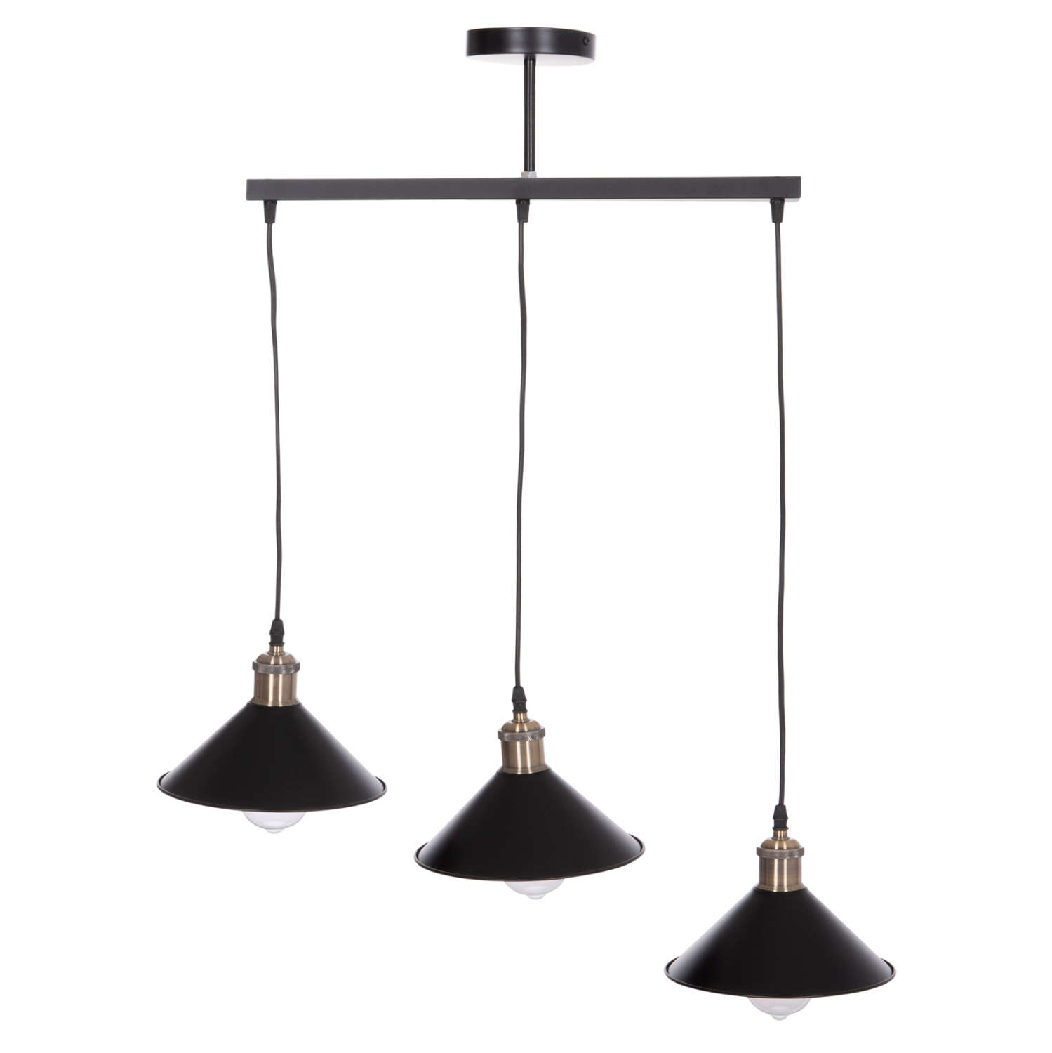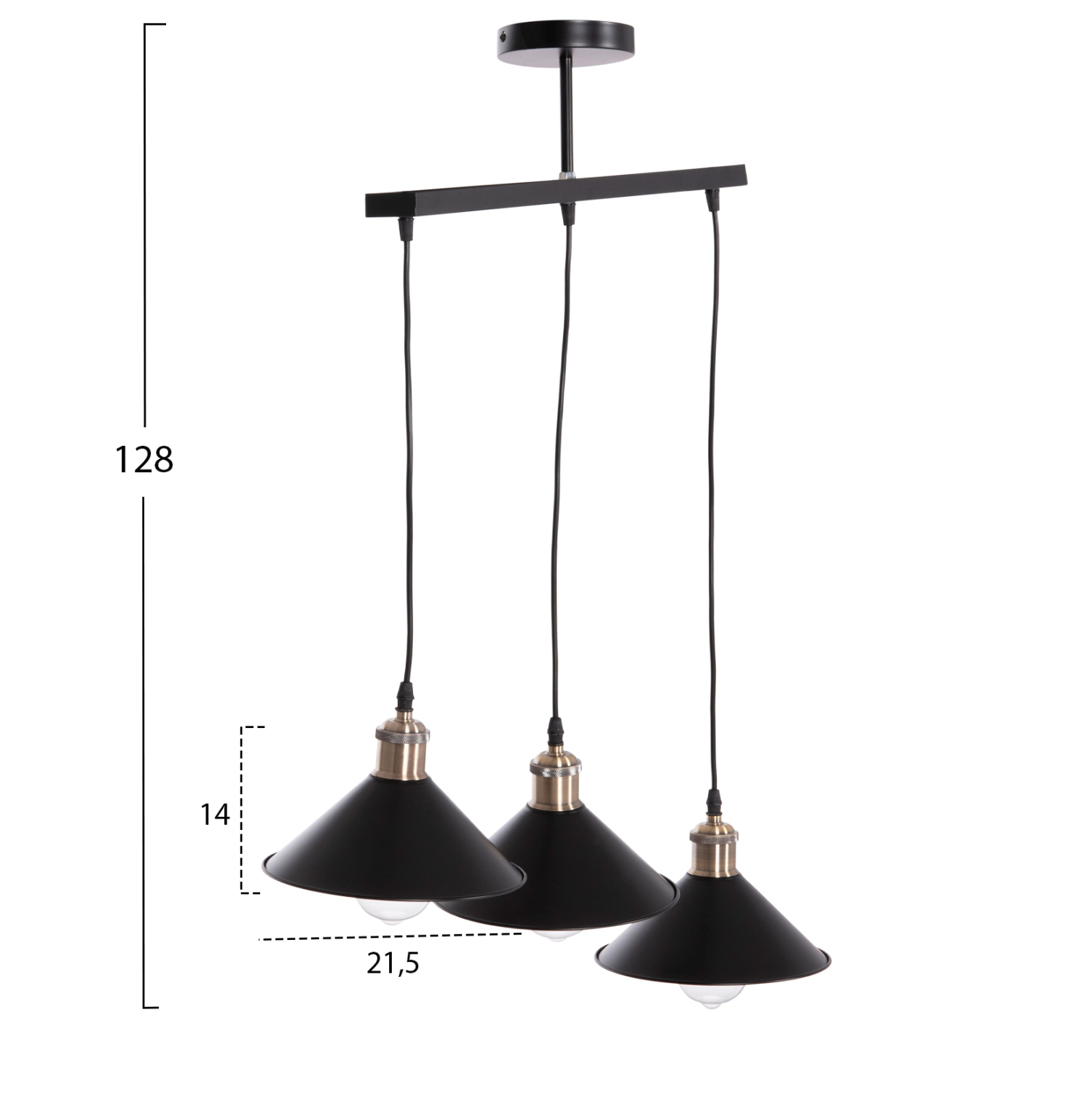 Το κρεμαστό τρίφωτο φωτιστικό οροφής BELL είναι ένα όμορφο κρεμαστό με μαύρη βάση και μαύρα καλώδια κρέμασης. Οι λάμπες είναι σε διαφορετικά ύψη και τα καπέλα είναι μεταλλικά με διακριτικές λεπτομέρειες σε ανοιχτό χάλκινο χρώμα στο επάνω μέρος τους.