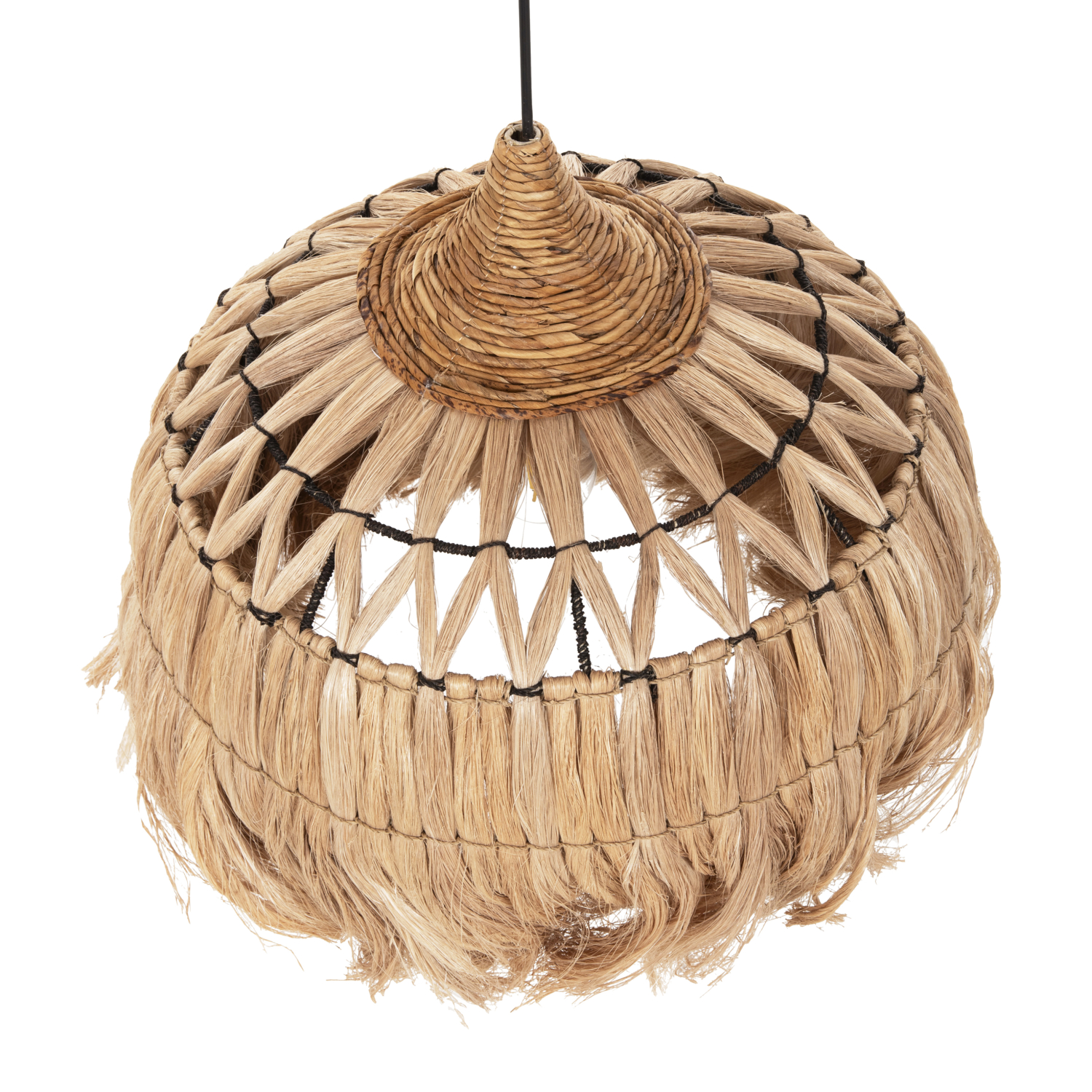Hm7760- Kρεμαστό φωτιστικό—- Αν επιθυμείτε να διακοσμήσετε το χώρο σας με ένα φωτιστικό σε boho στυλ, αυτό είναι μια χαρακτηριστική επιλογή. Είναι ένα μονόφωτο φωτιστικό με «καπέλο» σε σχήμα καμπάνας φτιαγμένο από ίνες κάνναβης Μανίλας σε φυσικό χρώμα. Το ιδιαίτερο χαρακτηριστικό αυτού του φωτιστικού είναι ότι στο επάνω μέρος του καπέλου οι ίνες είναι πλεγμένες με χιαστί τρόπο δίνοντας μια άλλη αισθητική στο φωτιστικό.