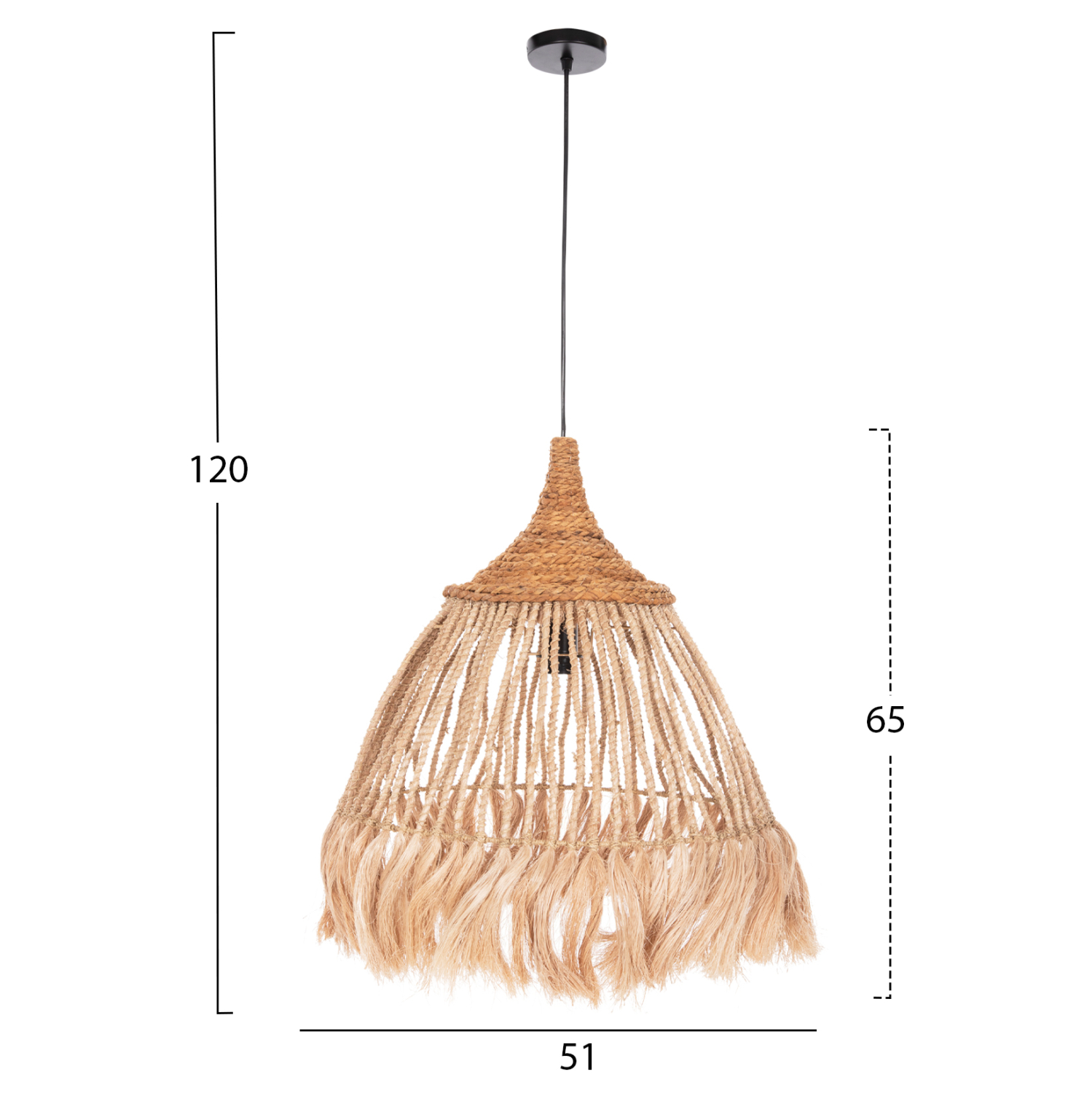 Hm7752- Kρεμαστό φωτιστικό—- Αν επιθυμείτε να διακοσμήσετε το χώρο σας με ένα φωτιστικό σε boho στυλ, αυτό είναι η πιο σωστή επιλογή. Είναι ένα μονόφωτο φωτιστικό για επαγγελματική χρήση, με «καπέλο» σε σχήμα καμπάνας φτιαγμένο από σκοινί, υψηλής ποιότητας και αντοχής στο χρόνο. Το ιδιαίτερο χαρακτηριστικό, όμως, αυτού του φωτιστικού είναι ότι το «καπέλο» καταλήγει σε κρόσια, επιτείνοντας ακόμα περισσότερο το boho στυλ.