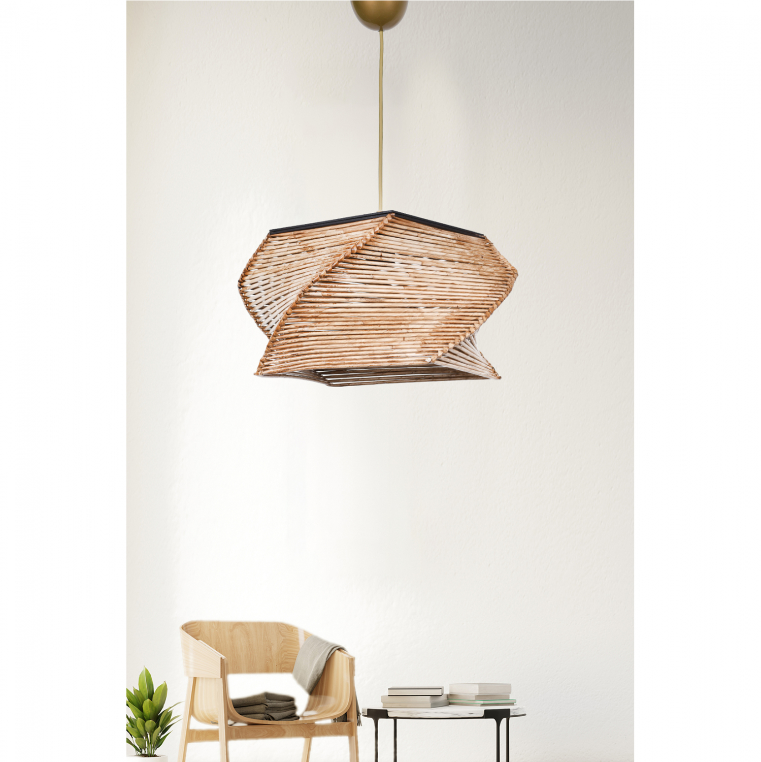 Μοντέρνο κρεμαστό φωτιστικό οροφής, κατασκευασμένο από ξύλινο σκελετό και επενδυμένο από bamboo υλικό σε φυσική απόχρωση με μαύρες λεπτομέρειες στο τελείωμα του καπέλου.