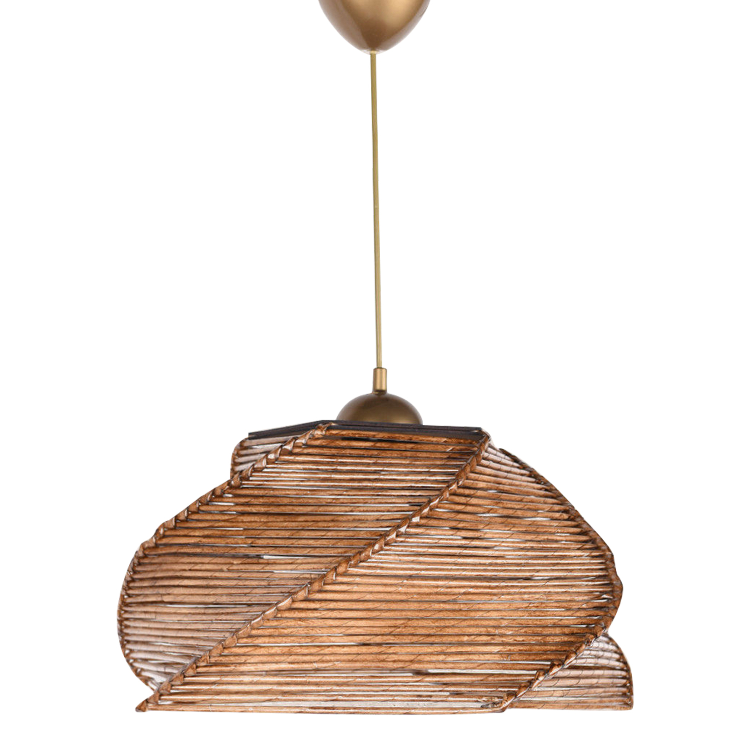 Μοντέρνο κρεμαστό φωτιστικό οροφής, κατασκευασμένο από ξύλινο σκελετό και επενδυμένο από bamboo υλικό σε καρυδί απόχρωση με μαύρες λεπτομέρειες.