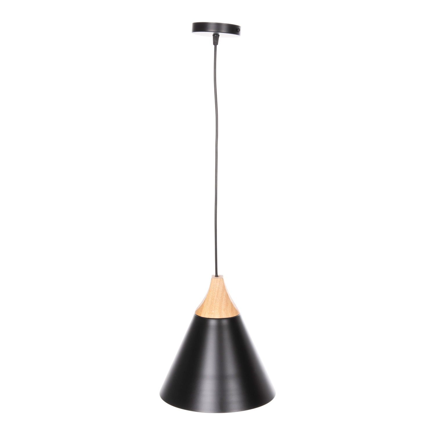 Ανακαλύψτε αυτό το νέο μας κρεμαστό φωτιστικό οροφής και ολοκληρώστε την διακόσμησή σας. Πρόκειται για ένα φωτιστικό με ΜΑΥΡΟ μεταλλικό καπέλο σε σχήμα καμπάνας με λεπτομέρεια ξύλου στην κορυφή του φωτιστικού. Αισθητικά, ολοκληρώνεται με το λευκό καλώδιο κρέμασης και την λευκή βάση οροφής, και αποτελεί την τελευταία τάση στα φωτιστικά οροφής.