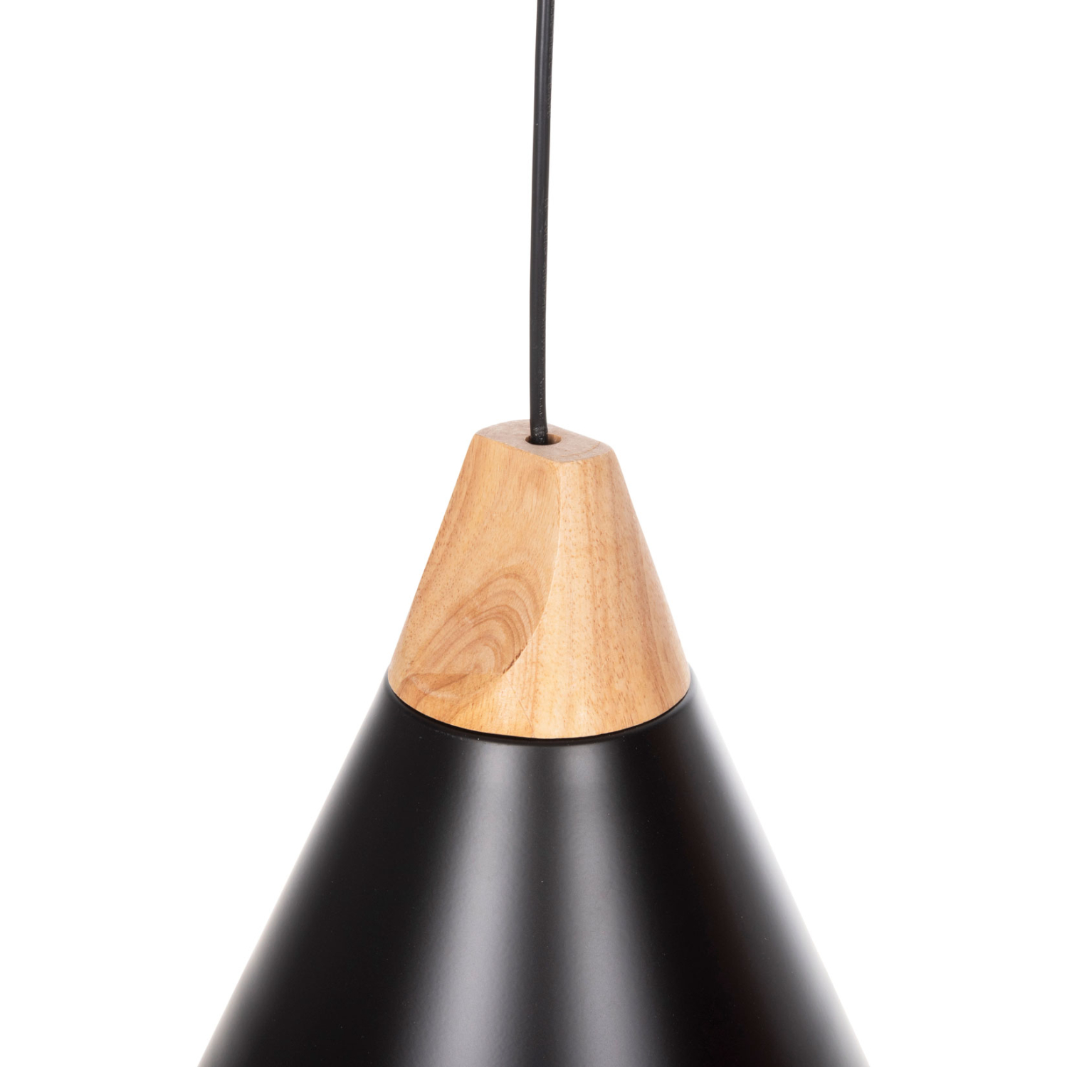 Ανακαλύψτε αυτό το νέο μας κρεμαστό φωτιστικό οροφής και ολοκληρώστε την διακόσμησή σας. Πρόκειται για ένα φωτιστικό με ΜΑΥΡΟ μεταλλικό καπέλο σε σχήμα κωνικής καμπάνας με λεπτομέρεια ξύλου στην κορυφή του φωτιστικού. Αισθητικά, ολοκληρώνεται με το επίσης ΜΑΥΡΟ καλώδιο κρέμασης και την μαύρη βάση οροφής, και αποτελεί την τελευταία τάση στα φωτιστικά οροφής.