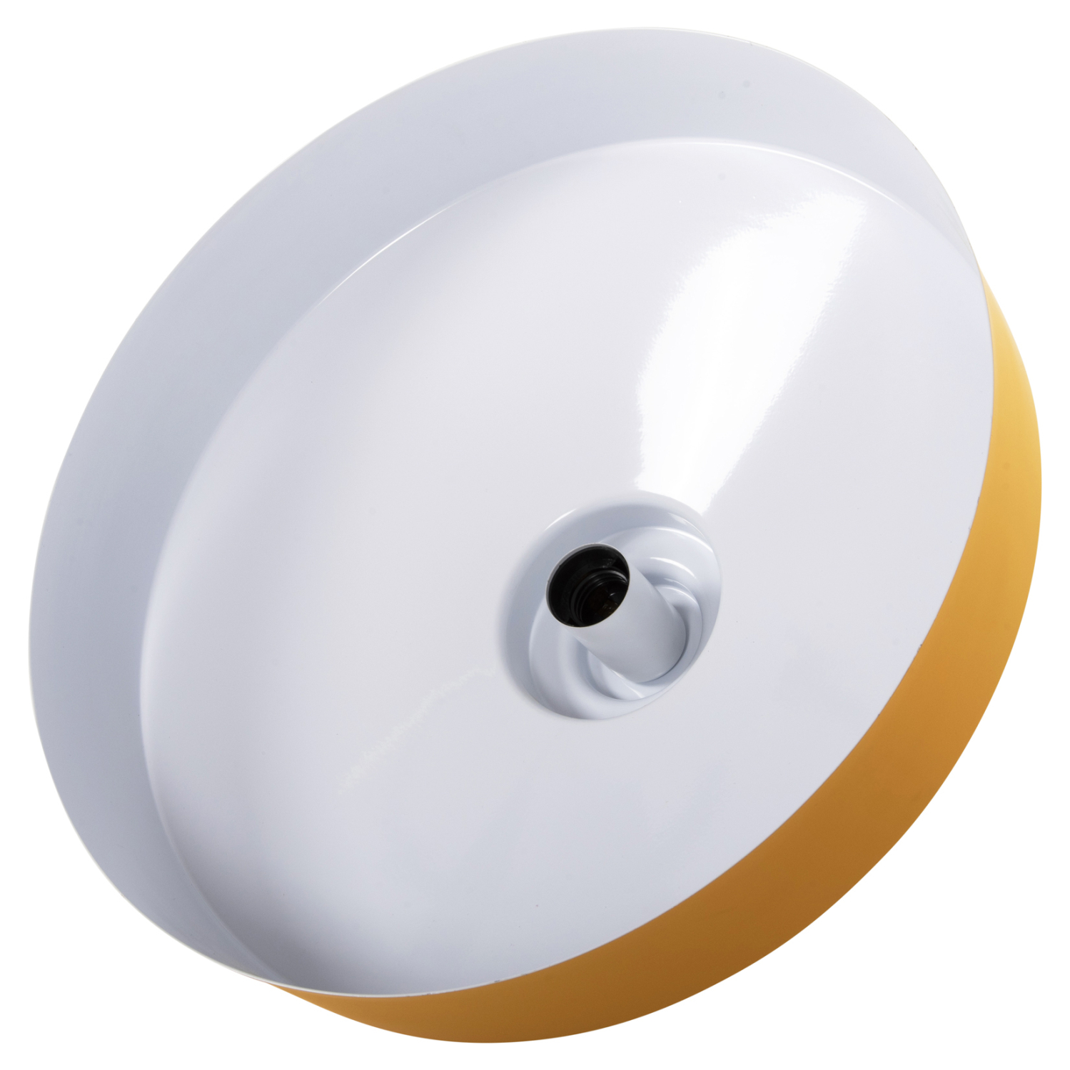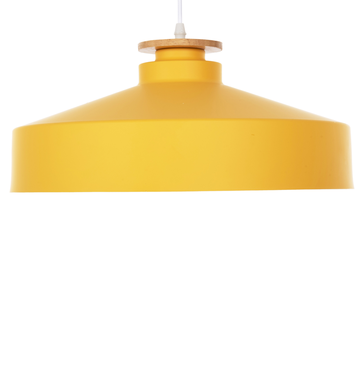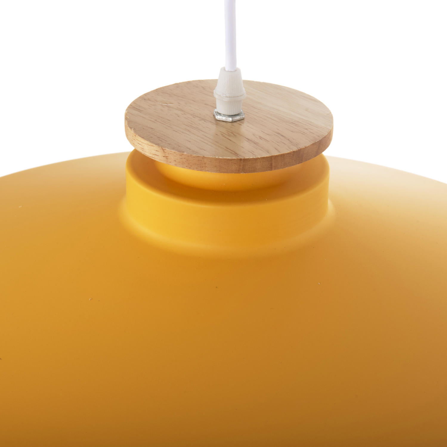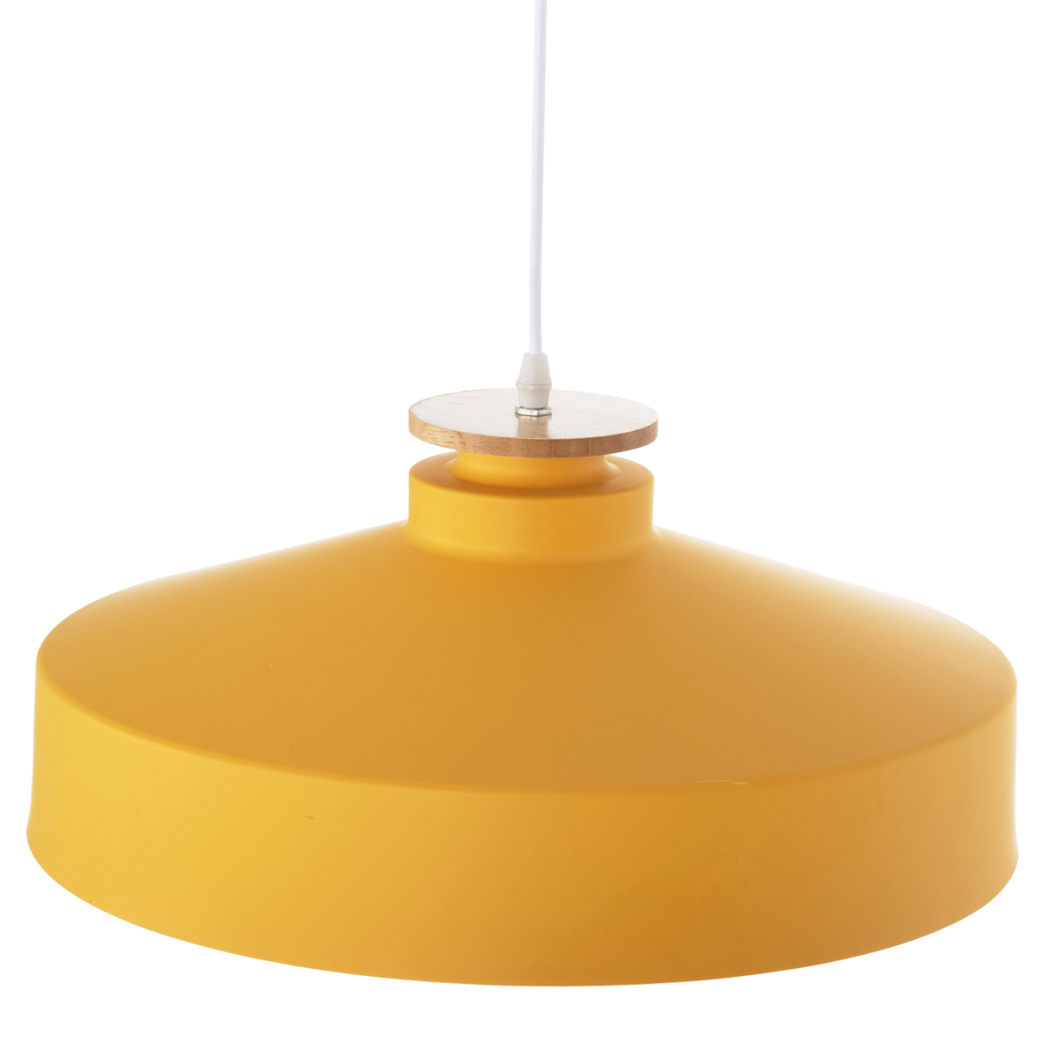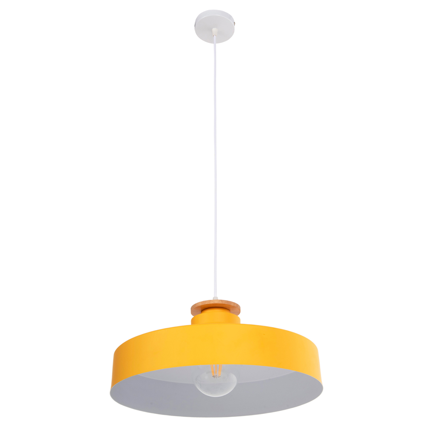 Ανακαλύψτε αυτό το νέο μας κρεμαστό φωτιστικό οροφής και ολοκληρώστε την διακόσμησή σας. Πρόκειται για ένα φωτιστικό με ΚΙΤΡΙΝΟ ρηχό μεταλλικό καπέλο σε σχήμα καμπάνας με λεπτομέρεια ξύλου στην κορυφή του φωτιστικού. Αισθητικά, ολοκληρώνεται με το λευκό καλώδιο κρέμασης και την λευκή βάση οροφής, και αποτελεί την τελευταία τάση στα φωτιστικά οροφής.