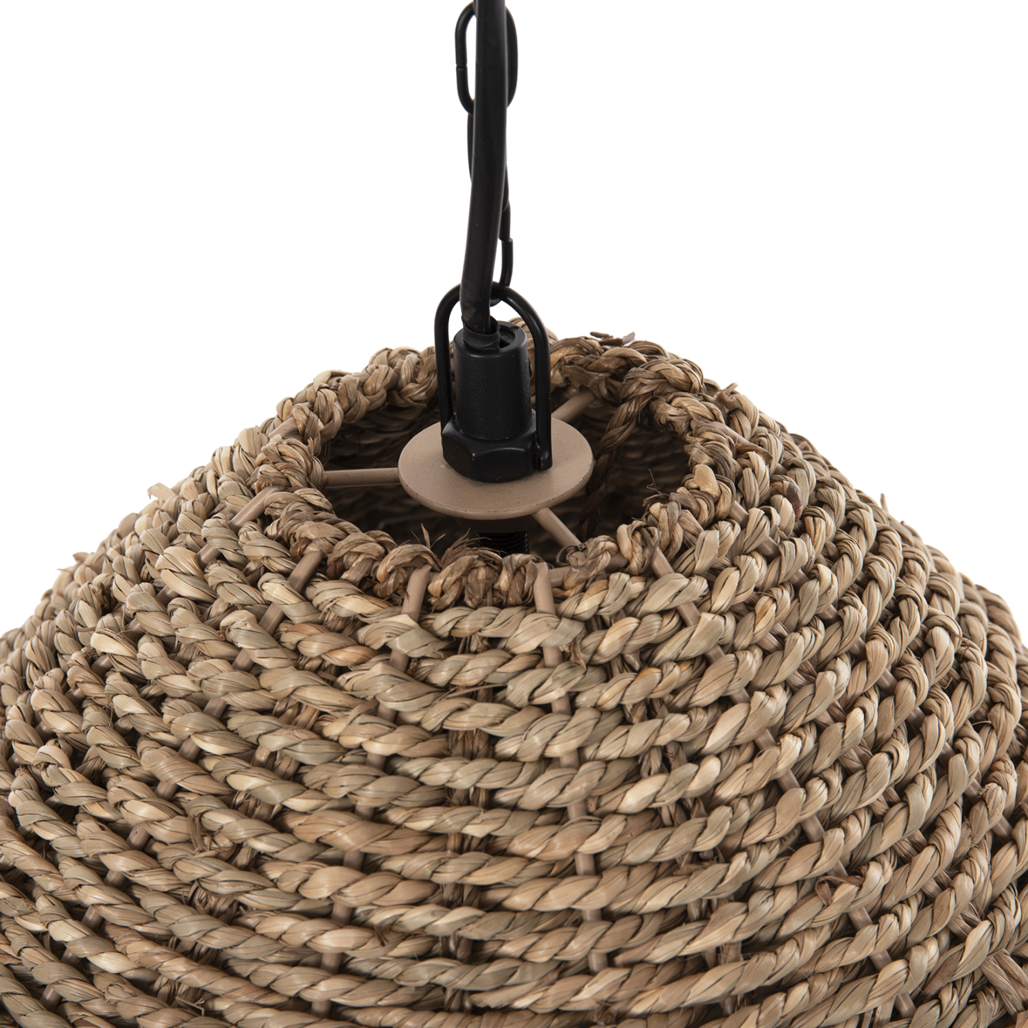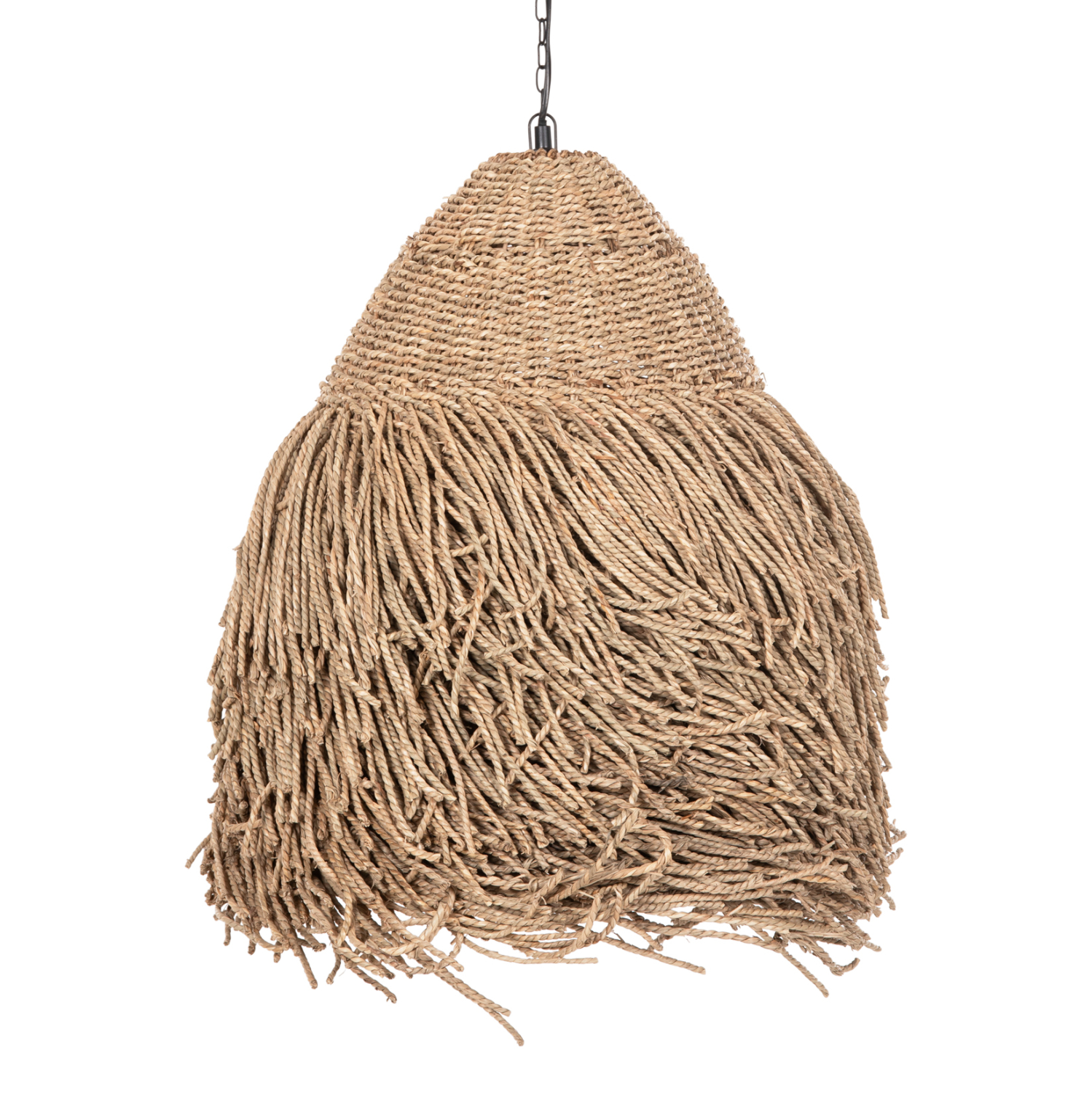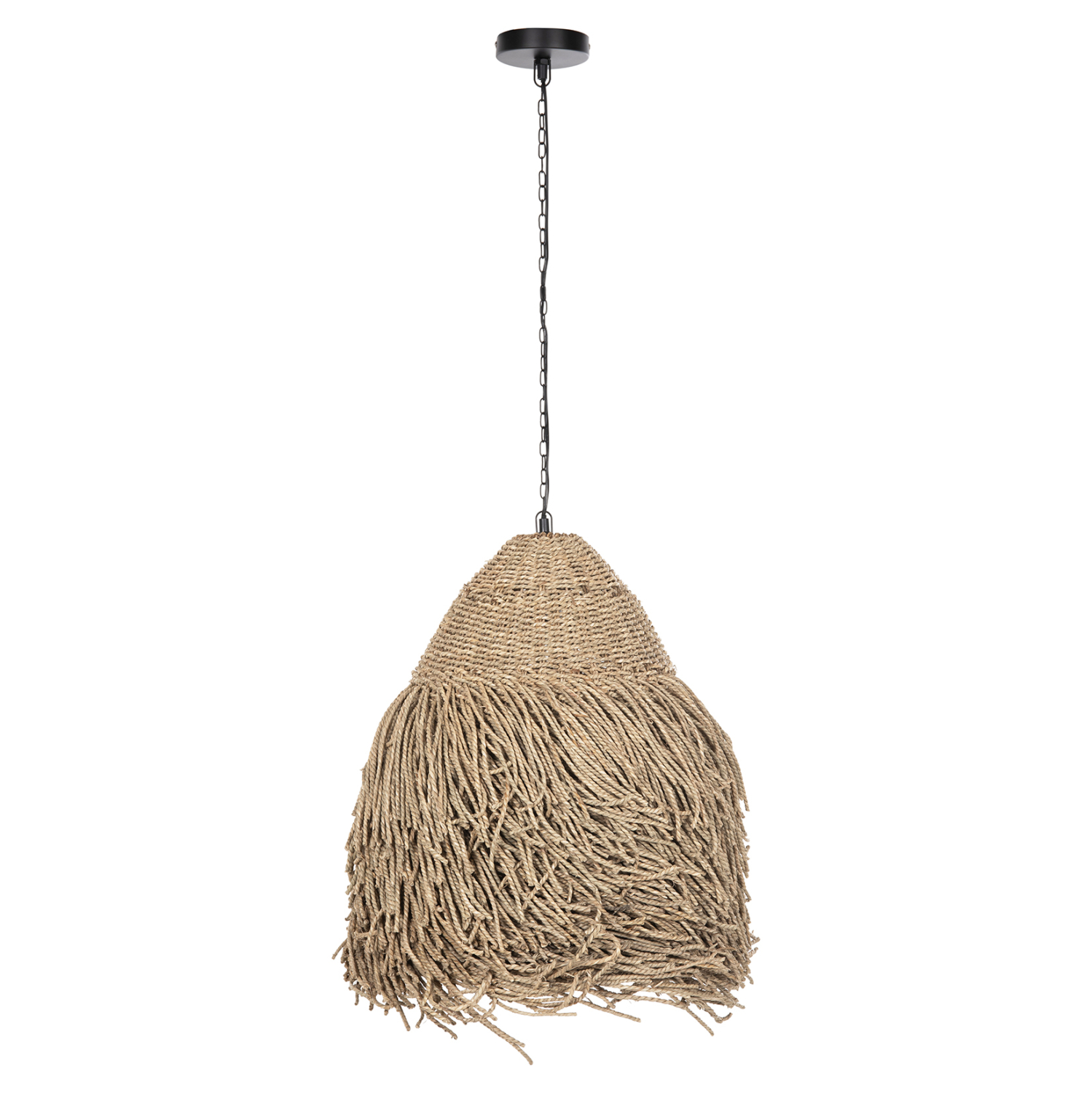 Αν επιθυμείτε να διακοσμήσετε το χώρο σας με ένα φωτιστικό σε boho στυλ, αυτό το φωτιστικό που είναι μια από τις νέες προσθήκες στην γκάμα μας είναι μια ασφαλής επιλογή. Πρόκειται για ένα μονόφωτο φωτιστικό με «καπέλο» σε σχήμα καμπάνας φτιαγμένο από αποξηραμένα seagrass, σε φυσικό χρώμα. Το χαρακτηριστικό, όμως αυτού του φωτιστικού είναι ότι διαθέτει πολύ μεγάλα κρόσια και λευκή αλυσίδα κρέμασης που δίνουν μια διαφορετική όψη σε σχέση με άλλα παρόμοια φωτιστικά.