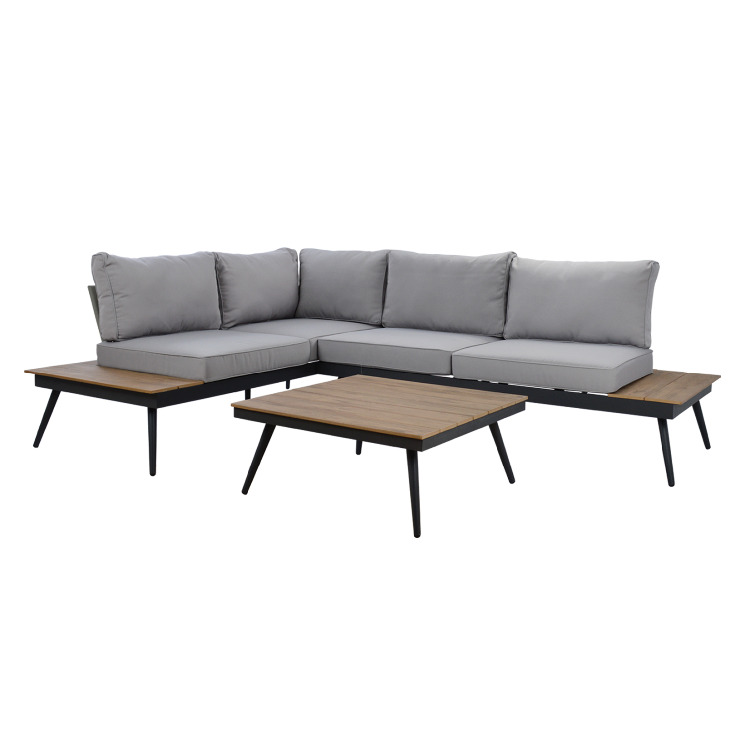 Καναπές γωνία με μεγάλα μαξιλάρια από ύφασμα σε γκρι χρώμα και σκελετό αλουμινίου σε σκούρο γκρι χρώμα σε συνδυασμό με λεπτομέρειες από υλικό polywood σε απόχρωση του ξύλου.