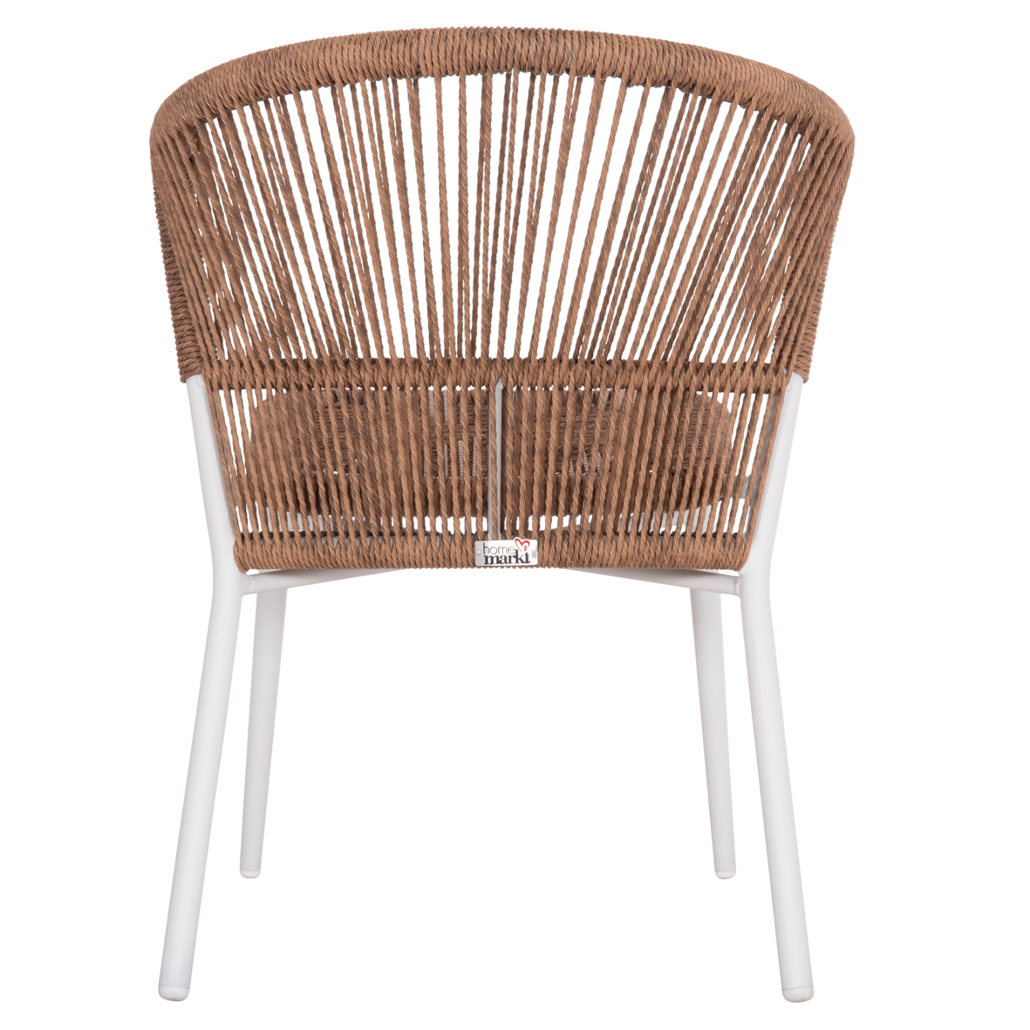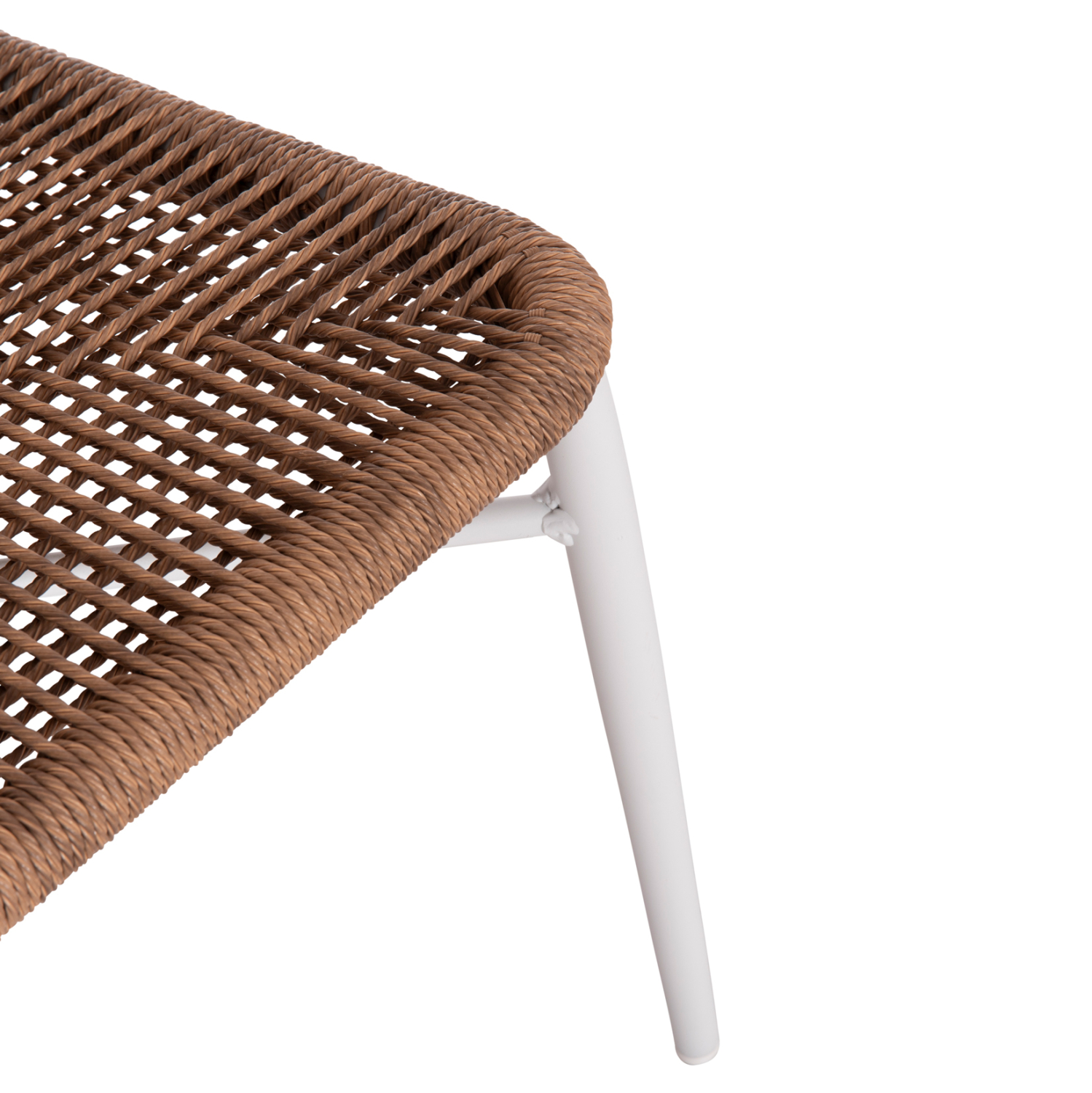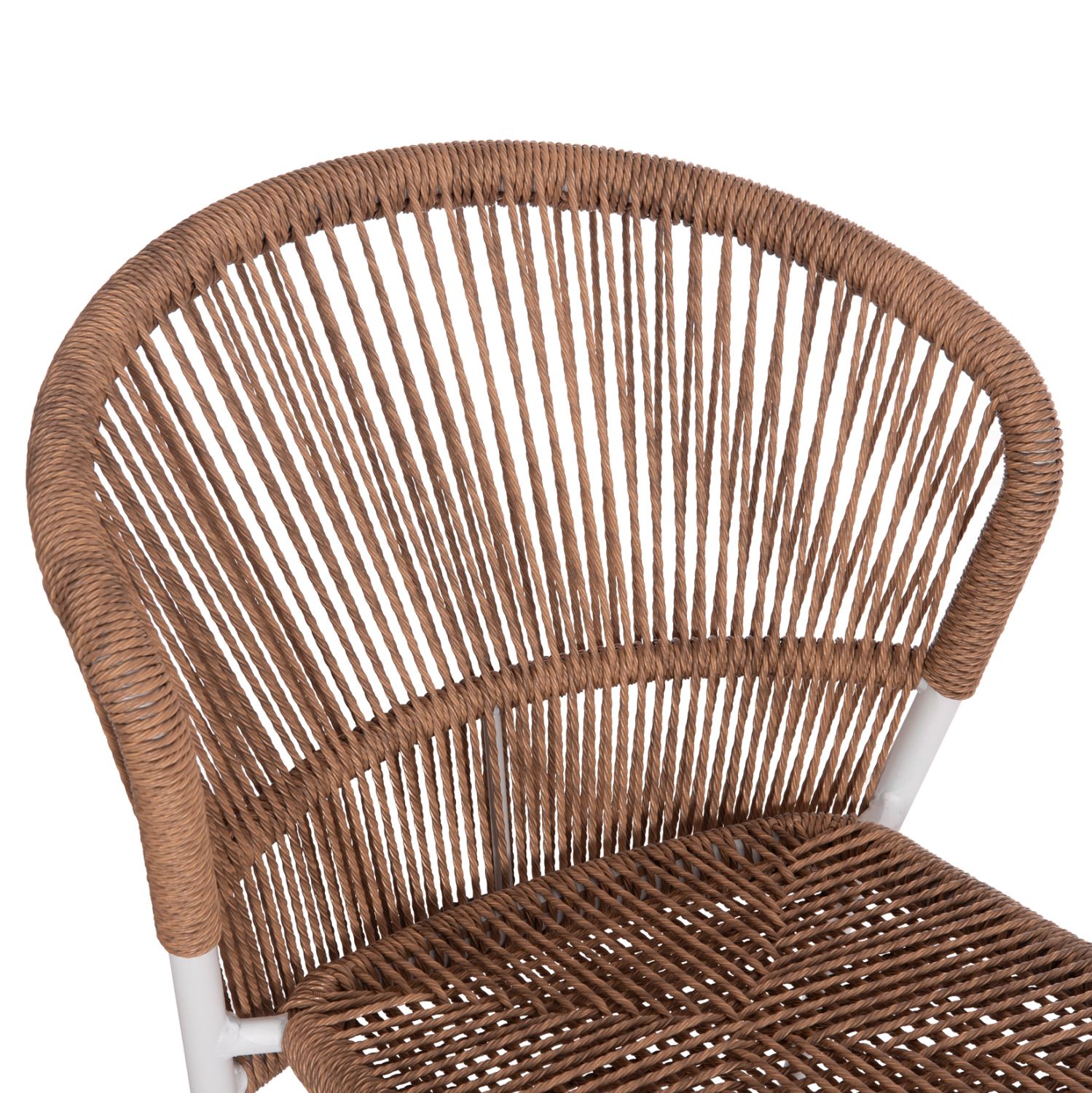 Η πλάτη και το κάθισμα της καρέκλας είναι από P.E. Rattan σε πλέξη. Δηλαδή, η πλέξη έχει γίνει με πολυεστερικές ίνες υψηλής ποιότητας και αντοχής ανθεκτικές σε ακραίες καιρικές συνθήκες ζέστης ή κρύου, που μοιάζουν με σχοινί.
