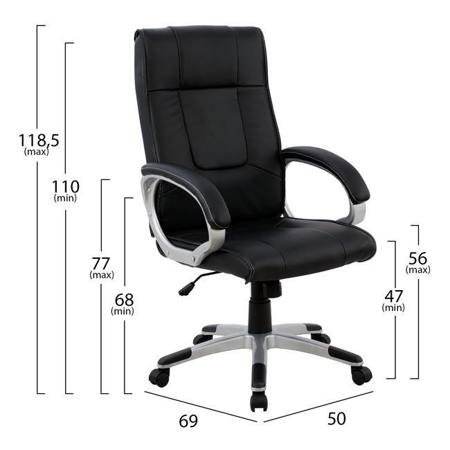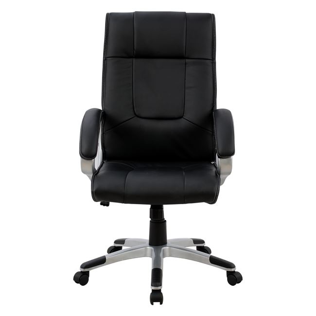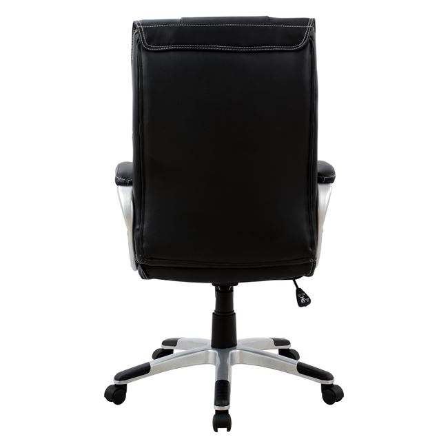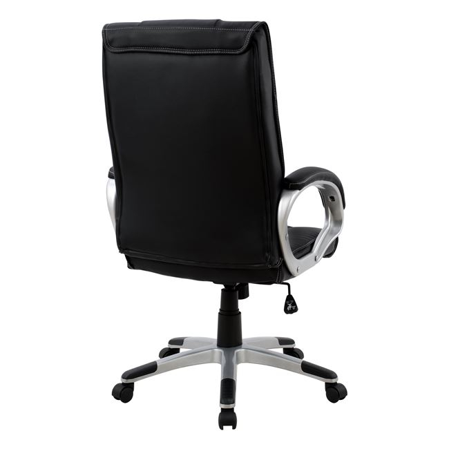 Διευθυντική καρέκλα γραφείου “CHANDER” σε μαύρο χρώμα. Μια «πλούσια» καρέκλα γραφείου με ψηλά μπράτσα με κλίση και επενδυμένα με μια λεπτή στρώση αφρολέξ σε PU δέρμα. Η πλάτη είναι ψηλή με πλούσια στρώση από αφρώδη υλικά για άνεση κατά την χρήση και υποστηρίζει ολόκληρο τον κορμό σας, ενώ είναι επενδυμένη με υψηλής ποιότητας PU δέρμα , όπως επίσης και το φαρδύ και αναπαυτικό κάθισμα με την αναπαυτική επιφάνεια. Η βάση είναι ασημί σε σχήμα «αστέρι» με μαύρες λεπτομέρειες στο τελείωμα.