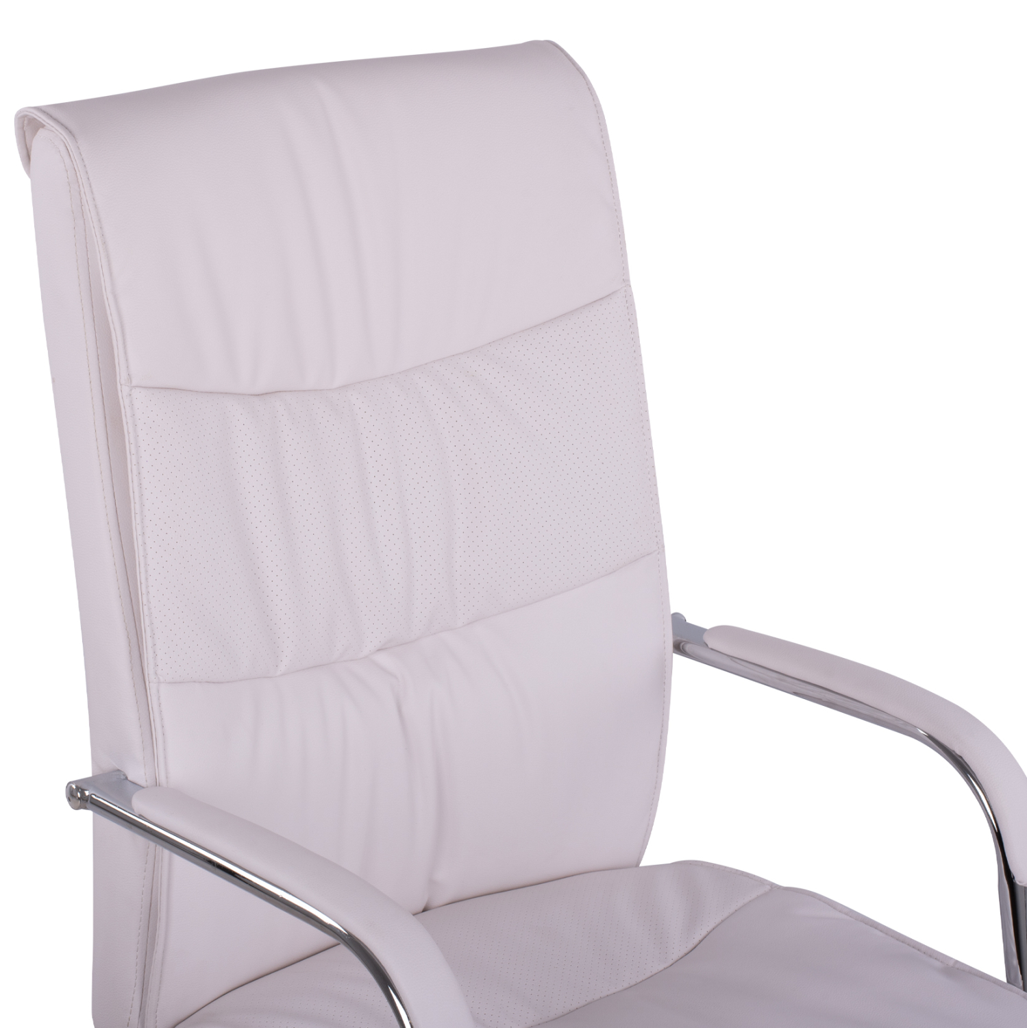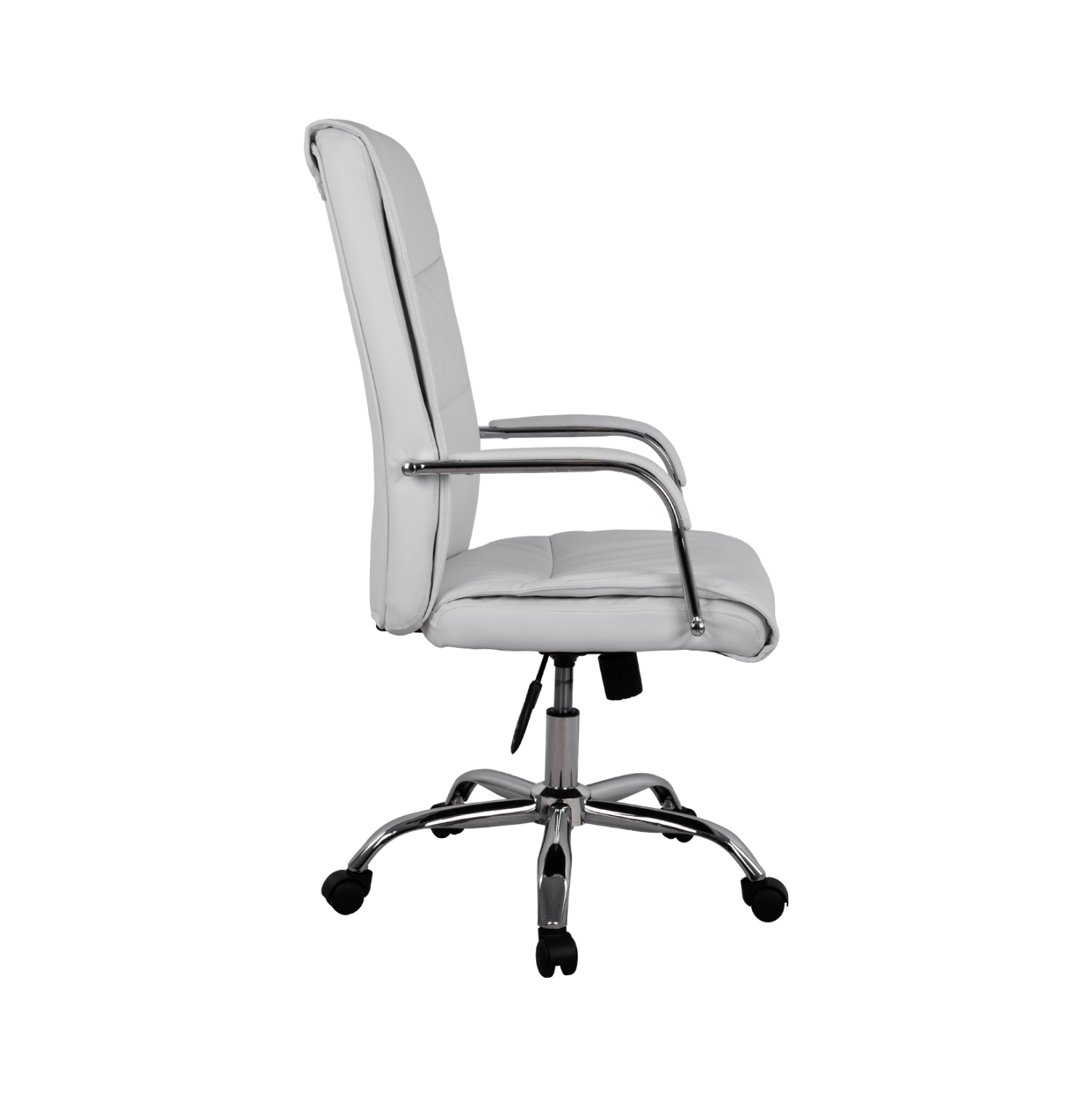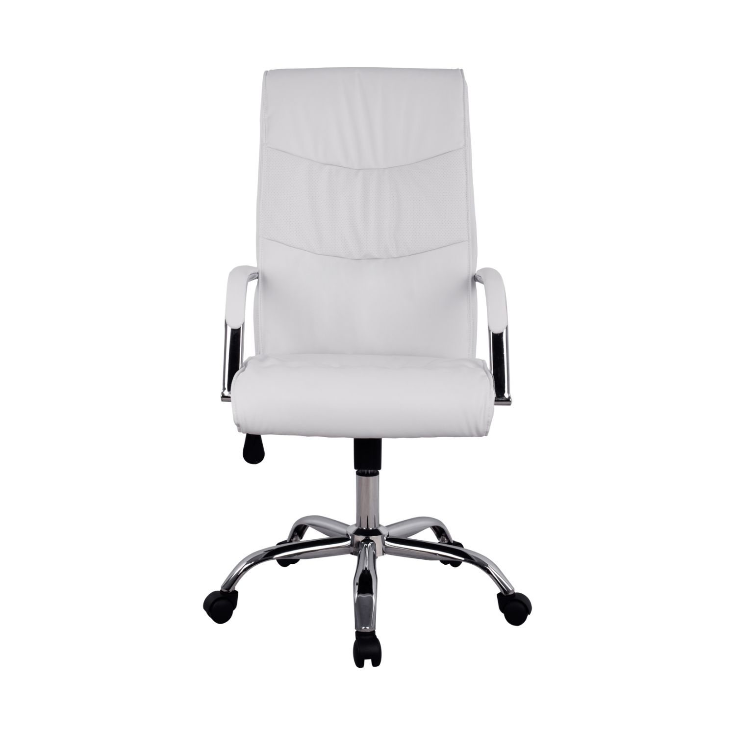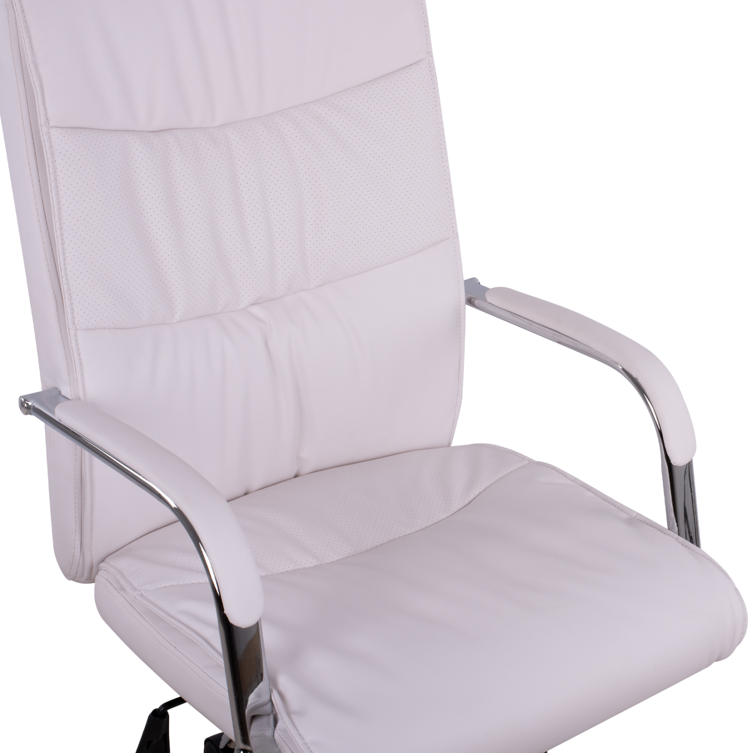 Διευθυντική καρέκλα γραφείου “JACOB” σε λευκό χρώμα. Μια «πλούσια» καρέκλα γραφείου με ψηλά επίπεδα inox μπράτσα με στρογγυλεμένες άκρες , επενδυμένα με μια λεπτή στρώση αφρολέξ σε PU δέρμα. Η πλάτη είναι ανατομική και ψηλή με «μαξιλάρι» από αφρώδη υλικά για άνεση κατά την χρήση και υποστηρίζει ολόκληρο τον κορμό σας, ενώ είναι επενδυμένη με υψηλής ποιότητας PU δέρμα , όπως επίσης και το φαρδύ και αναπαυτικό κάθισμα με την αναπαυτική επιφάνεια. Η βάση είναι inox σε σχήμα «αστέρι».