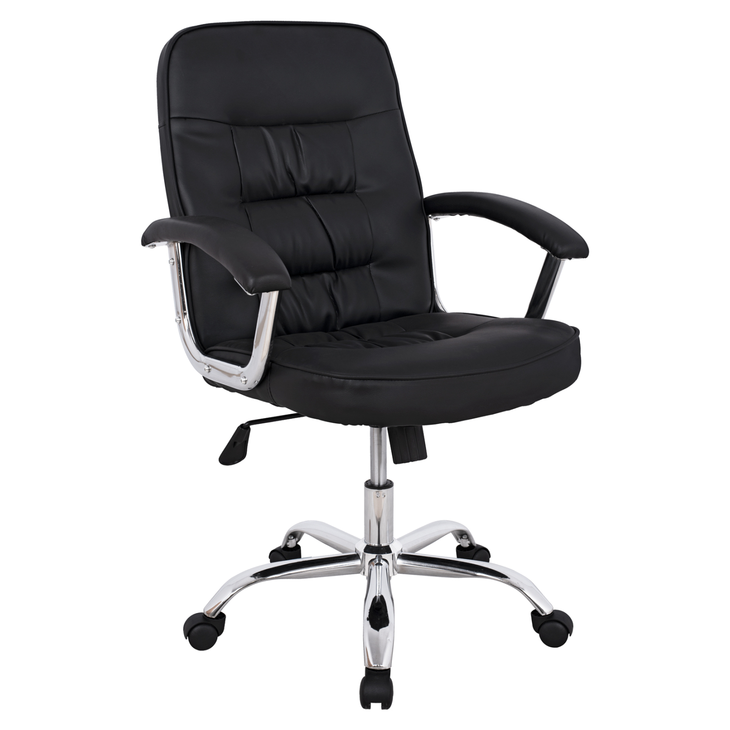 Διευθυντική καρέκλα γραφείου “RYLIE” σε μαύρο χρώμα. Μια «πλούσια» καρέκλα γραφείου με ψηλά μπράτσα με ελαφριά κλίση, επενδυμένα με μια λεπτή στρώση αφρολέξ σε PU δέρμα. Η πλάτη είναι ημίψηλη με πλούσια στρώση από αφρώδη υλικά για άνεση κατά την χρήση και υποστηρίζει ολόκληρο τον κορμό σας, ενώ είναι επενδυμένη με υψηλής ποιότητας PU δέρμα, όπως επίσης και το αναπαυτικό κάθισμα. Η βάση είναι χρωμιωμένη σε σχήμα «αστέρι» με κυρτά πόδια και μαύρα ροδάκια.