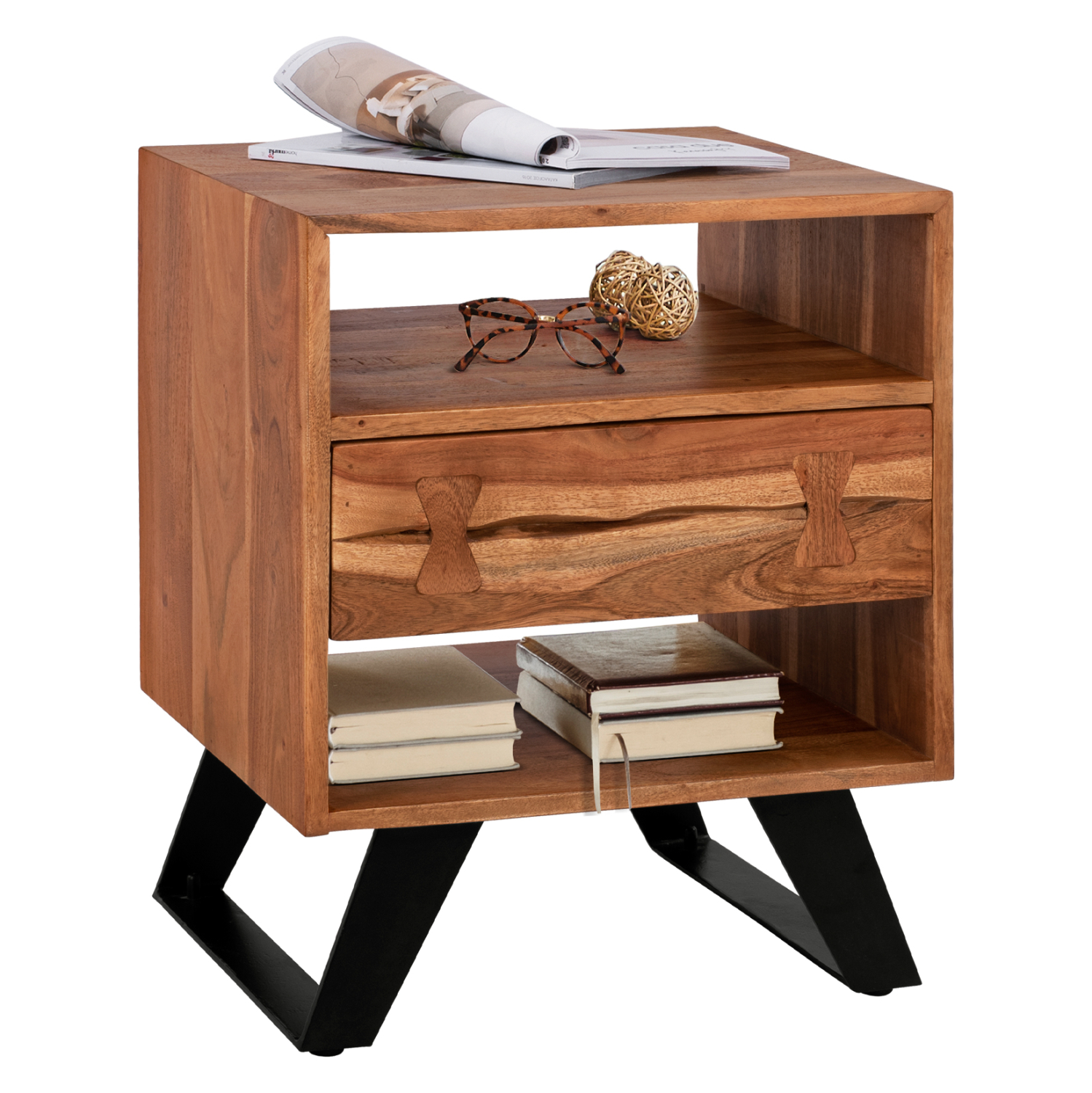 Κομοδίνο από μασίφ ξύλο Ακακίας σε φυσική απόχρωση και μεταλλικά πόδια σε μαύρο χρώμα.