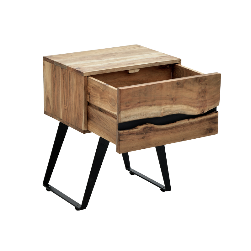 Κομοδίνο Imena pakoworld μασίφ ξύλο Acacia σε φυσικό απόχρωση με μαύρα μεταλλικά πόδια 45x35x56εκ