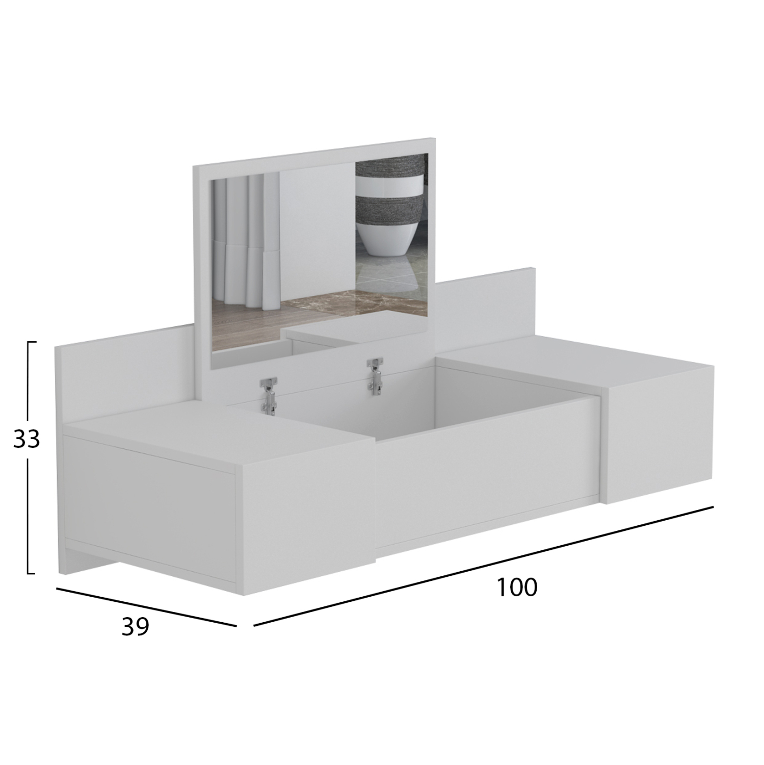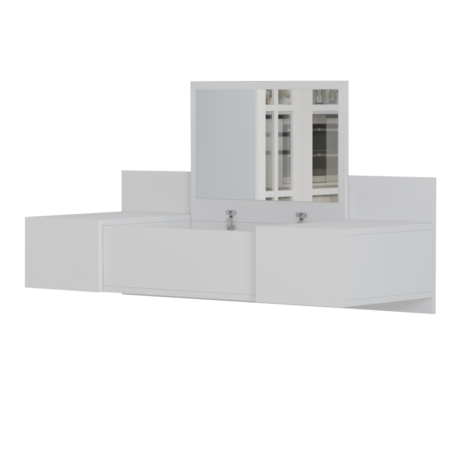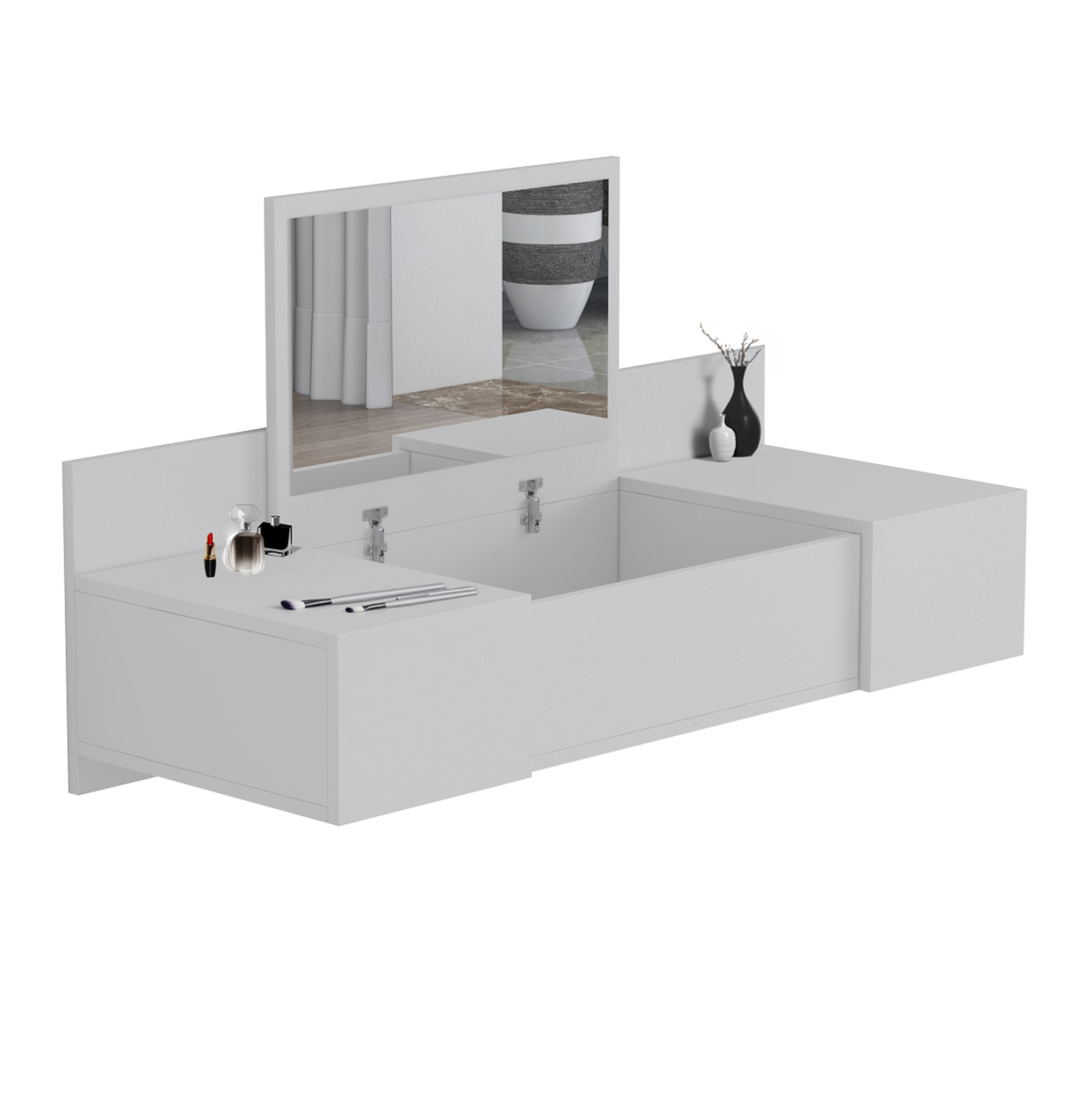 Η κρεμαστή τουαλέτα LINDE σε ΛΕΥΚΟ χρώμα είναι μια πρακτική και προσιτή πρόταση για το υπνοδωμάτιο. Αναρτάται στον τοίχο και διαθέτει πτυσσόμενο καθρέπτη και 2 συρτάρια στις δύο πλευρές. Όταν ο καθρέπτης είναι κλειστός το έπιπλο μετατρέπεται σε πάγκο. Κάτω από τον καθρέπτη υπάρχει ακόμα ένας χώρος αποθήκευσης αντικειμένων. Ένα έπιπλο που θα ομορφύνει τον χώρο και ταυτόχρονα θα σας βοηθήσει να οργανώσετε με τον καλύτερο τρόπο τα αγαπημένα σας αντικείμενα.