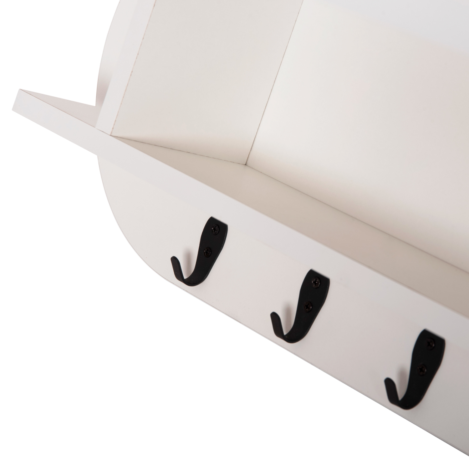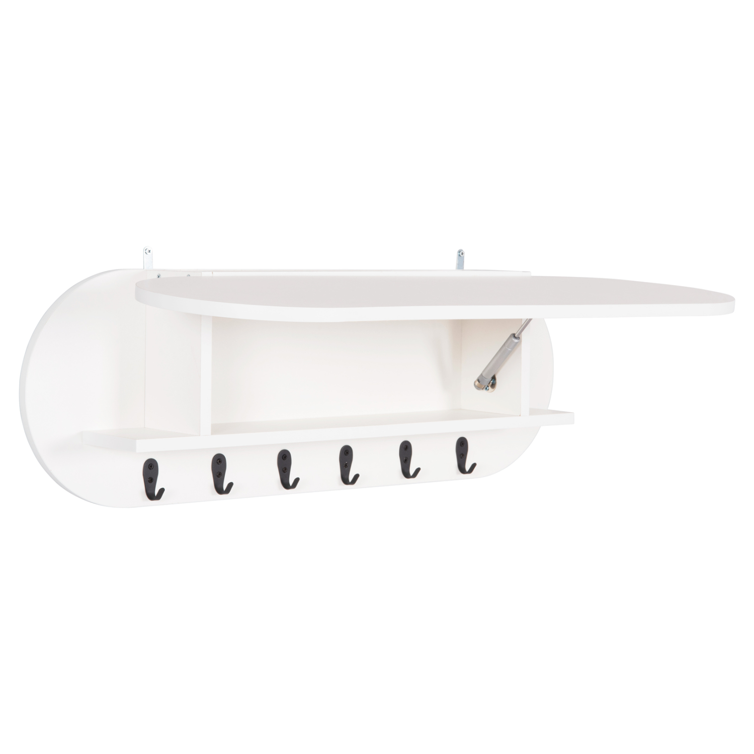 Η επιτοίχια κρεμάστρα εισόδου μελαμίνης STOR σε ΛΕΥΚΟ χρώμα είναι μια πρακτική πρόταση διακόσμησης για τον χώρο υποδοχής του σπιτιού σας, που θα σας βοηθήσει να δημιουργήσετε έναν καλά οργανωμένο και τακτοποιημένο χώρο. Έχει σχήμα οβάλ και διαθέτει 6 μονές κρεμάστρες (γαντζάκια) και 1 ορθογώνιο χώρο τοποθέτησης αντικειμένων/ράφι, το οποίο όμως κλείνει, αφού η εμπρός επιφάνεια αποτελεί την πόρτα του ραφιού. Αυτή η πόρτα ανοίγει προς τα επάνω και «κρύβει» εκτός από το ράφι, και τις κρεμάστρες.