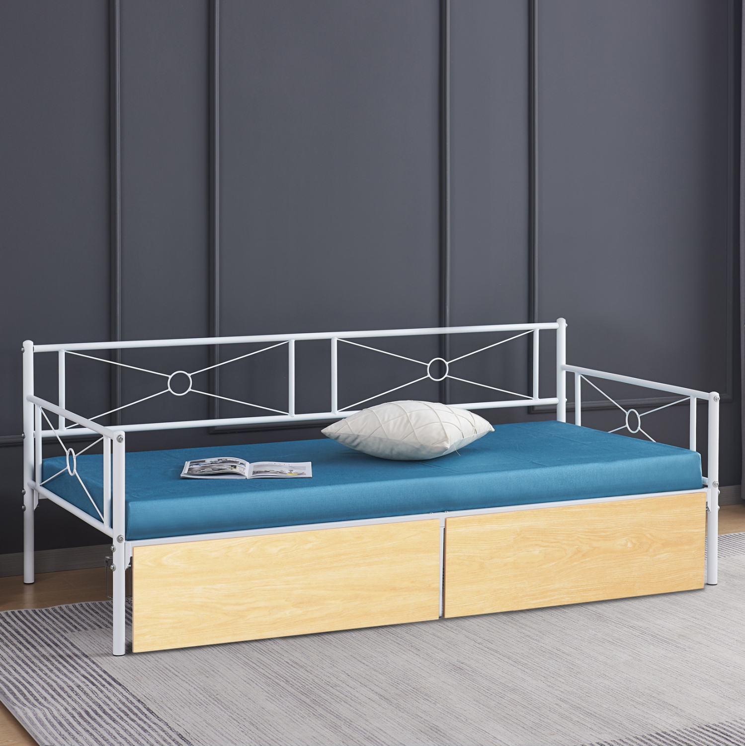 Πρόκειται για μια αμιγώς μεταλλική κατασκευή σε ΛΕΥΚΟ χρώμα που μπορεί άνετα να σταθεί και να συνδυαστεί με πληθώρα διακοσμητικών μοτίβων σε κάθε χώρο. Η πλάτη είναι μεταλλική με συμμετρικά μεταλλικά σχέδια ενώ και τα μπράτσα είναι παρόμοιας αισθητικής. Δεν διαθέτει τάβλες για την στήριξη του στρώματος αλλά μεταλλικές ράβδους. Η πρακτικότητά του τονίζεται ακόμα περισσότερο χάρη στα δύο συρτάρια δαπέδου με ροδάκια, που τοποθετούνται κάτω από το κρεβάτι, και διαθέτουν όμορφη πρόσοψη μελαμίνης σε SONAMA χρώμα. Πρόκειται για μια ιδανική επιλογή τόσο για το υπνοδωμάτιό σας, όσο και για επαγγελματικούς χώρους, όπως ξενοδοχεία και Airbnb.