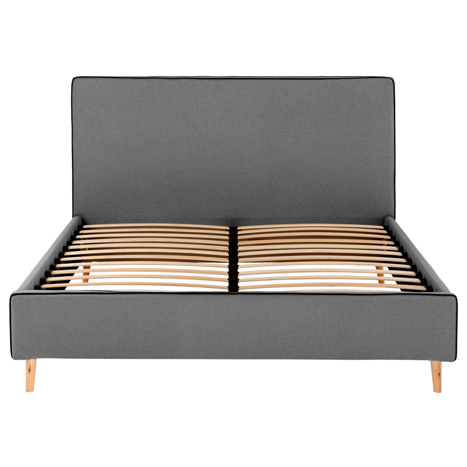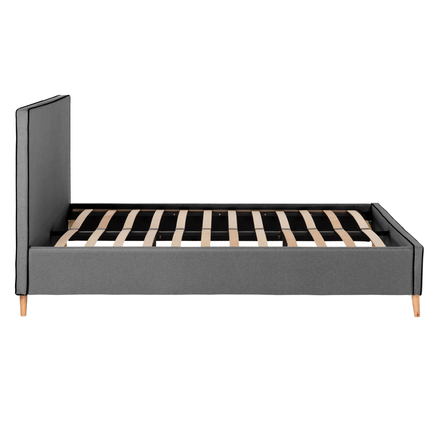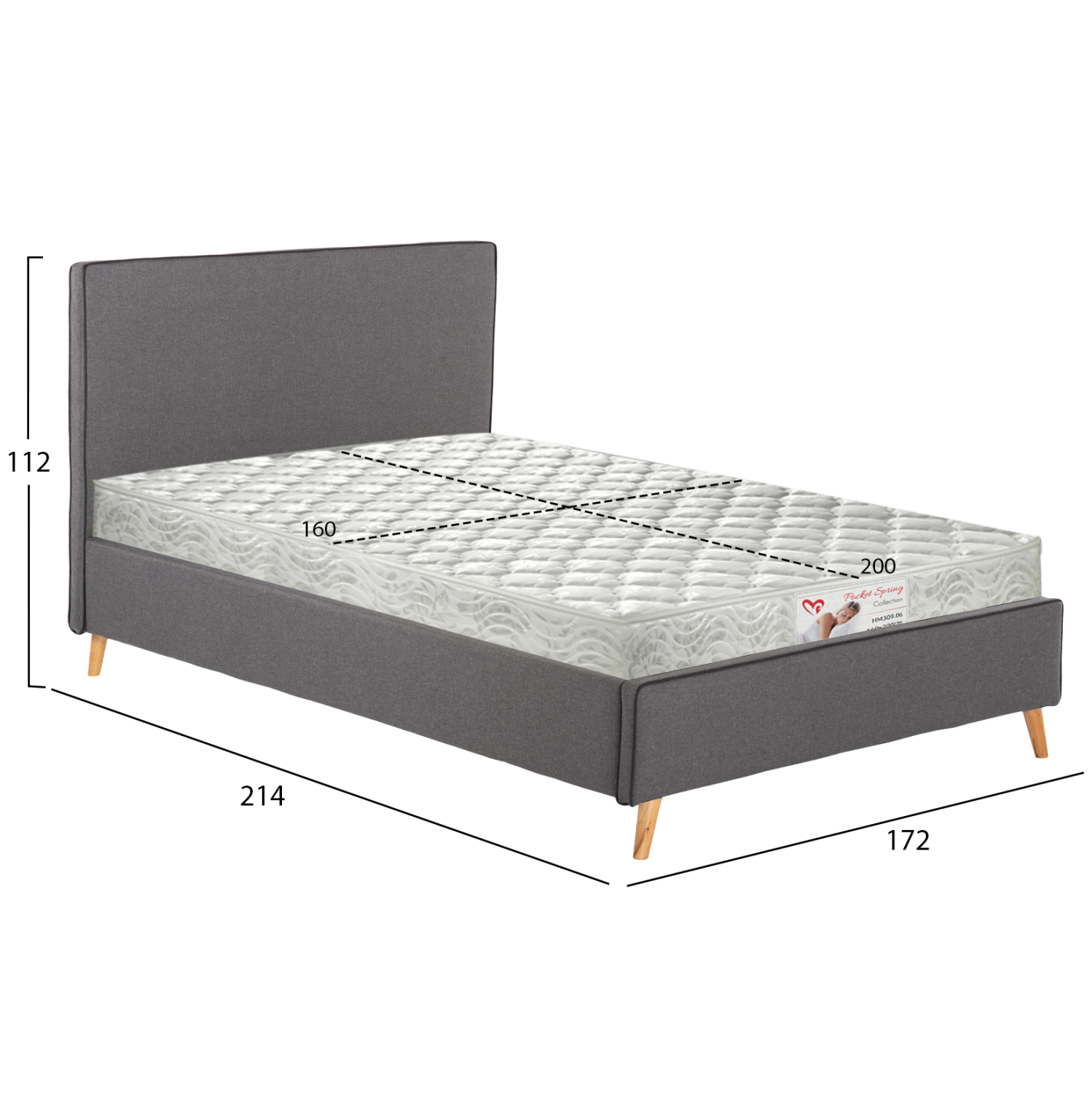 Το υπέρδιπλο κρεβάτι INDRA είναι επενδυμένο με ύφασμα σε χρώμα ΓΚΡΙ με σκούρο ρέλι στις ραφές. Το στρώμα που συνοδεύει το κρεβάτι τοποθετείται σε δύο σειρές ανατομικές τάβλες, είναι διπλής όψης και έχει τεχνολογία με pocket springs (ανεξάρτητα ελατήρια). Τα πόδια είναι ξύλινα σε φυσικό χρώμα.