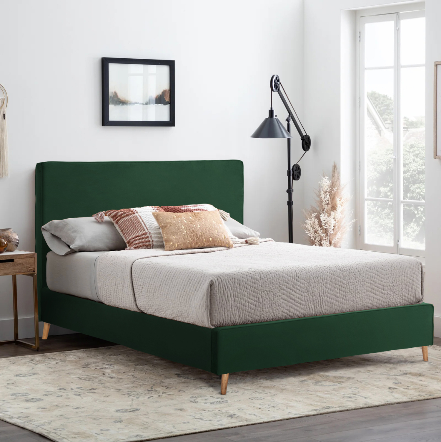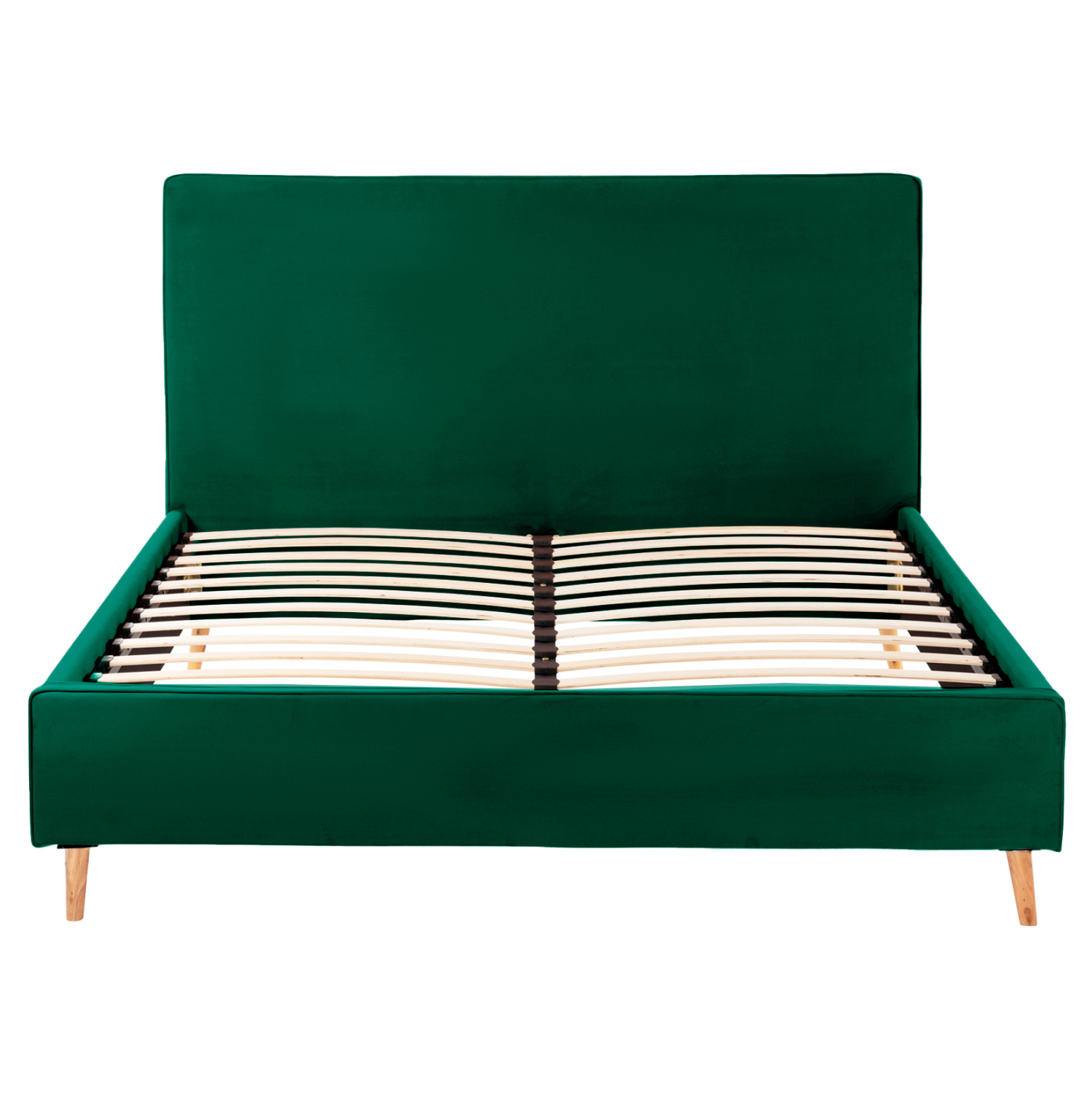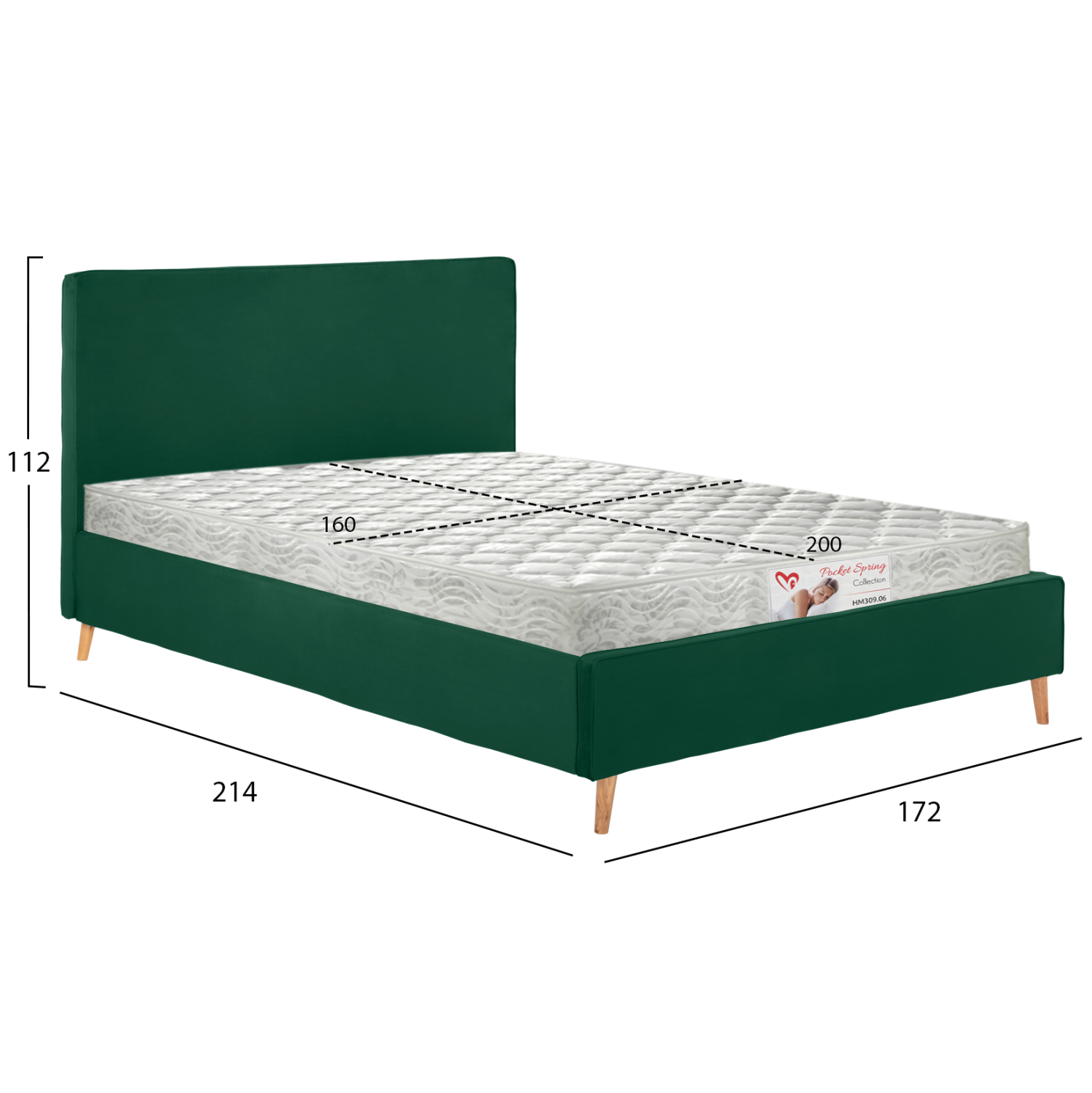 Το υπέρδιπλο κρεβάτι INDRA είναι επενδυμένο με βελούδο σε χρώμα ΚΥΠΑΡΙΣΣΙ με ίδιο ρέλι στις ραφές. Το στρώμα που συνοδεύει το κρεβάτι τοποθετείται σε δύο σειρές ανατομικές τάβλες, είναι διπλής όψης και έχει τεχνολογία με pocket springs (ανεξάρτητα ελατήρια). Τα πόδια είναι ξύλινα σε φυσικό χρώμα.