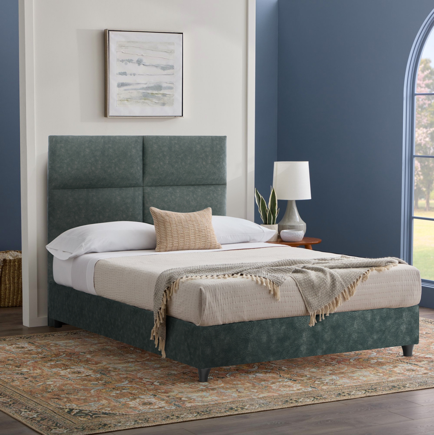Η επένδυση έχει γίνει εξολοκλήρου από ανάγλυφο ύφασμα εξαιρετικής ποιότητας, χαρίζοντας ελκυστική όψη και μια εκλεπτυσμένη γοητεία στην διακόσμηση του υπνοδωματίου.