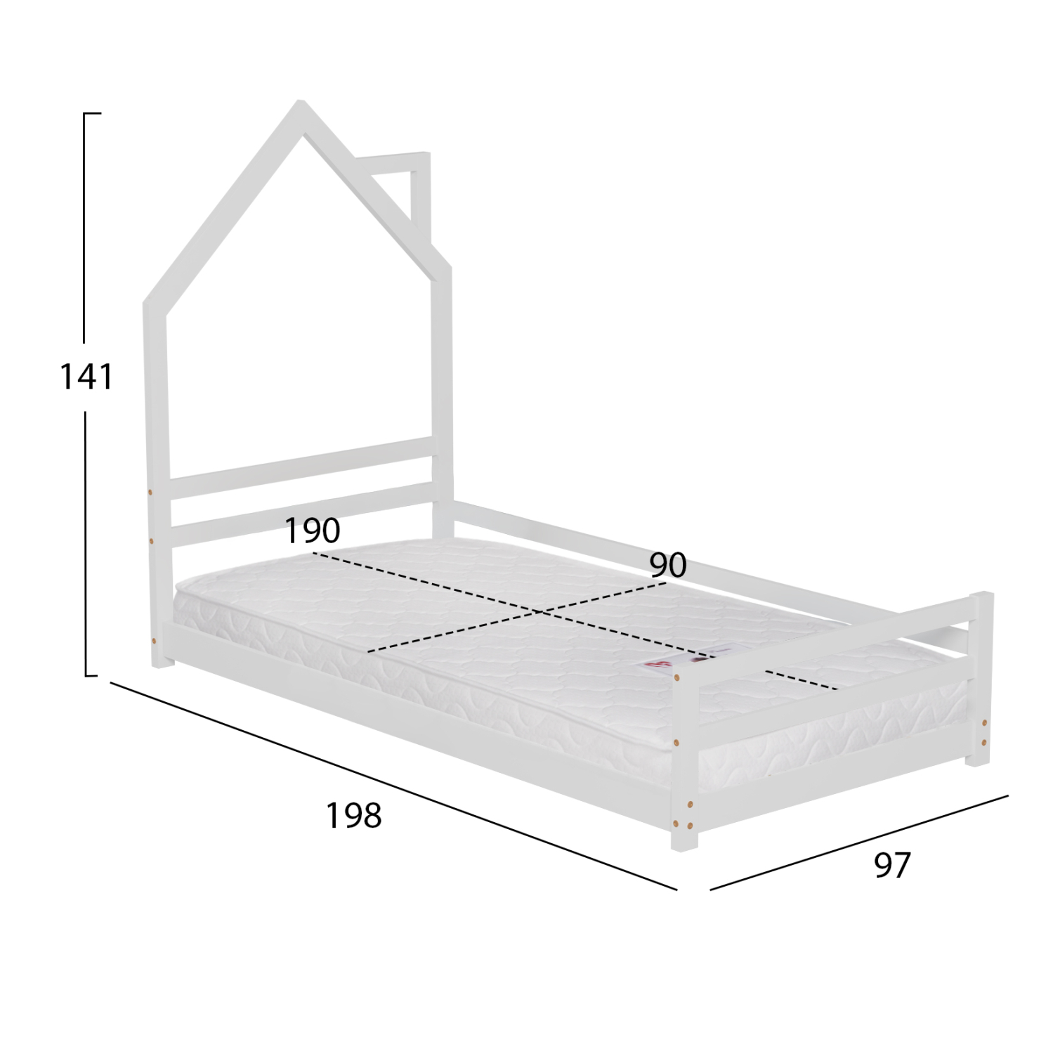 Το παιδικό κρεβάτι HOUSER τύπου Montessori σε διάσταση για στρώμα 90×190εκ, είναι κατασκευασμένο από ξύλο πεύκου σε ΛΕΥΚΟ χρώμα. Tο κεφαλάρι έχει σχήμα σπιτιού με καμινάδα και τα πόδια είναι εξαιρετικά χαμηλά, ενώ το στρώμα τοποθετείται σε τάβλες από κόντρα-πλακέ ξυλεία.