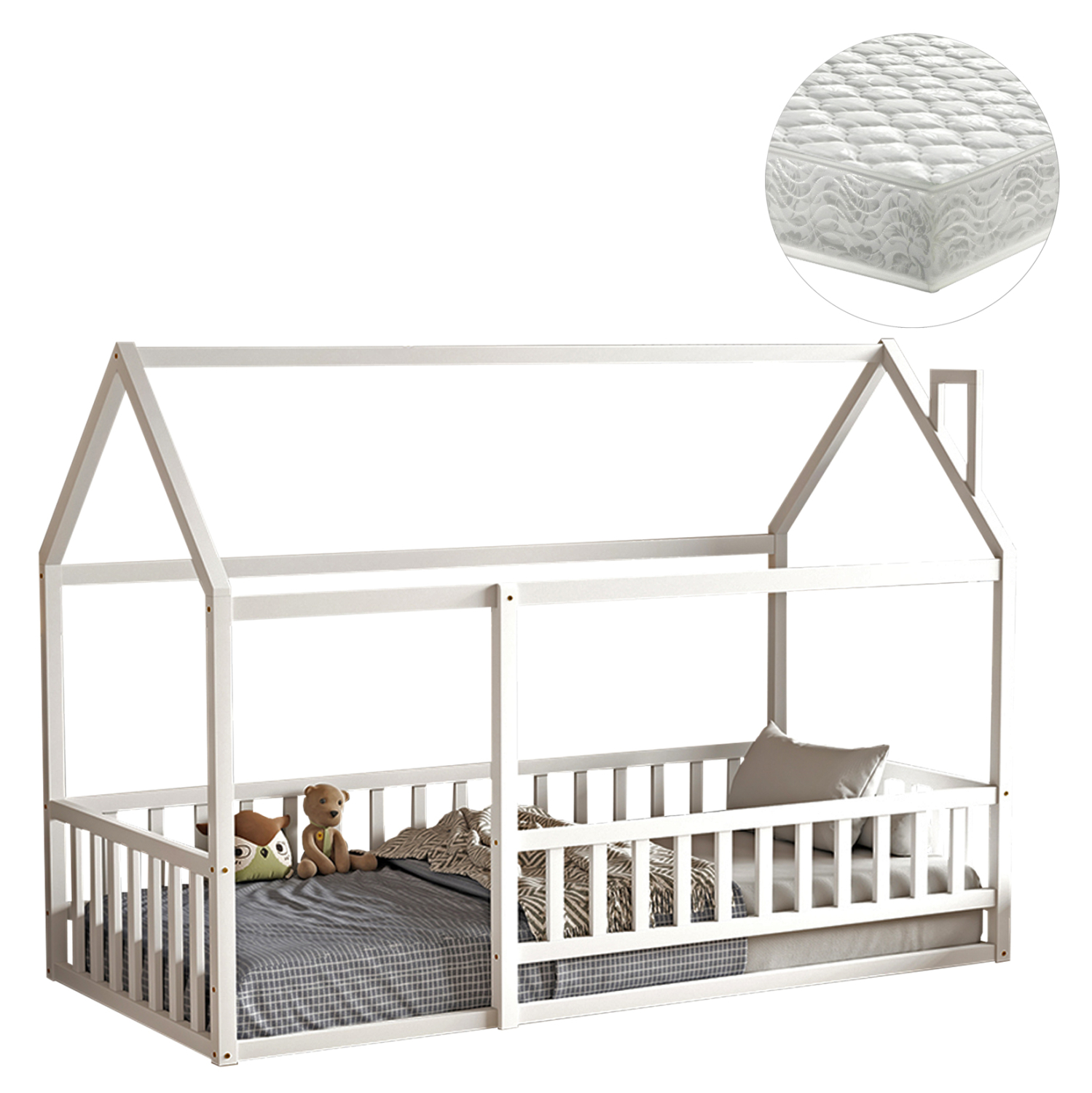 Το παιδικό κρεβάτι HOUSER τύπου Montessori σε διάσταση για στρώμα 90×190εκ, είναι κατασκευασμένο από ξύλο πεύκου σε ΛΕΥΚΟ χρώμα. Όλο το κρεβάτι που πατάει στο πάτωμα έχει σχήμα σπιτιού με καμινάδα και περιμετρικά κάγκελα, ενώ το στρώμα τοποθετείται σε τάβλες από κόντρα-πλακέ ξυλεία.