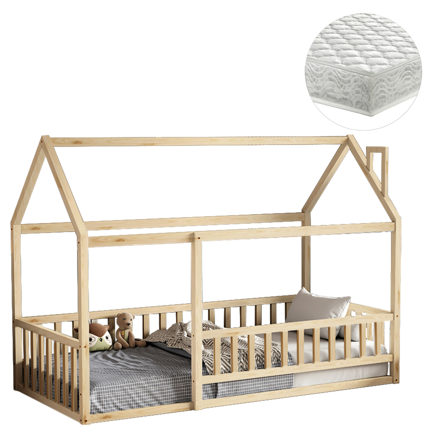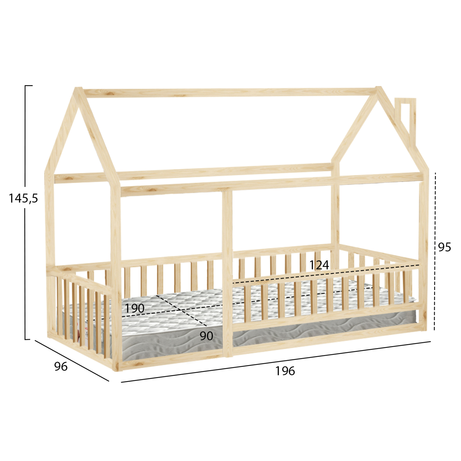 Το παιδικό κρεβάτι HOUSER τύπου Montessori σε διάσταση για στρώμα 90×190εκ, είναι κατασκευασμένο από ξύλο πεύκου σε ΦΥΣΙΚΟ χρώμα. Όλο το κρεβάτι που πατάει στο πάτωμα έχει σχήμα σπιτιού με καμινάδα και περιμετρικά κάγκελα, ενώ το στρώμα τοποθετείται σε τάβλες από κόντρα-πλακέ ξυλεία.