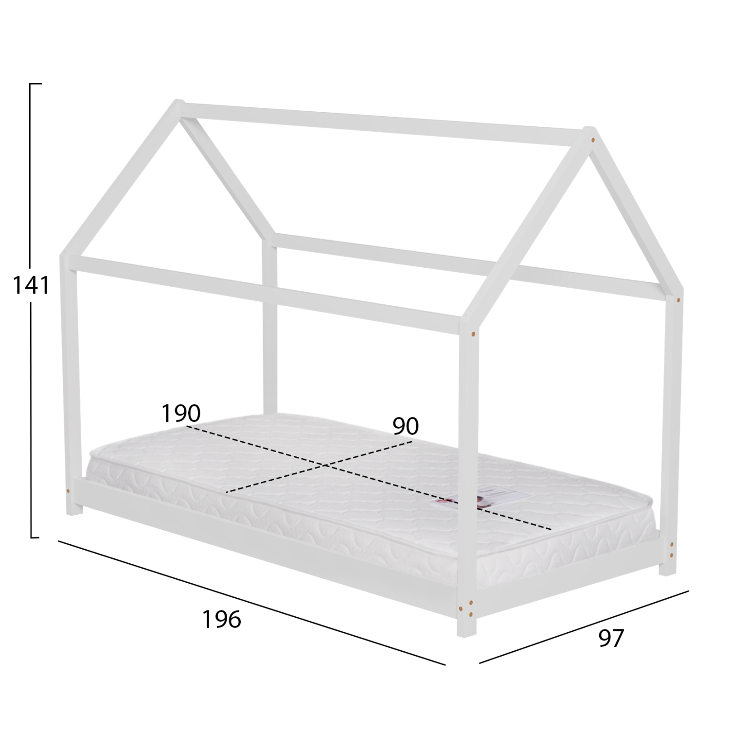 Το παιδικό κρεβάτι PEPE τύπου Montessori σε διάσταση για στρώμα 90×190εκ, είναι κατασκευασμένο από ξύλο πεύκου σε ΛΕΥΚΟ χρώμα. Όλο το κρεβάτι έχει σχήμα σπιτιού με εξαιρετικά χαμηλά πόδια, ενώ το στρώμα τοποθετείται σε τάβλες από κόντρα-πλακέ ξυλεία.