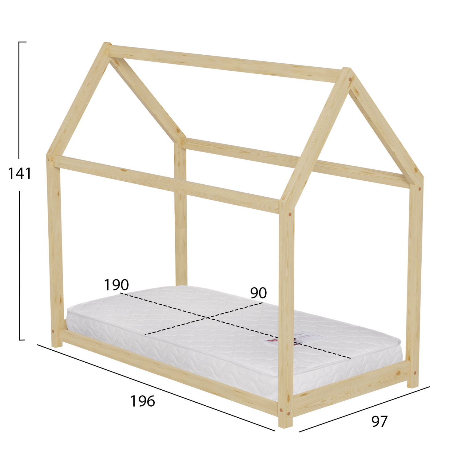 Το παιδικό κρεβάτι PEPE τύπου Montessori σε διάσταση για στρώμα 90×190εκ, είναι κατασκευασμένο από ξύλο πεύκου σε ΦΥΣΙΚΟ χρώμα. Όλο το κρεβάτι έχει σχήμα σπιτιού με εξαιρετικά χαμηλά πόδια, ενώ το στρώμα τοποθετείται σε τάβλες από κόντρα-πλακέ ξυλεία.