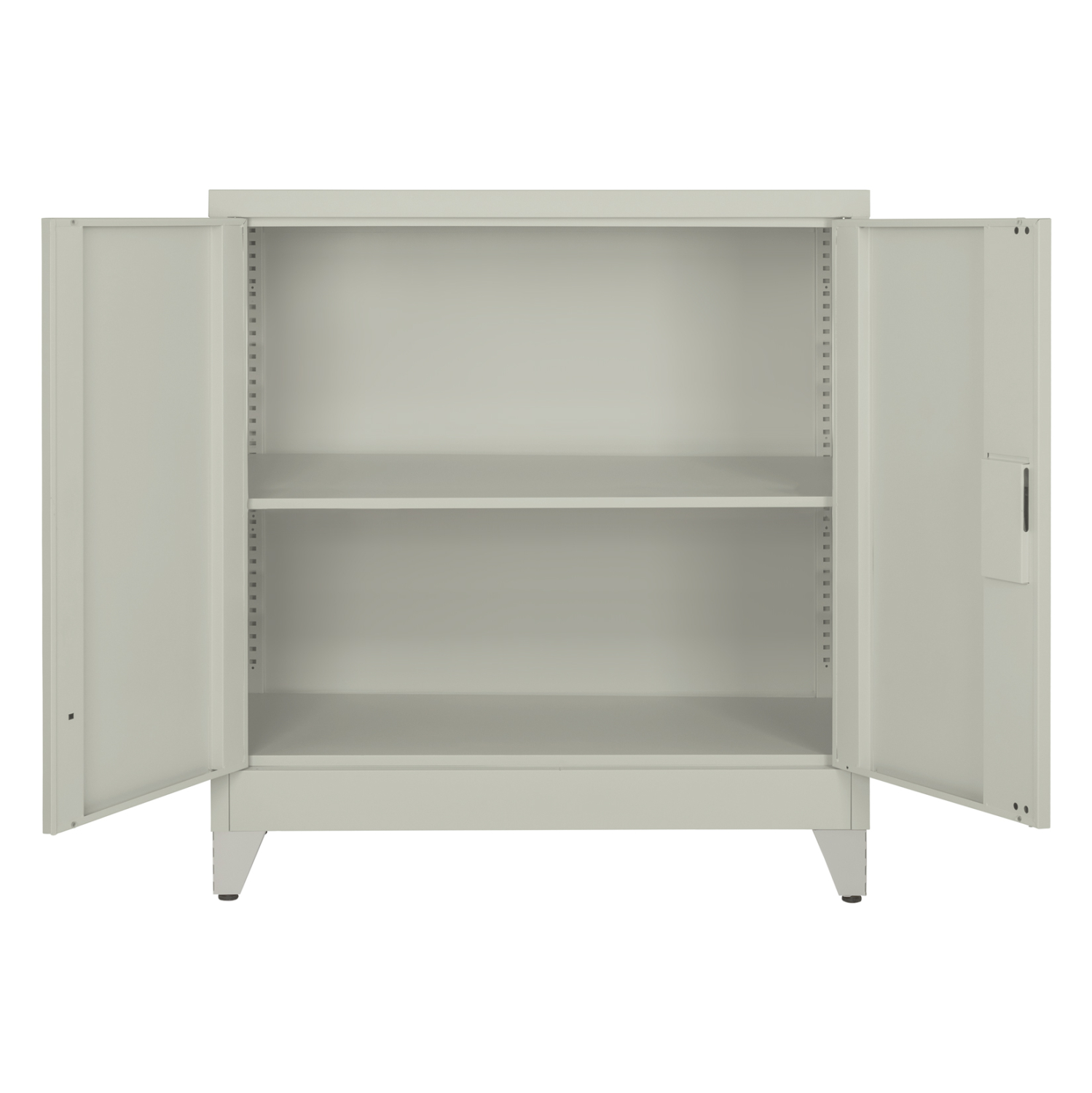 Η DURON είναι μια πρακτικότατη κοντή μεταλλική ντουλάπα με πόδια, που έχει φτιαχτεί με γνώμονα την χωρητικότητα για το μέγεθός της και την ανθεκτικότητα. Είναι δίφυλλη με τις δύο πόρτες να κλείνουν ακριβώς στην μέση της κατασκευής, ενώ το εσωτερικό είναι ένας ενιαίος χώρος χωρίς κάθετα χωρίσματα. Διαθέτει 1 ράφι που δημιουργεί 2 αποθηκευτικούς χώρους. Οι πόρτες διαθέτουν κλειδαριά που κλειδώνει με κλειδί, ενώ το χρώμα της ντουλάπας είναι πολύ ανοιχτό γκρι.
