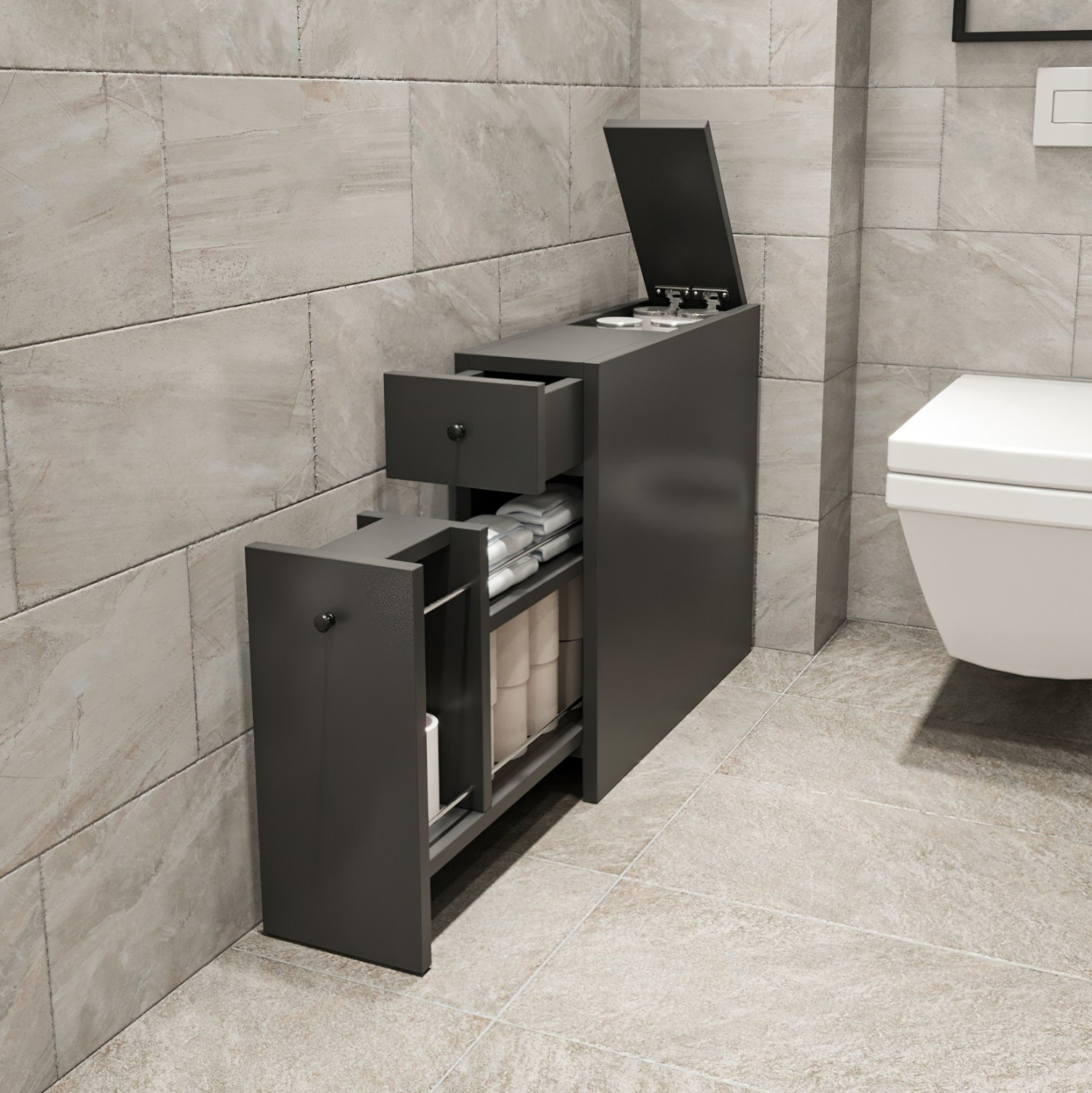 ΗΜ9424.01- Ντουλάπι πολλαπλών χρήσεων—-Σας παρουσιάζουμε το καινούριο έπιπλο για τον χώρο του μπάνιου σε όμορφο ανθρακί χρώμα. Είναι ένα μονοκόμματο έπιπλο στενό και κοντό, με ένα συρτάρι ψηλό και βαθύ στο κάτω μέρος και ένα συρτάρι μικρό από πάνω. Επίσης, διαθέτει κι έναν αποθηκευτικό χώρο πίσω από το μικρό συρτάρι που ανοίγει από πάνω με πορτάκι. Πρόκειται για ένα πρακτικό έπιπλο που θα σας λύσει τα χέρια τόσο με τους αποθηκευτικούς χώρους που διαθέτει, όσο και με τις βολικές του διαστάσεις.