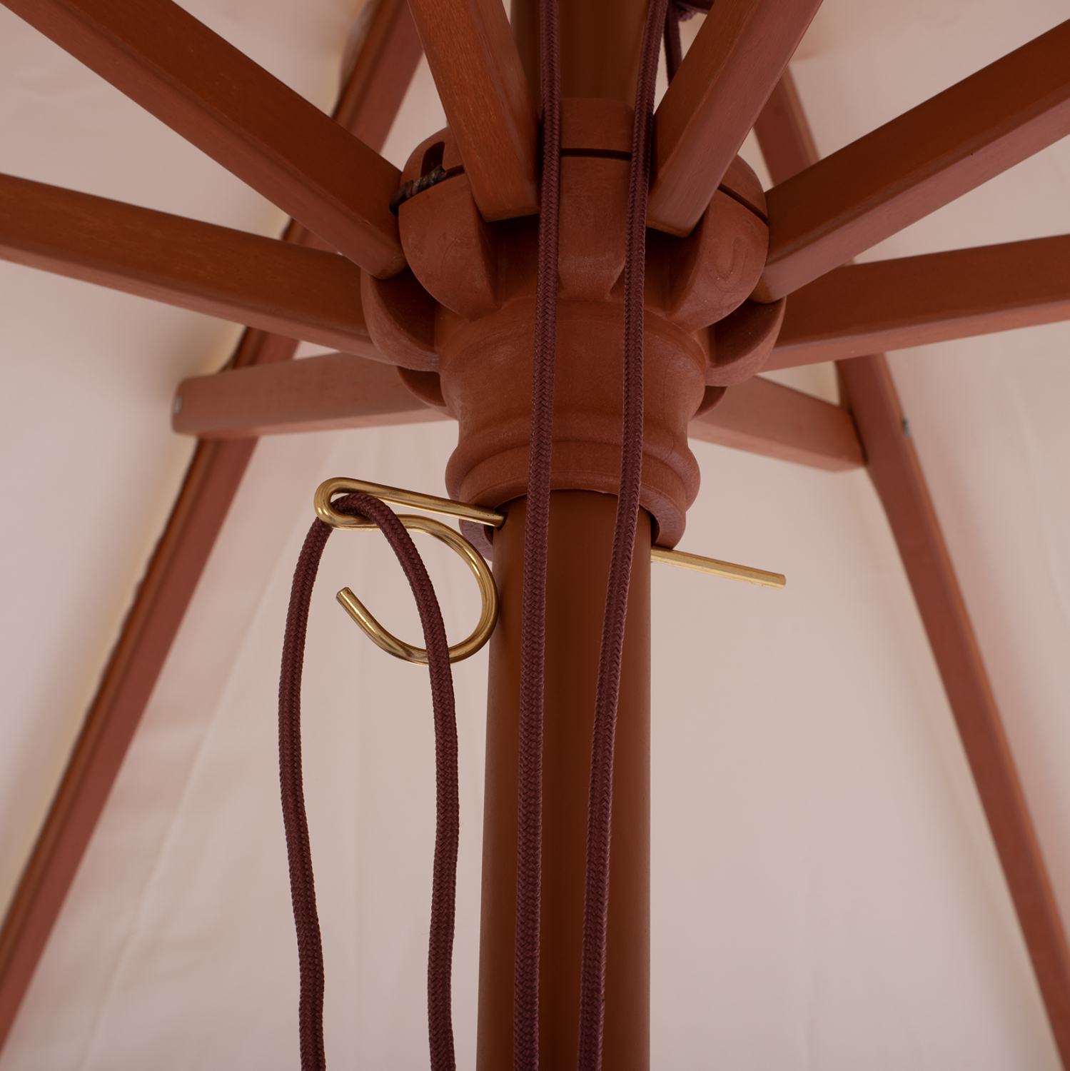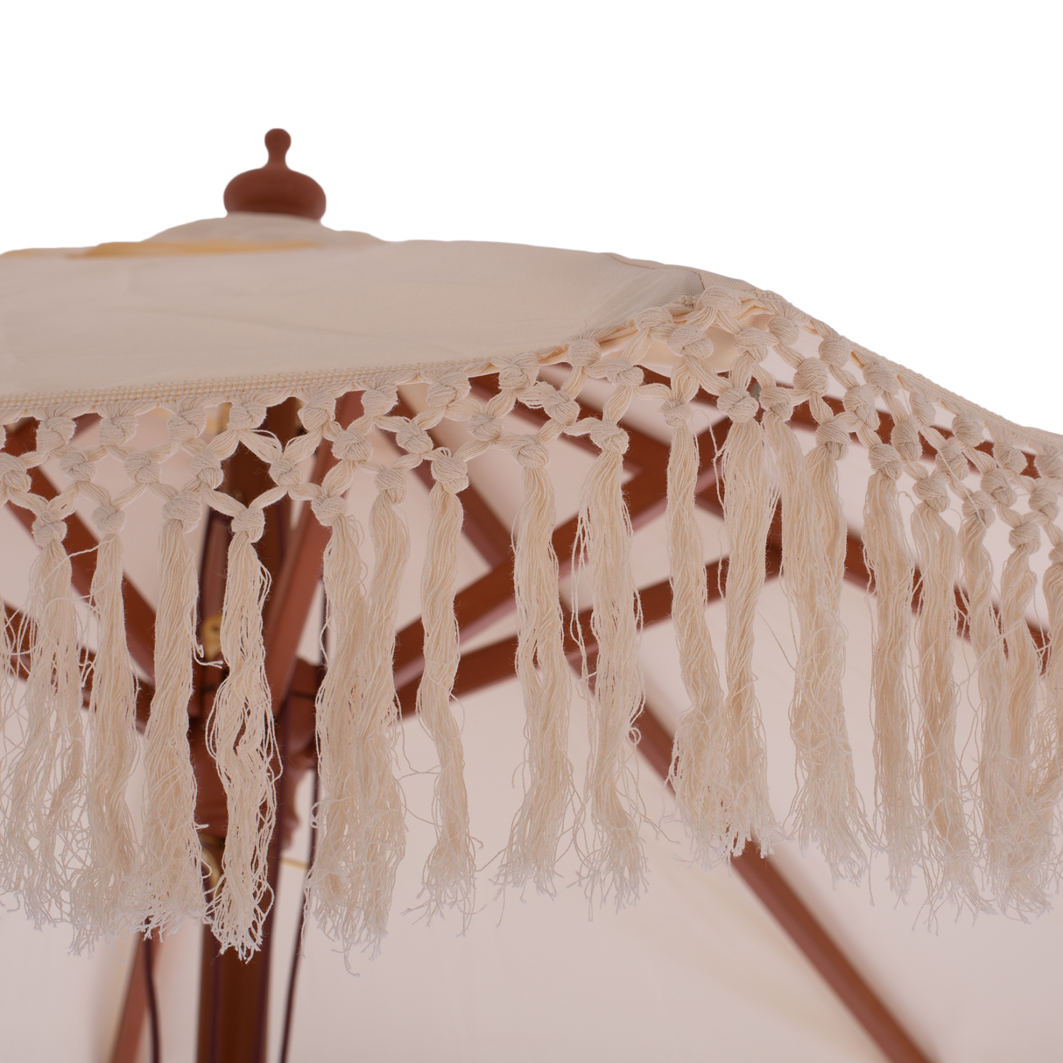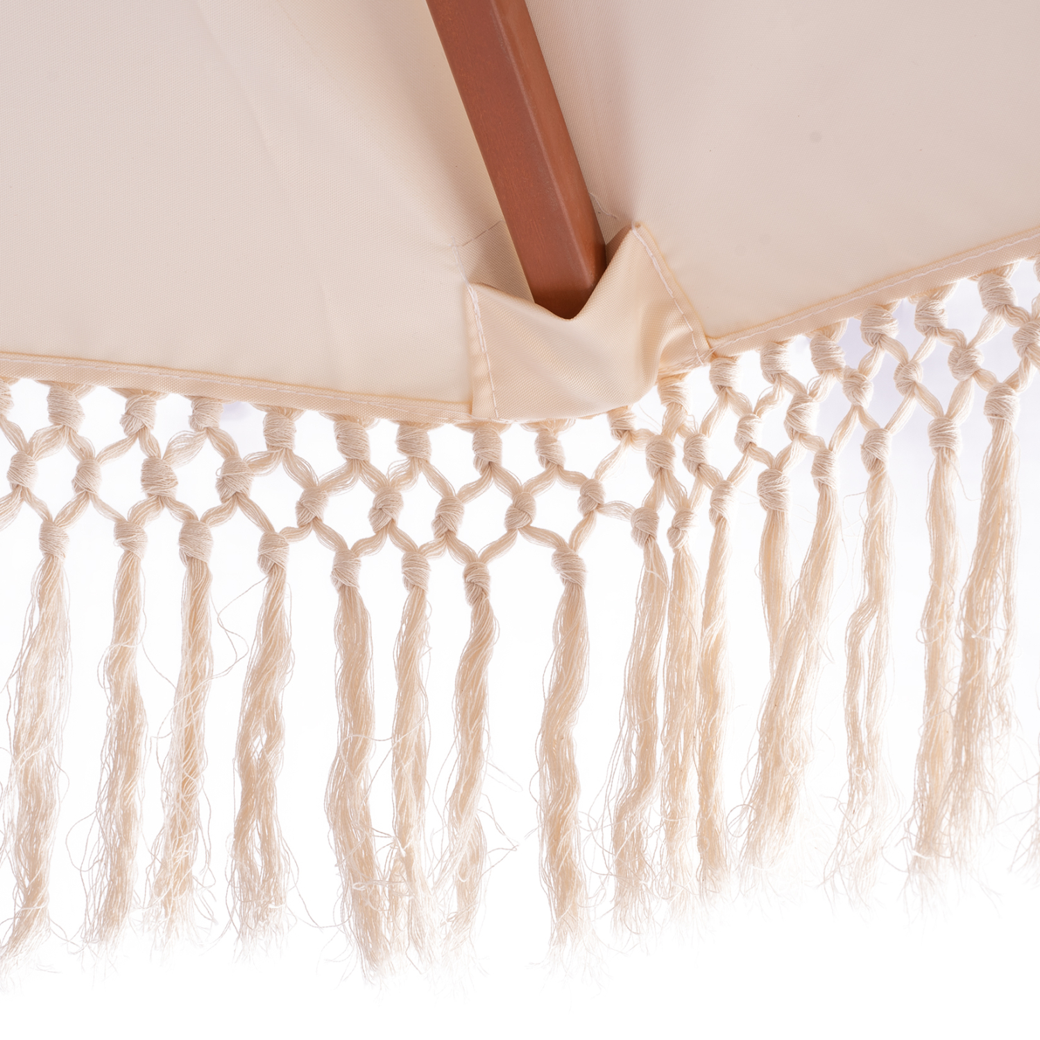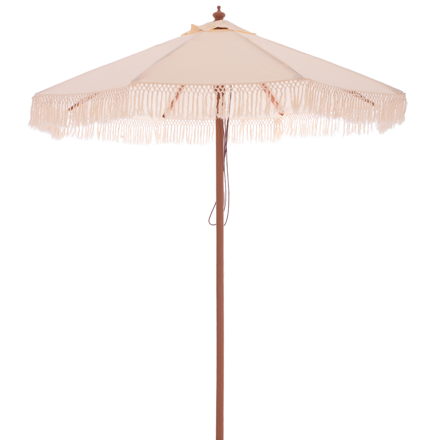 Ομπρέλα Φ2,25μ. με ξύλινο σκελετό, 8 ακτίνες και διπλή τροχαλία, με κρόσια ΜΑΚΡΑΜΕ, σε μπεζ απόχρωση.