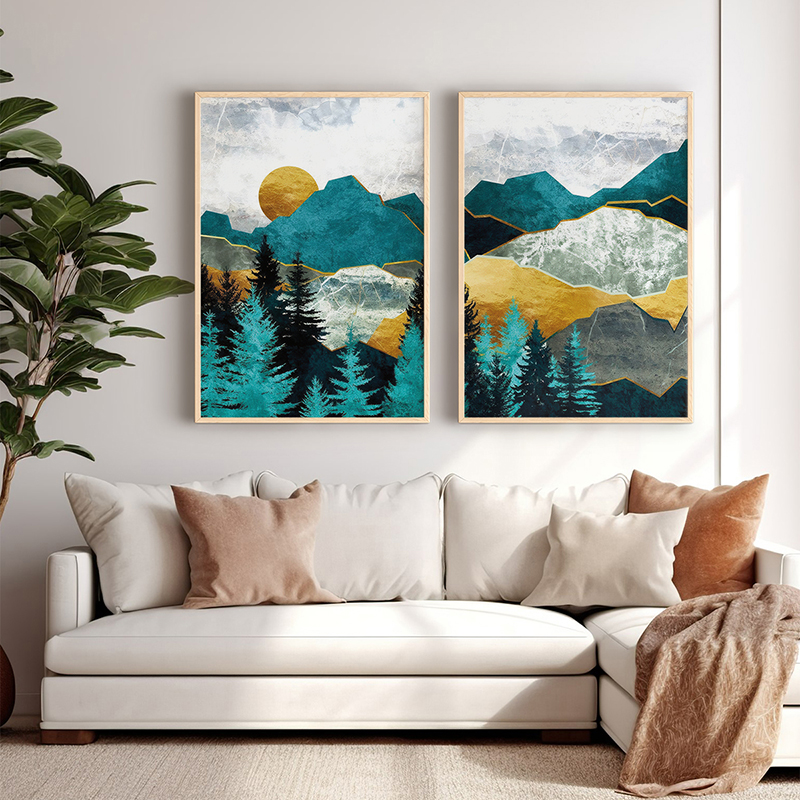 Αναζητήστε την τέχνη που αποπνέει έντονη προσωπικότητα και πολυτελή αισθητική. Το δίπτυχο Lovas είναι μία δραματική αισθητική δήλωση που αναπαριστά ένα αφηρημένο, γεωμετρικό ορεινό τοπίο, όπου ο χρυσός ήλιος συναντά το βαθύ τιρκουάζ της θάλασσας ή του δάσους. Κάθε φορά που το βλέμμα σας εστιάζει στις έντονες αντιθέσεις και τις καθαρές γραμμές, νιώθετε μια αίσθηση δύναμης, ανανέωσης και υψηλής αισθητικής. Το έργο συμβολίζει την ισορροπία των αντιθέσεων, την αρχοντιά και τη διακριτική γοητεία του μοντέρνου design.