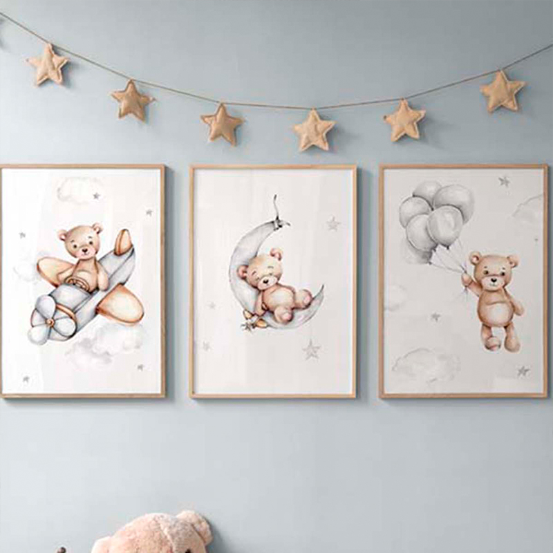 Ανακαλύψτε το ιδανικό διακοσμητικό για να γεμίσετε το παιδικό δωμάτιο με ζωή, φαντασία και γλυκύτητα! Αυτό το τριπλό σετ πινάκων δημιουργεί μια ήρεμη και ονειρική ατμόσφαιρα, ιδανική για βρέφη και μικρά παιδιά.
