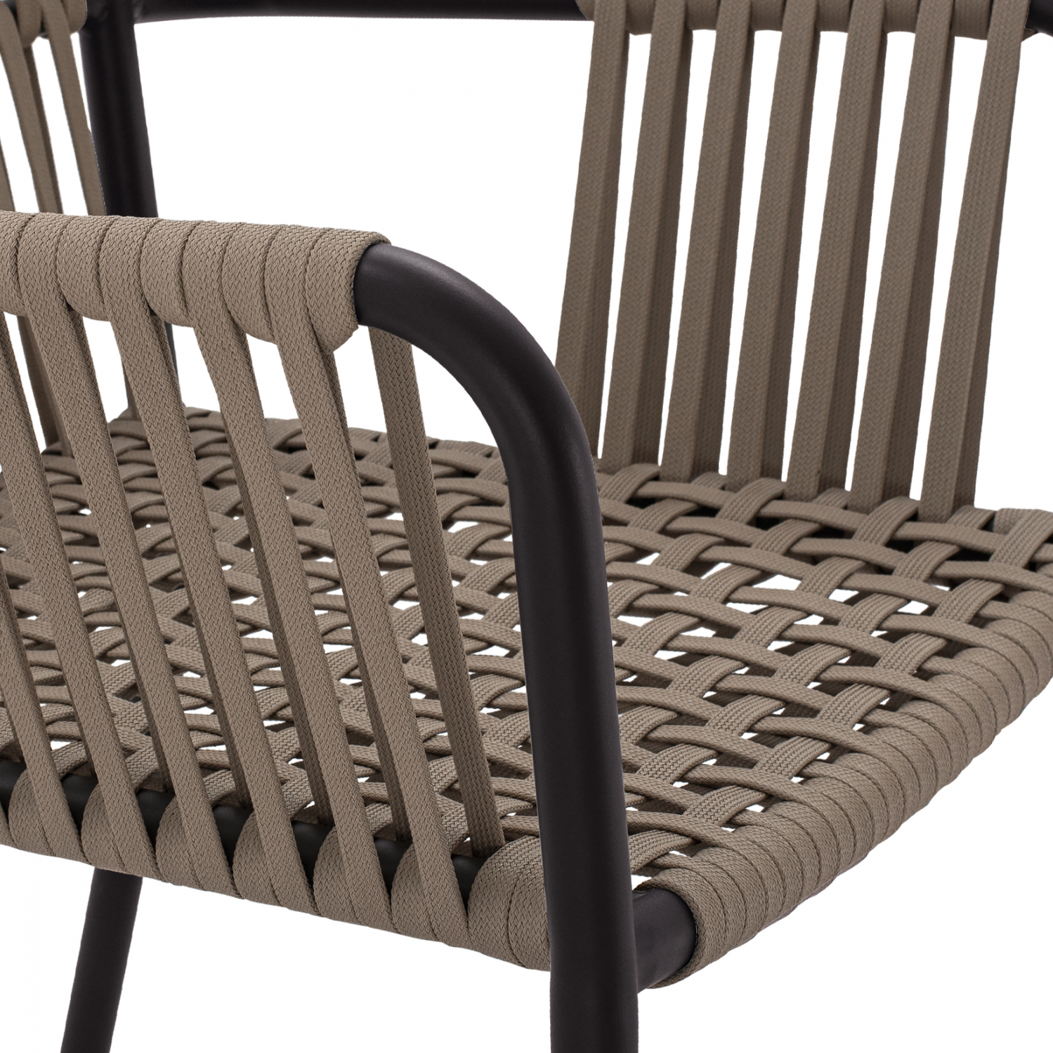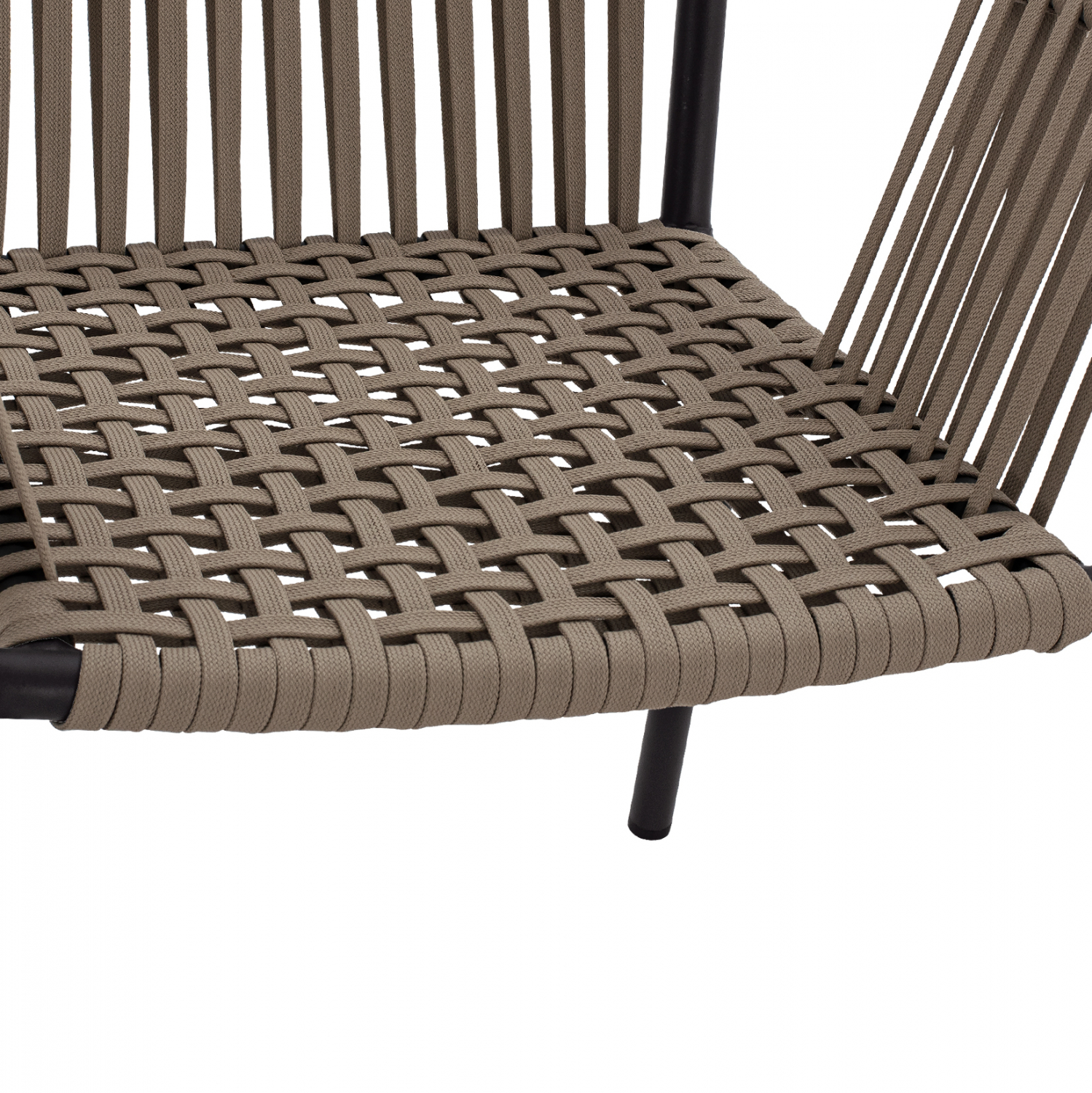 Μοντέρνο πολυθρόνα, κατασκευασμένη από σκελετό αλουμινίου σε ανθρακί απόχρωση, επενδυμένη με πλεκτό pe πλατύ κορδόνι στην πλάτη σε καπουτσίνο απόχρωση.