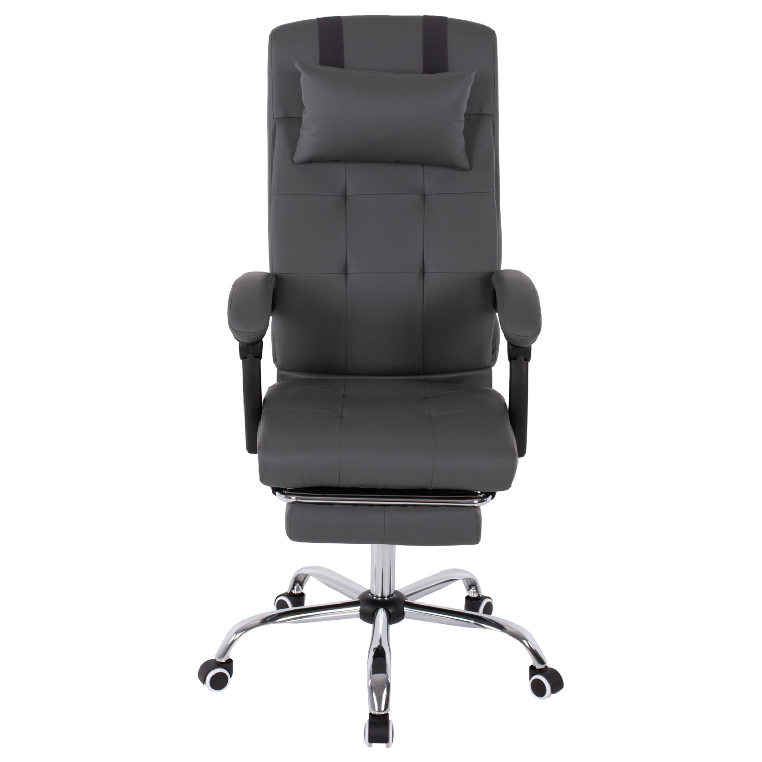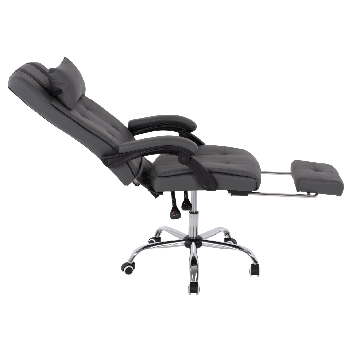 ΗΜ1057.20–Διευθυντική καρέκλα γραφείου σε ΓΚΡΙ χρώμα. Μια «πλούσια» και επιβλητική καρέκλα γραφείου με αναπαυτικά μπράτσα με εργονομική κλίση επενδυμένα με μαξιλαράκια. Η πλάτη είναι πολύ ψηλή ενώ έχει πλούσια στρώση από αφρώδη υλικά και έξτρα μαξιλαράκι στο επάνω μέρος της πλάτης για μεγαλύτερη άνεση κατά την χρήση. Υποστηρίζει ολόκληρο τον κορμό σας, ενώ είναι επενδυμένη με υψηλής ποιότητας PU δέρμα με καπιτονέ τεχνοτροπία, όπως επίσης και το φαρδύ και αναπαυτικό κάθισμα με την εξτρά αναπαυτική επιφάνεια. Η βάση είναι χρωμιωμένη σε σχήμα «αστέρι» με κυρτά πόδια και ασπρόμαυρα ροδάκια. Το χαρακτηριστικό, όμως, που κάνει αυτή την καρέκλα να ξεχωρίζει είναι ότι διαθέτει πτυσσόμενο υποπόδιο, το οποίο σε συνδυασμό με το γεγονός ότι η πλάτη «πέφτει» με μεγάλη κλίση, σας επιτρέπει να ξαπλώνετε και να ξεκουράζεστε όταν το επιθυμείτε!