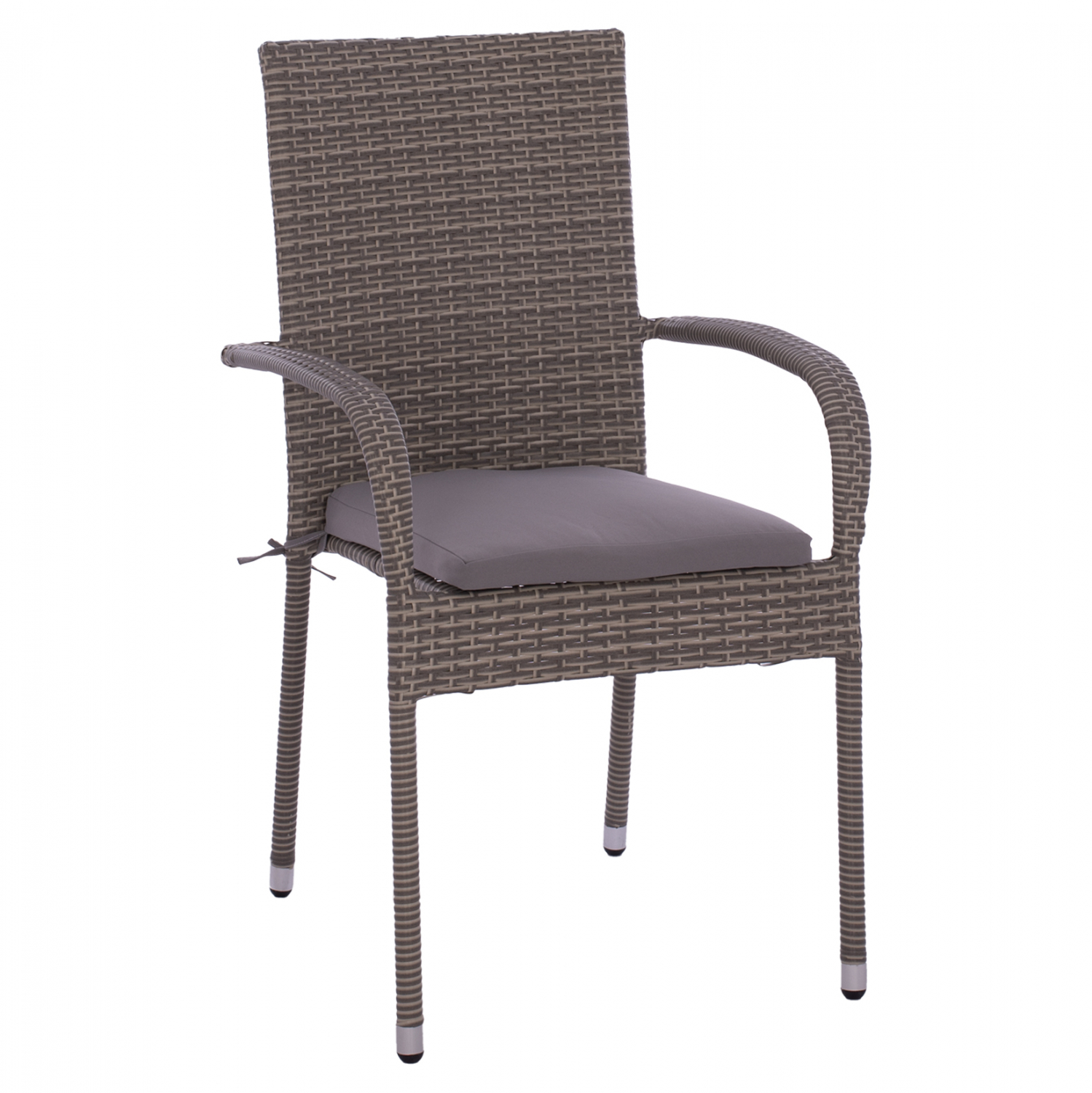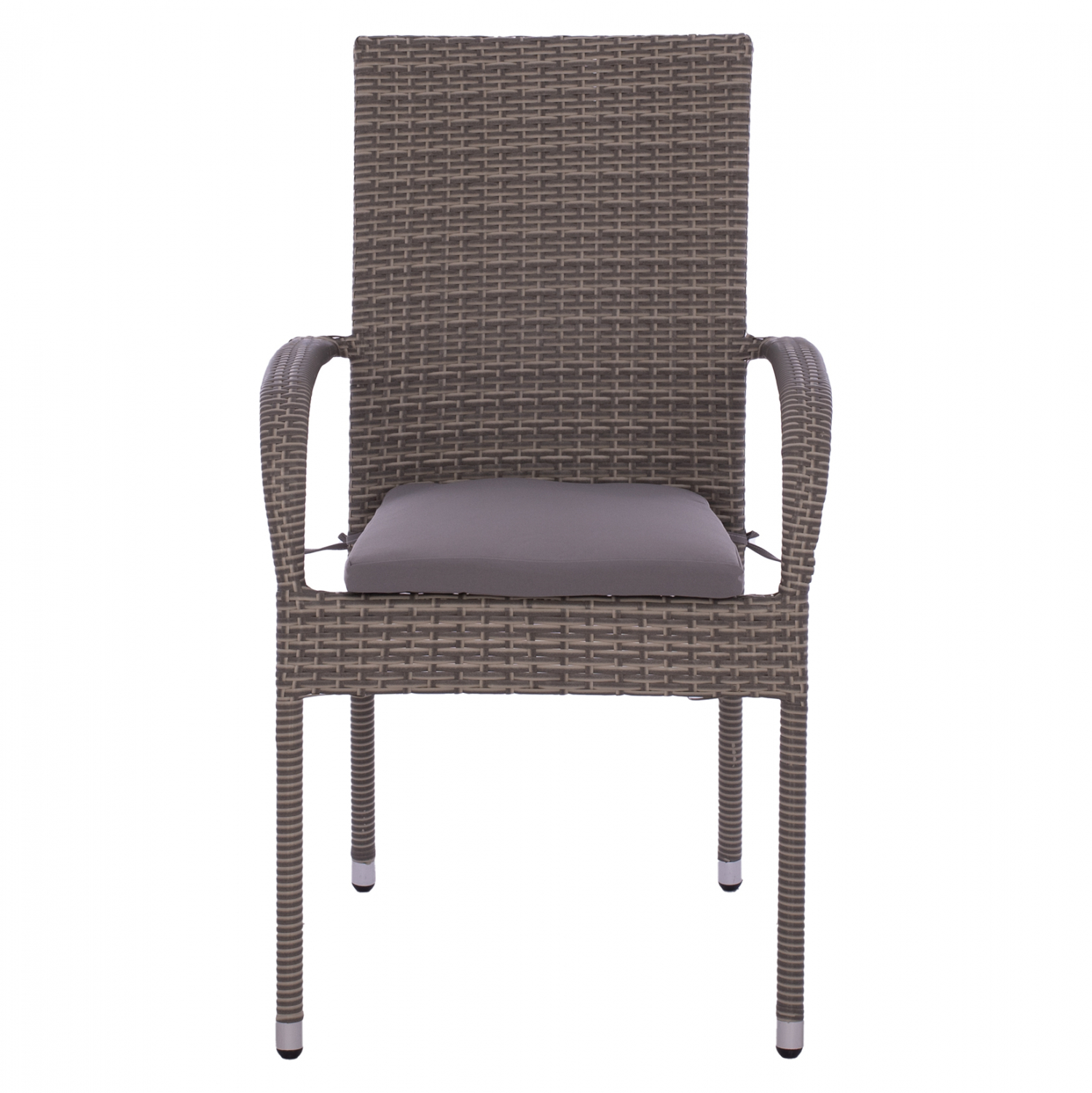 Μοντέρνα πολυθρόνα εξωτερικού χώρου, κατασκευασμένη από μεταλλικό σκελετό και επενδυμένη με πλεκτό wicker σε γκρι απόχρωση και γκρι μαξιλάρι.