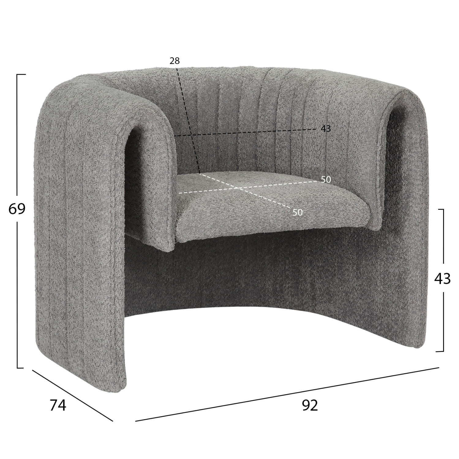 Ο σκελετός της πολυθρόνας είναι μεταλλικός με ηλεκτροστατική βαφή, ενώ ολόκληρη η επένδυση έχει γίνει με μπουκλέ ύφασμα εξαιρετικής ποιότητας και υφής. Μπουκλέ λέγεται οποιοδήποτε ύφασμα που έχει κόμπο-μπούκλα στην ύφανσή του. Κατασκευάζεται από σχεδόν όλες τις πρώτες ύλες (αν και συνήθως είναι συνθετικό) με ειδικές κλωστές με κόμπους ή πολύ στριμμένα νήματα, έτσι ώστε να έχει σγουρή επιφάνεια. Δεν τσαλακώνει και μπορεί να είναι μονόχρωμο, μελανζέ ,καρώ ή τουιντ.