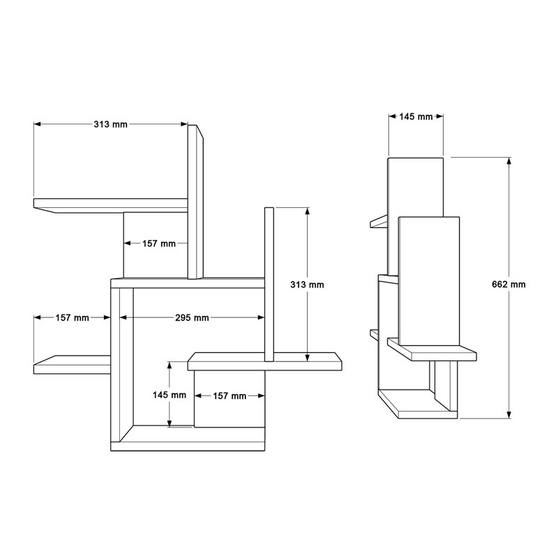 - Τα ράφια είναι τοποθετημένα σε διαφορετικά ύψη και βάθη, προσφέροντας ποικίλες επιλογές για την εμφάνιση διακοσμητικών αντικειμένων, βιβλίων ή φυτών.