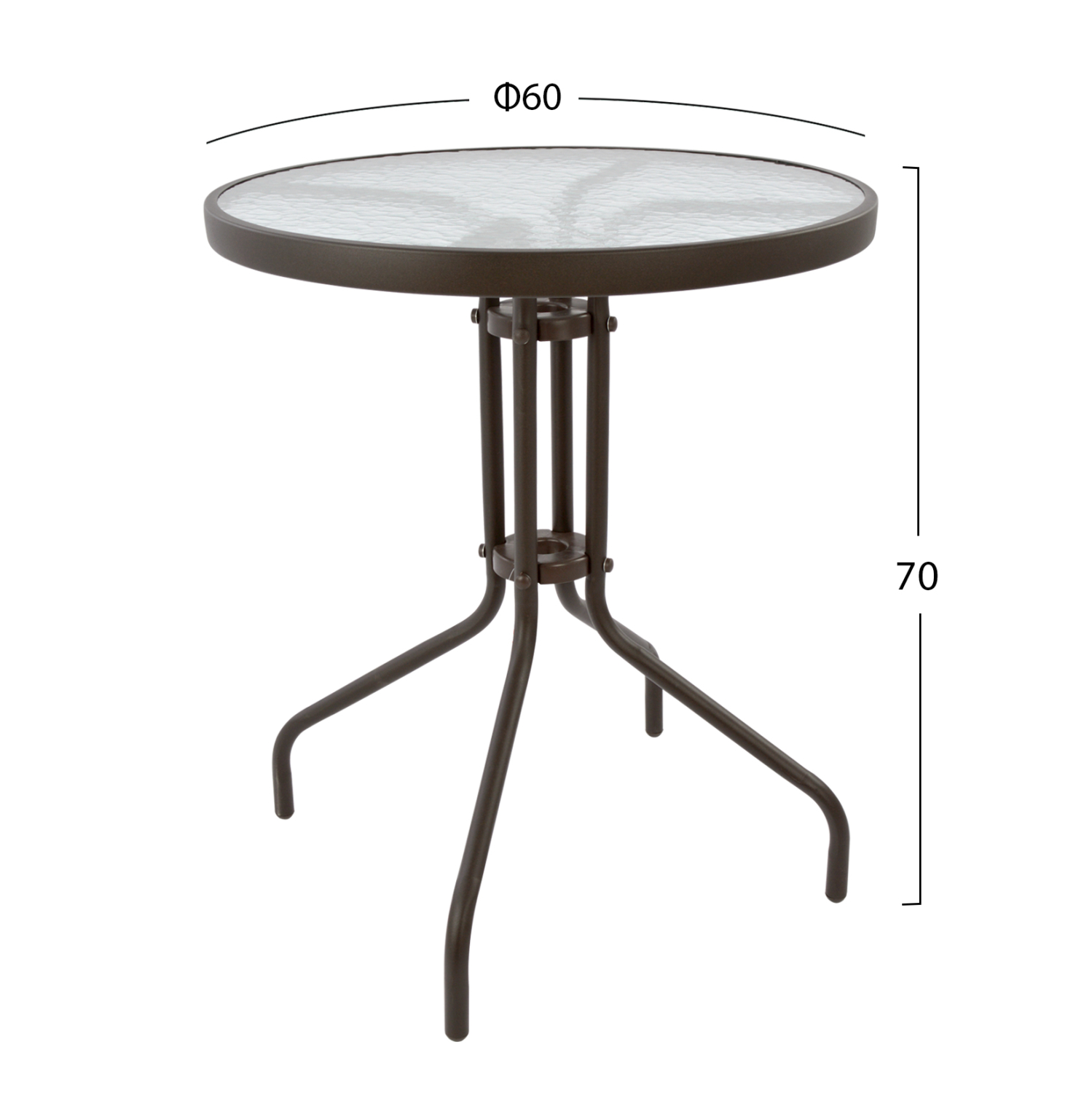 Ένα τραπέζι μεταλλικό εξωτερικού χώρου σε χρώμα καφέ , με ενσωματωμένο τζαμί ασφάλειας (secure).