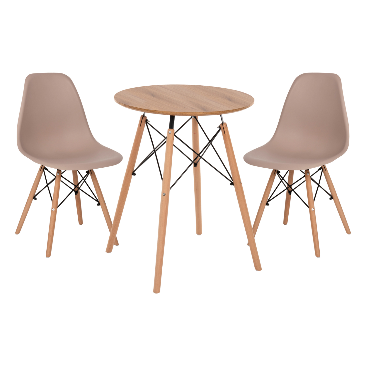 Ένα στρογγυλό τραπέζι με πόδια οξιάς σε ΦΥΣΙΚΟ χρώμα και MDF επιφάνεια σε χρώμα φυσικού ξύλου, και 2 καρέκλες με ενιαία πλάτη και κάθισμα από πολυπροπυλένιο σε ΚΑΠΟΥΤΣΙΝΟ χρώμα και πόδια οξιάς σε φυσικό χρώμα.